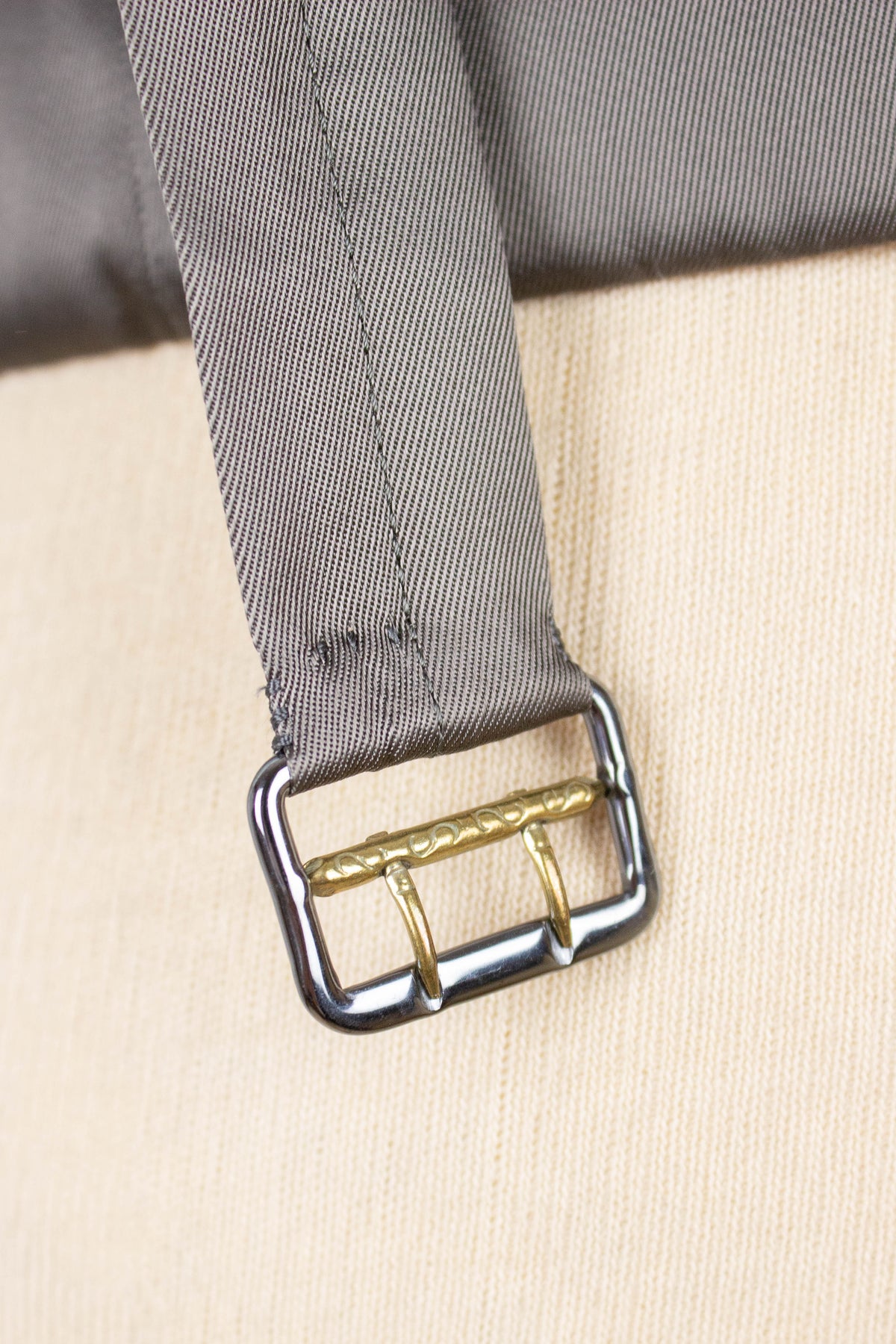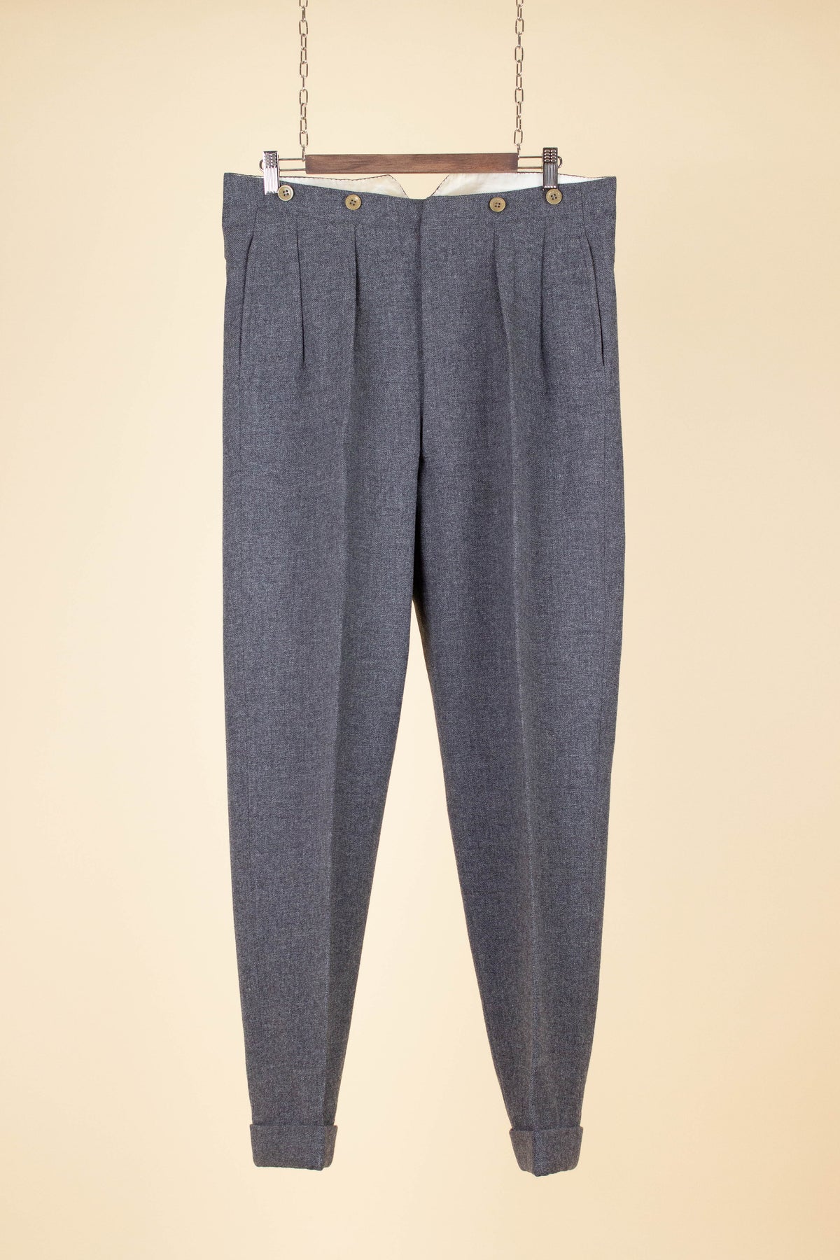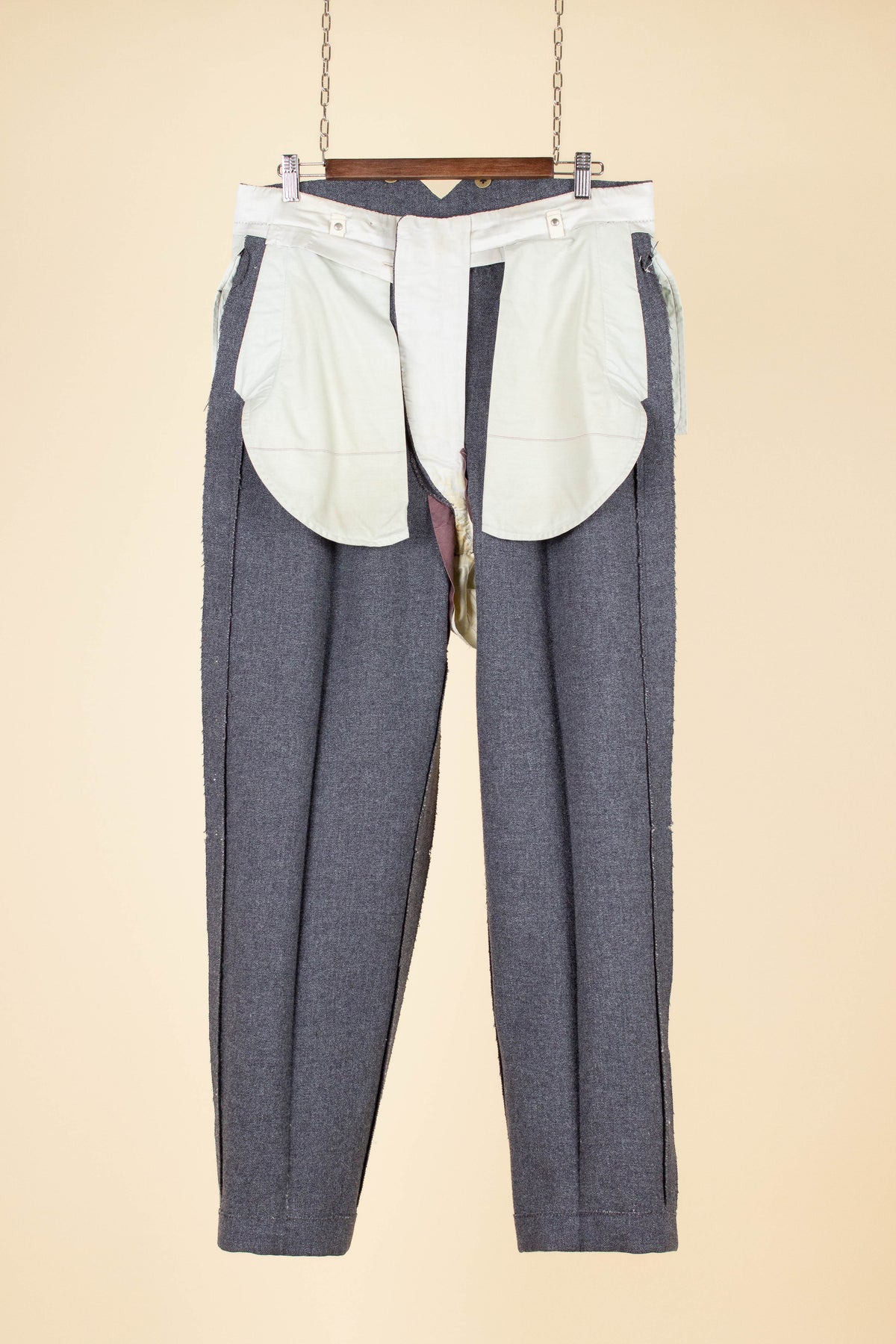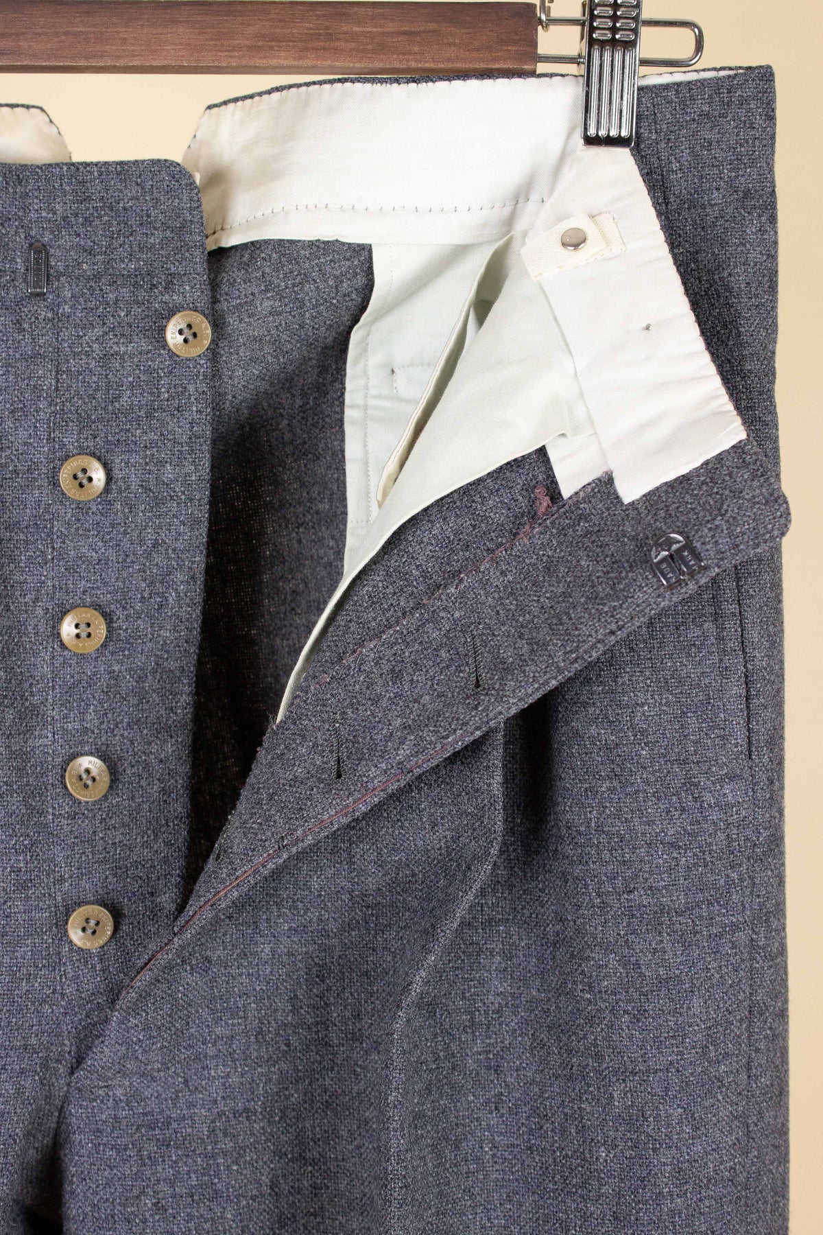 The trousers are high-waisted and conservatively cut, with double pleats, external brace buttons, and a fishtail back. They have a button fly and turn-ups at the hem. At the back, there is one jetted pocket on each side.
