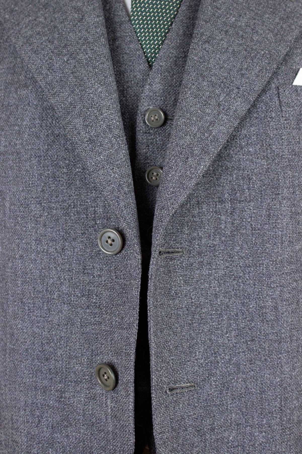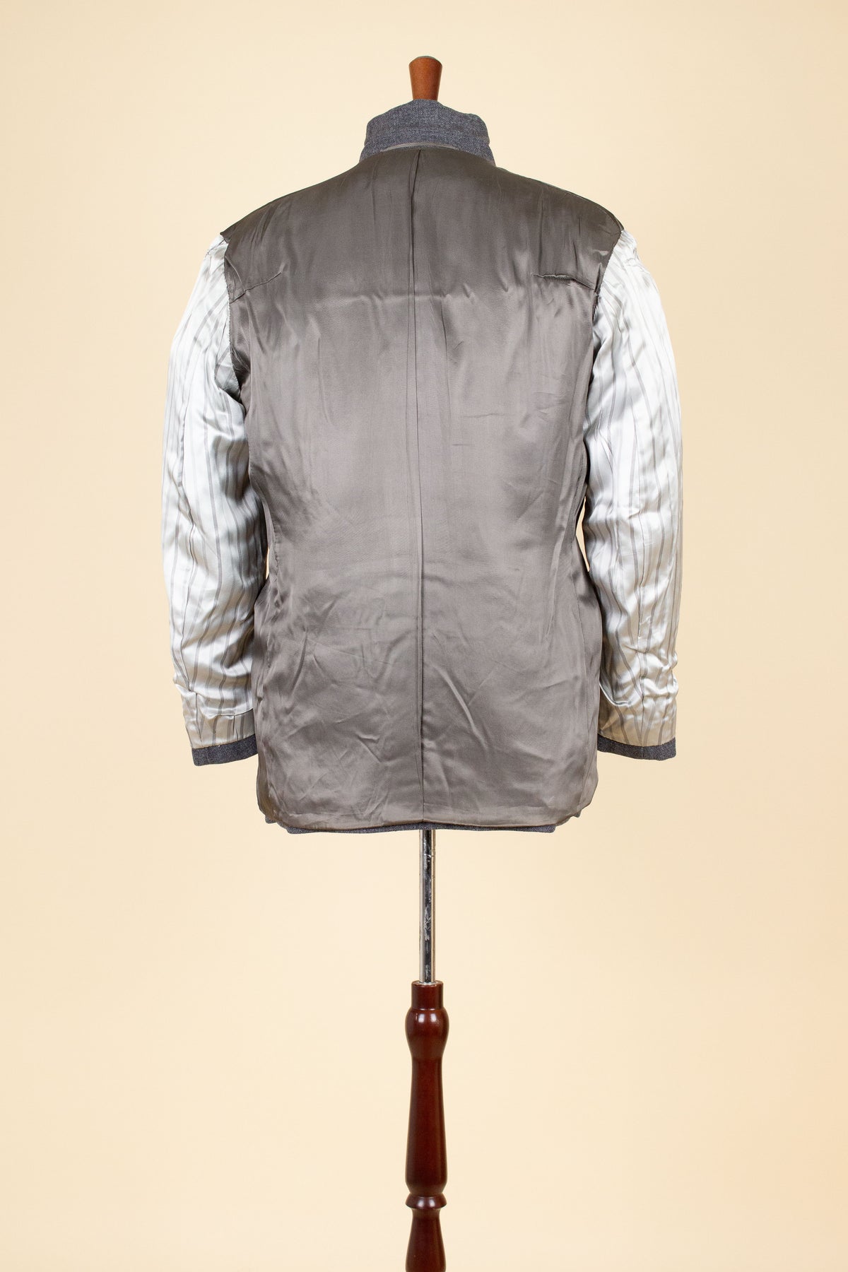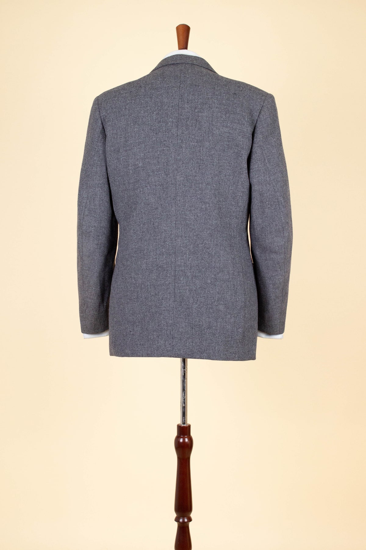The jacket is single-breasted and fastens with three buttons. It features horizontal jetted front pockets and a breast pocket, with a buttonhole on the left lapel. The back is straight with a single vent. Inside, it is fully lined and has two inner pockets, one on each side.