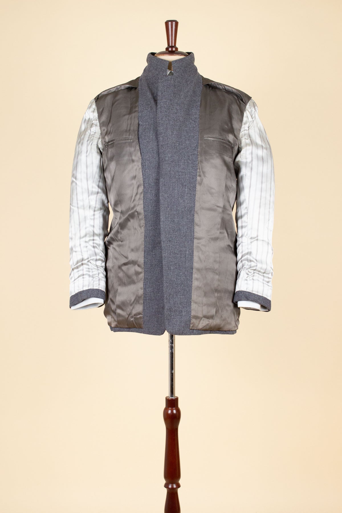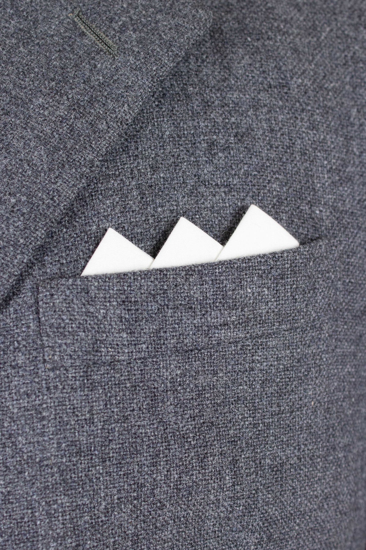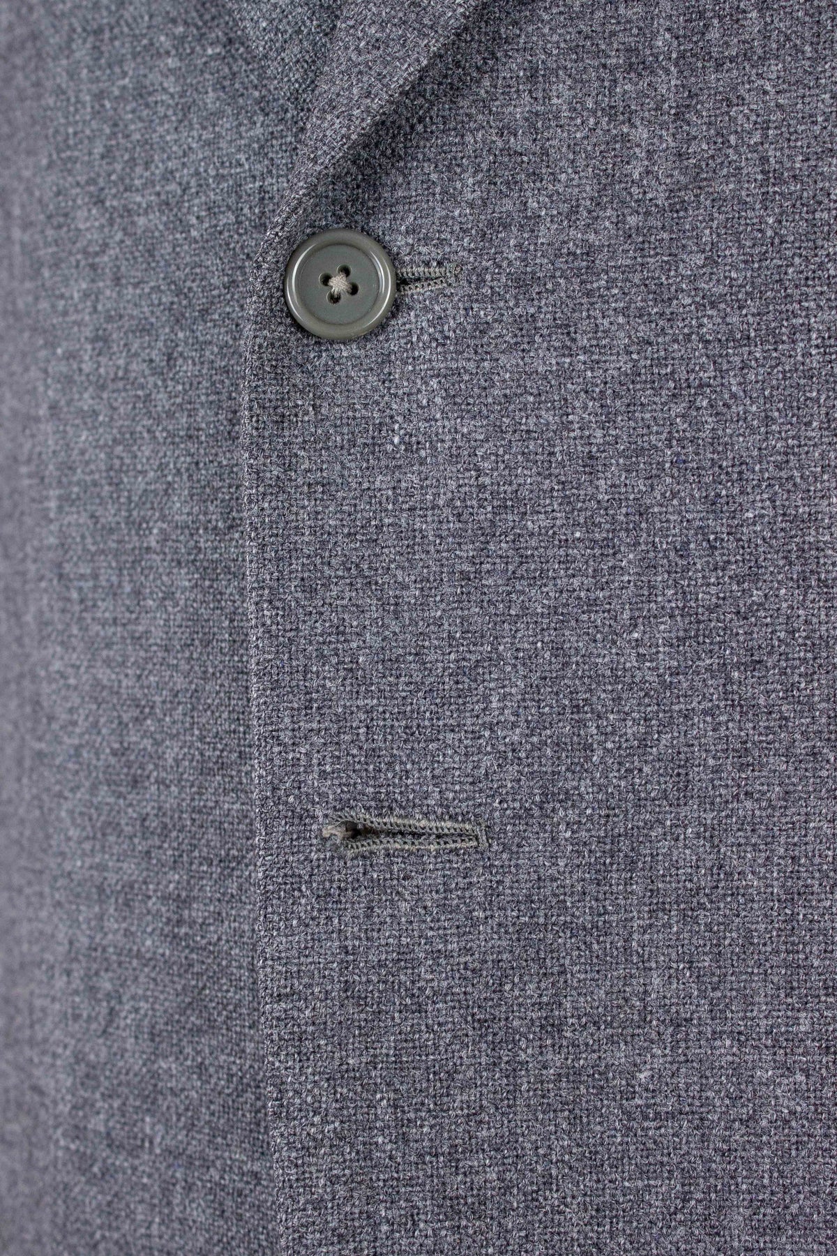 The jacket is single-breasted and fastens with three buttons. It features horizontal jetted front pockets and a breast pocket, with a buttonhole on the left lapel. The back is straight with a single vent. Inside, it is fully lined and has two inner pockets, one on each side.