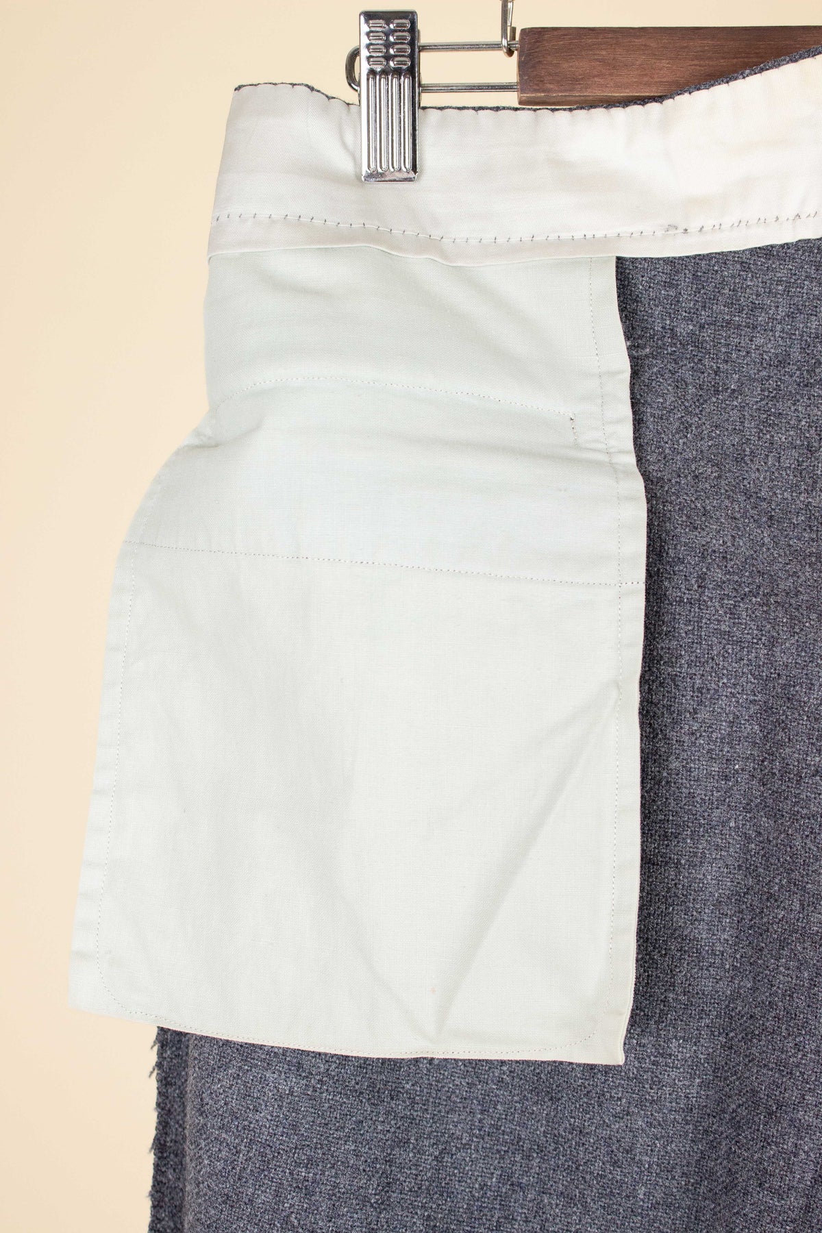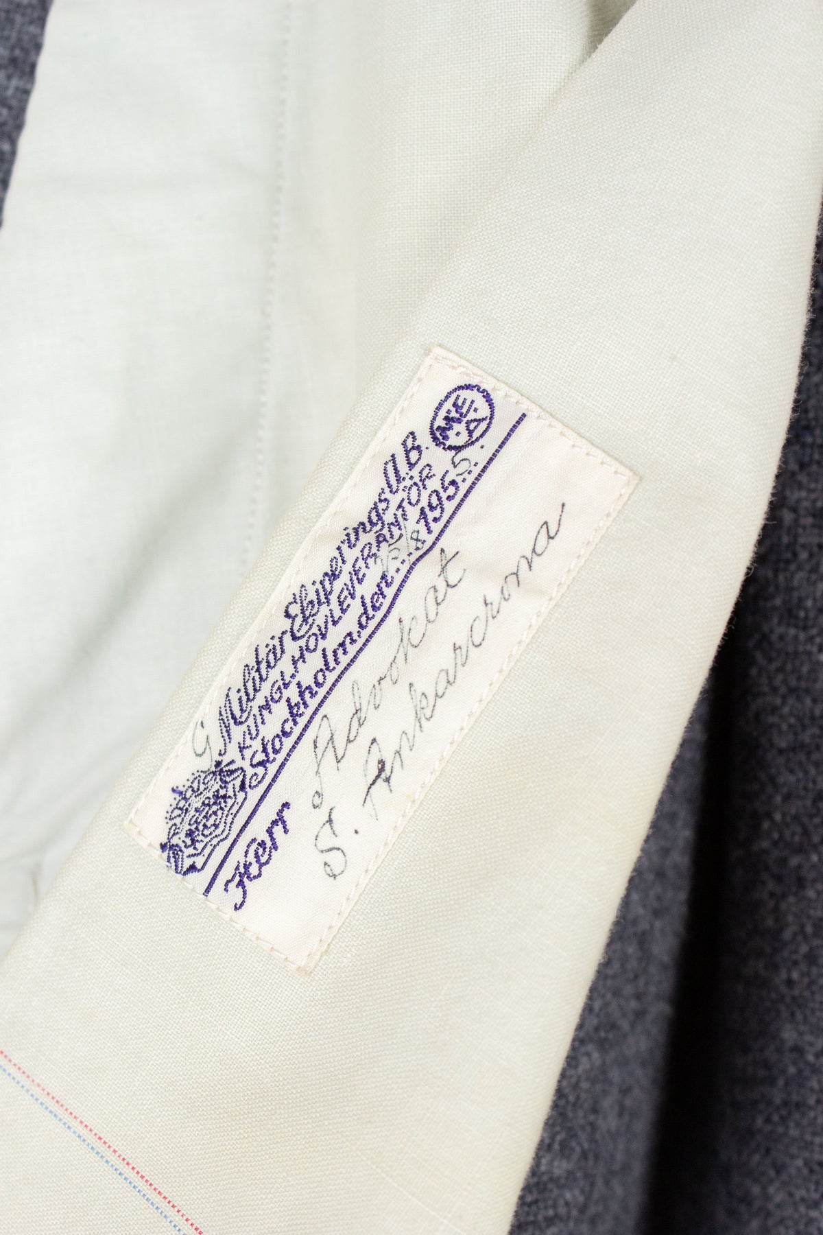 This finely tailored three-piece suit is of Swedish origin, made in 1955 at MEA in Stockholm. MEA — short for MilitärEkiperingsAktiebolaget — was a classic department store in Stockholm and a well-known part of the cityscape until it went bankrupt in the mid-1980s. The suit is made from a grey mélange wool fabric of slightly heavier weight.