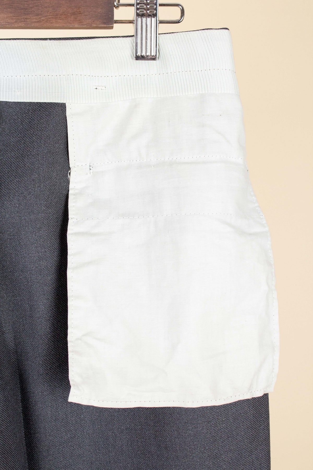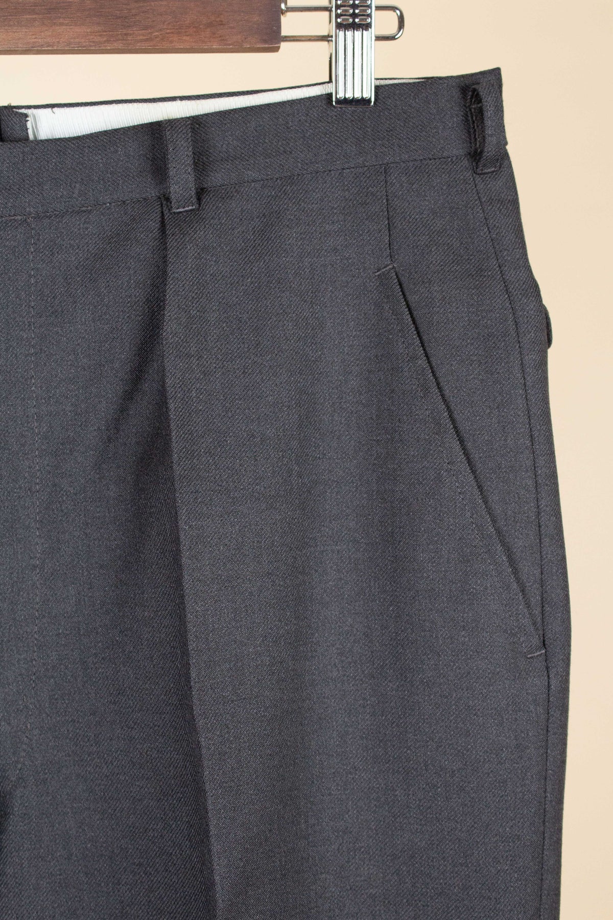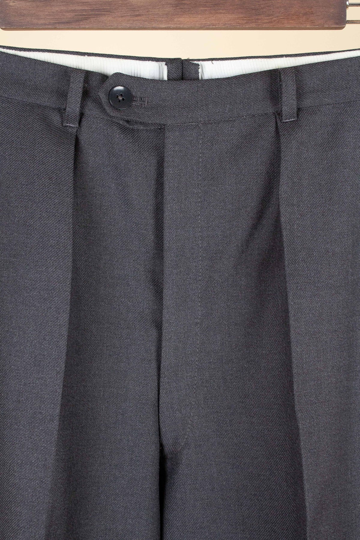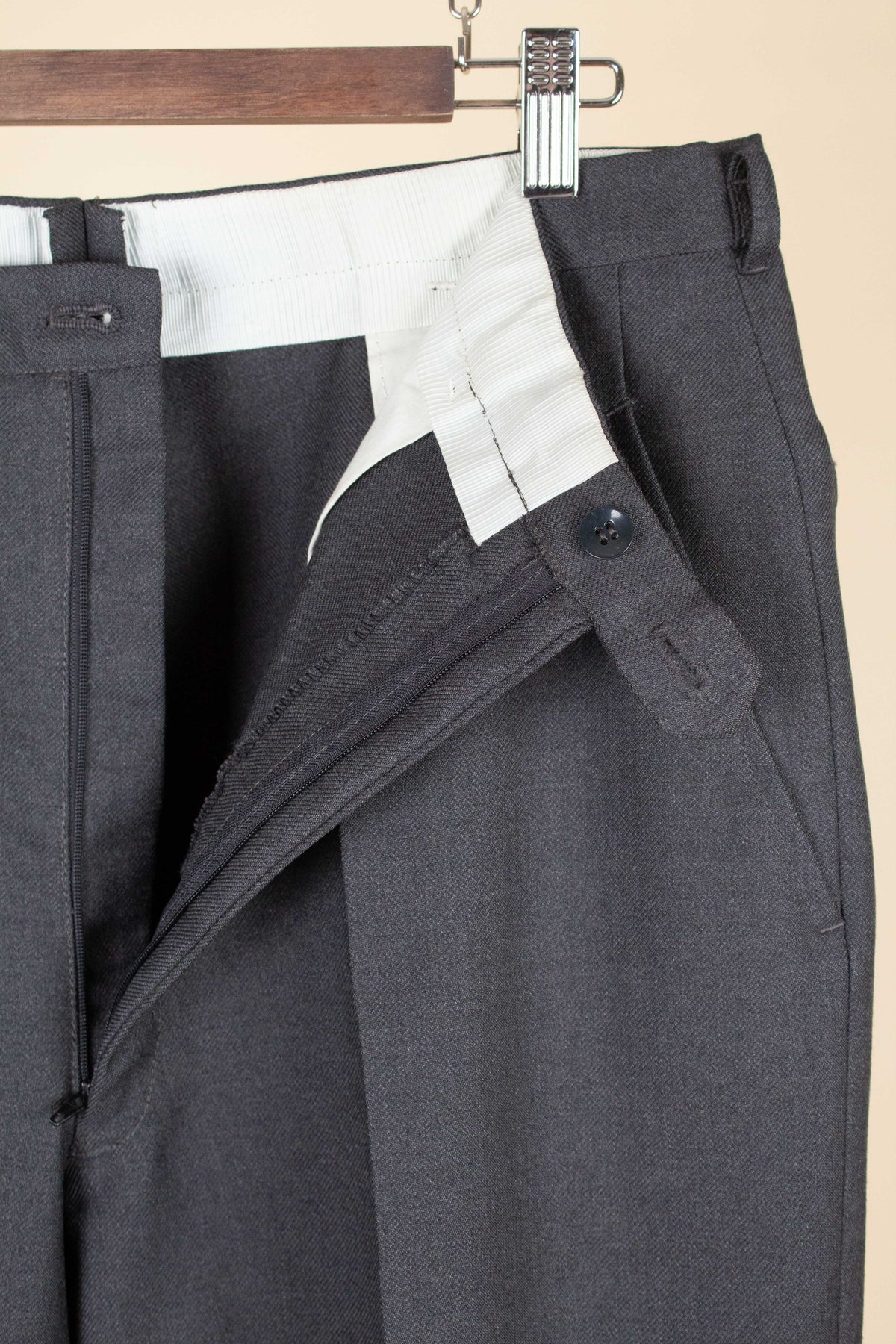 These trousers have no label, but it is still possible to draw certain conclusions from examining them. They are almost certainly of Swedish origin, most likely made sometime during the second half of the 1950s, although they may also be a few years younger. They were most probably originally part of a suit, but they also work very well as separate trousers. In colour they are mid-grey. They are made from a grey wool fabric with a subtle twill structure.