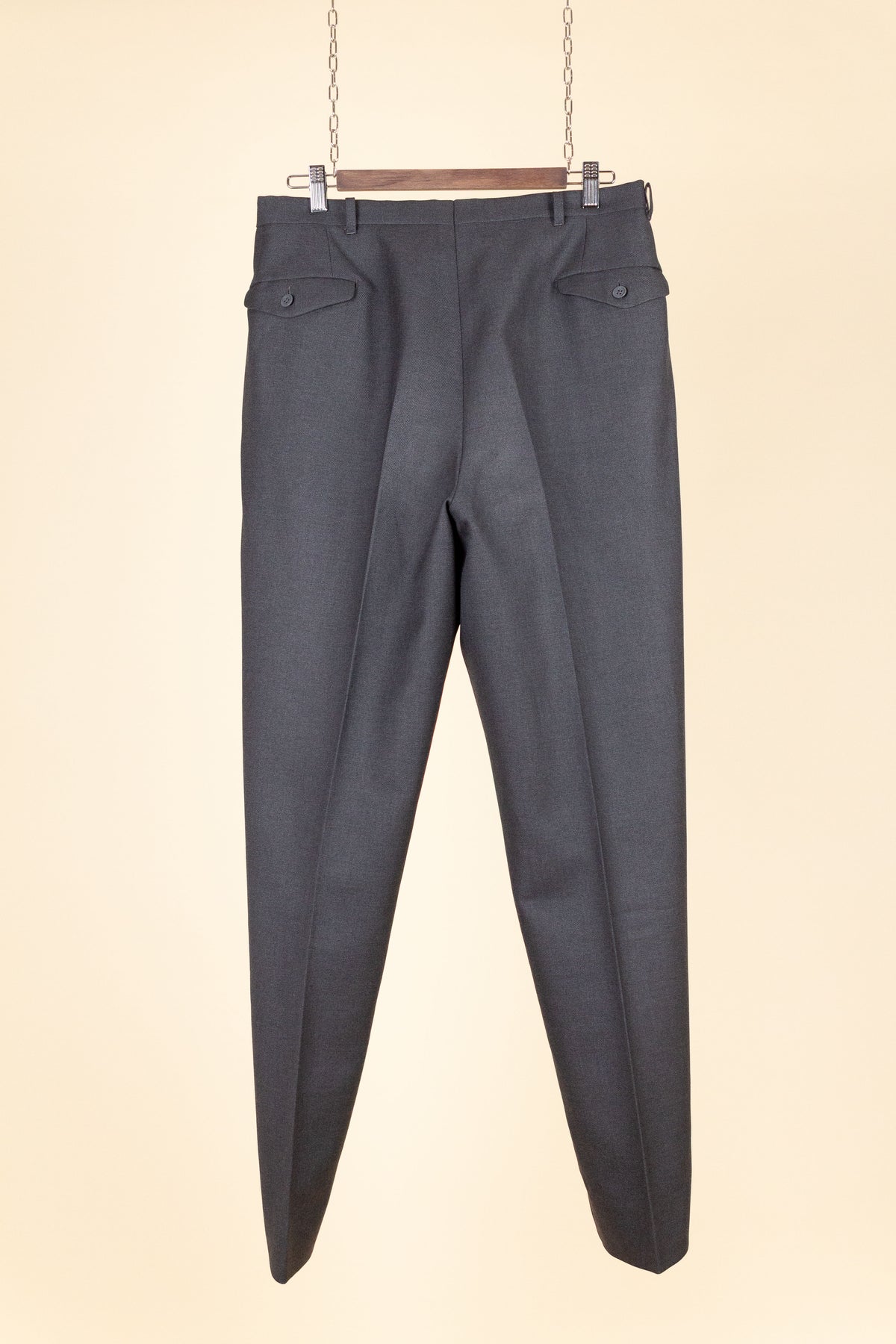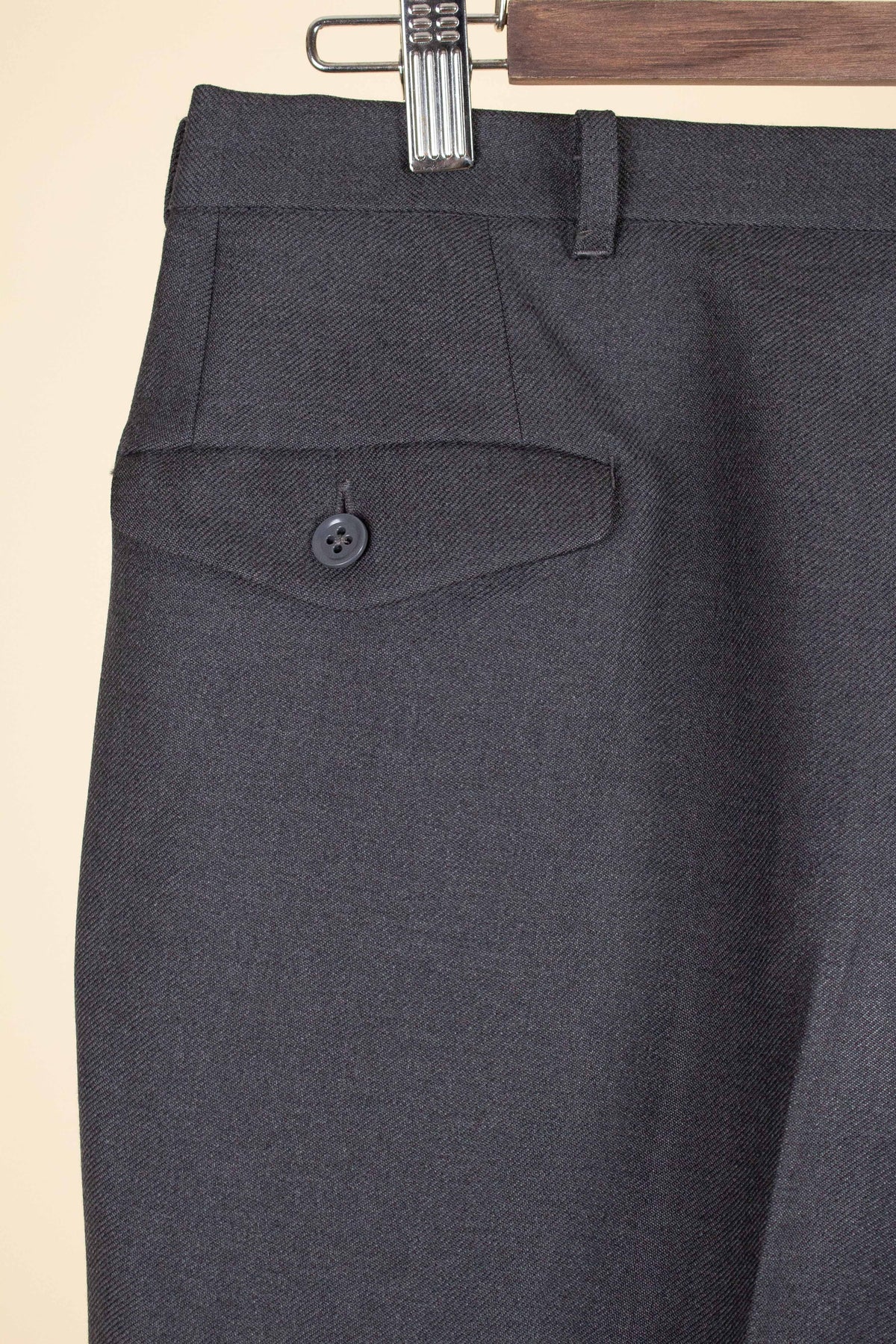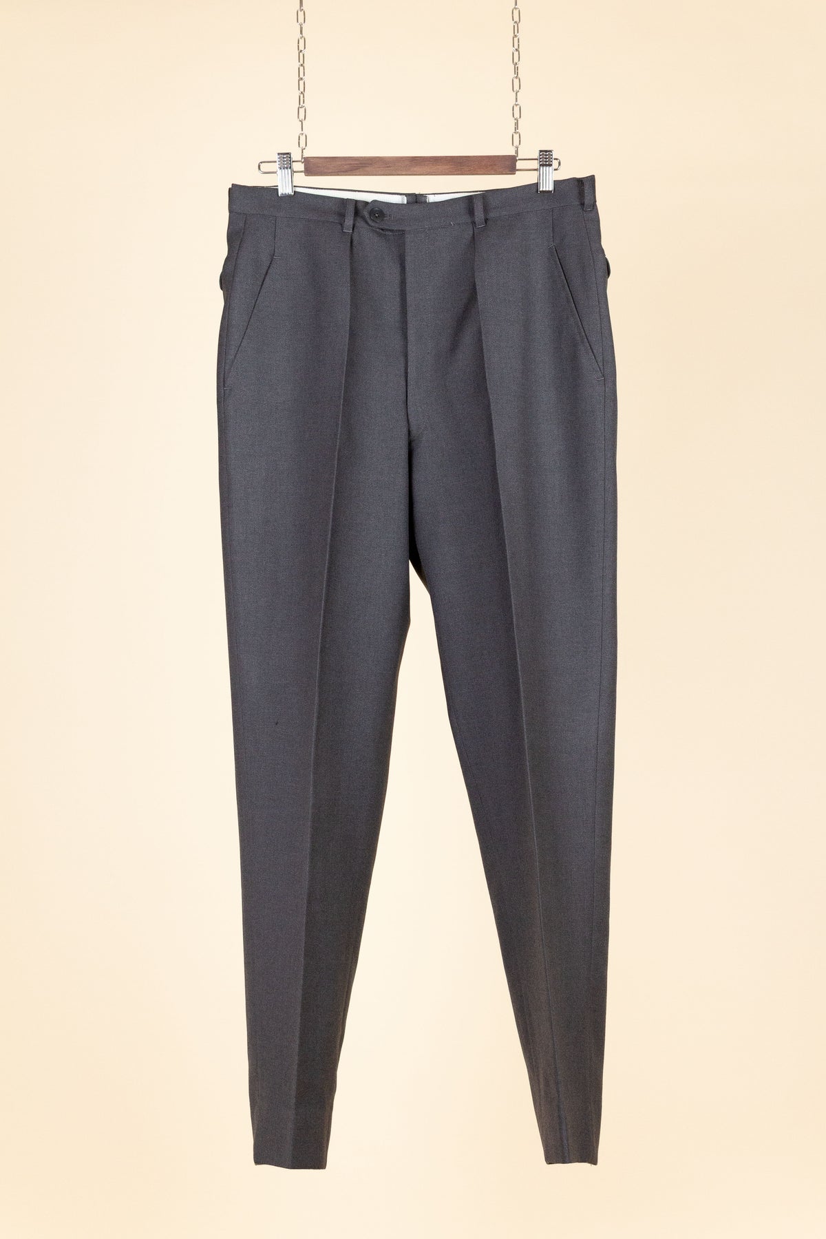 These trousers have no label, but it is still possible to draw certain conclusions from examining them. They are almost certainly of Swedish origin, most likely made sometime during the second half of the 1950s, although they may also be a few years younger. They were most probably originally part of a suit, but they also work very well as separate trousers. In colour they are mid-grey. They are made from a grey wool fabric with a subtle twill structure.