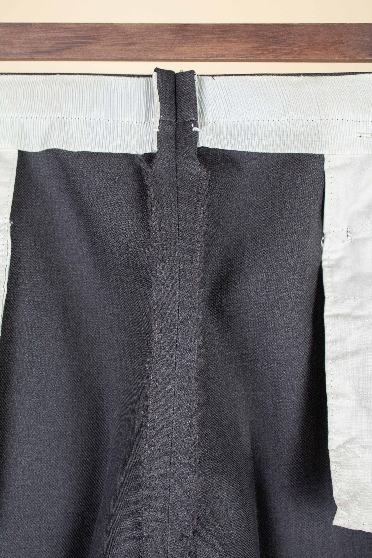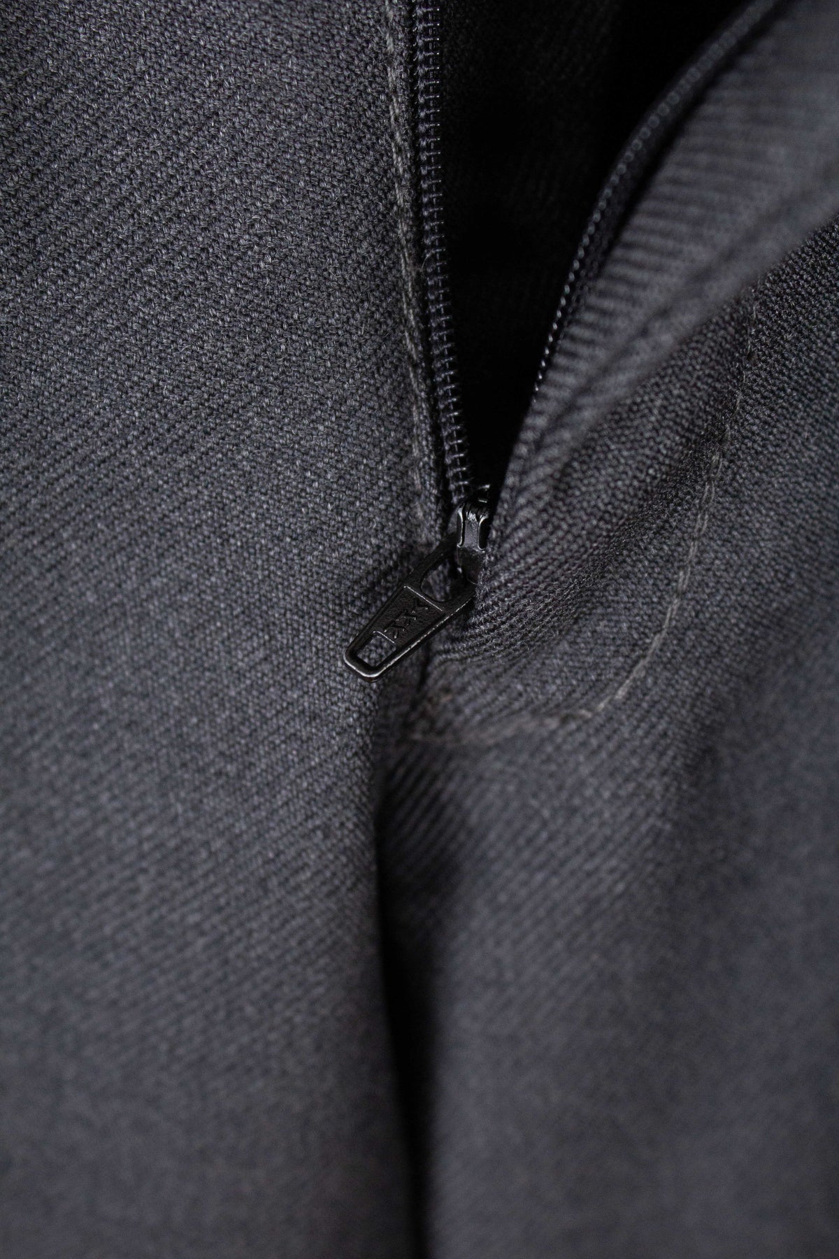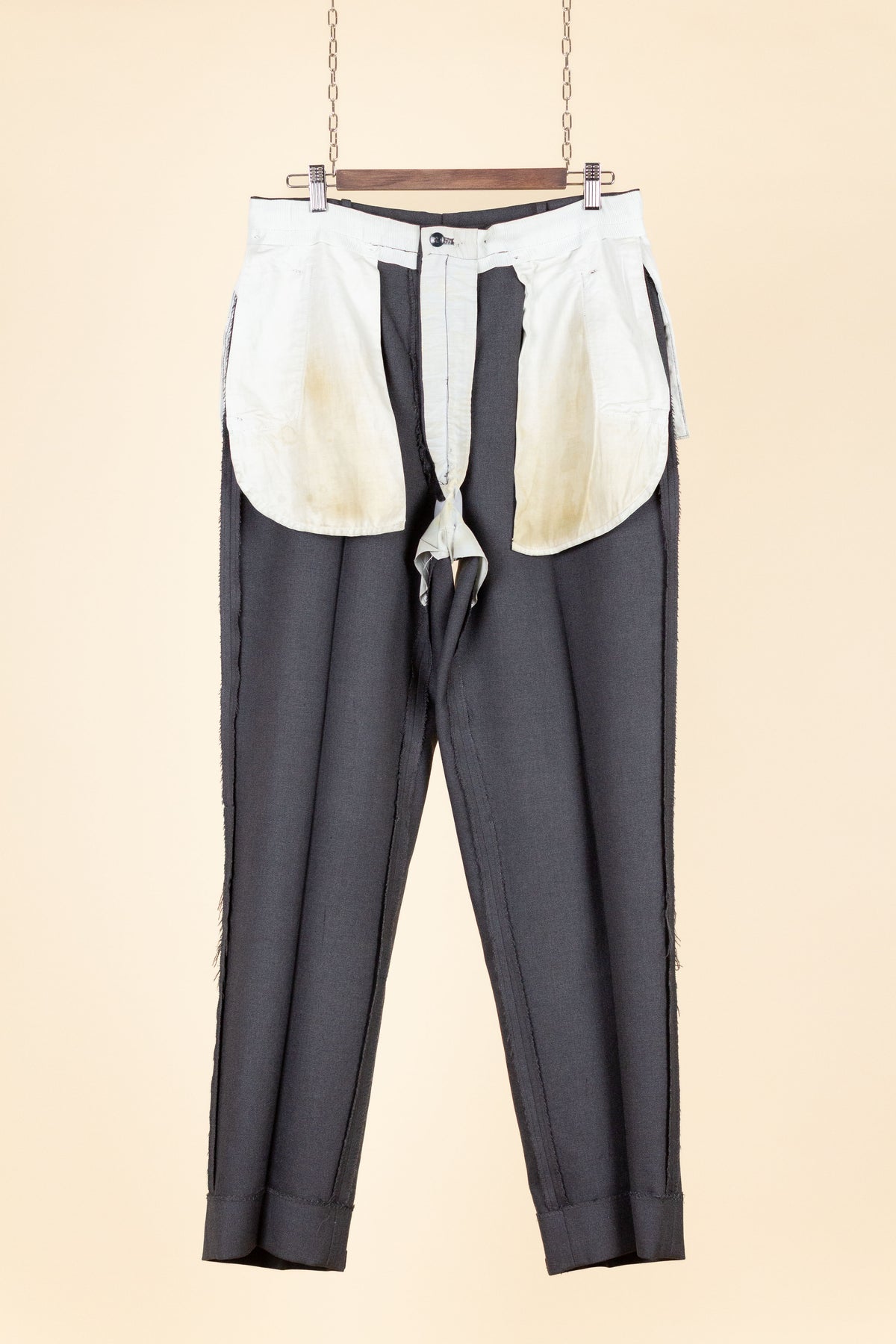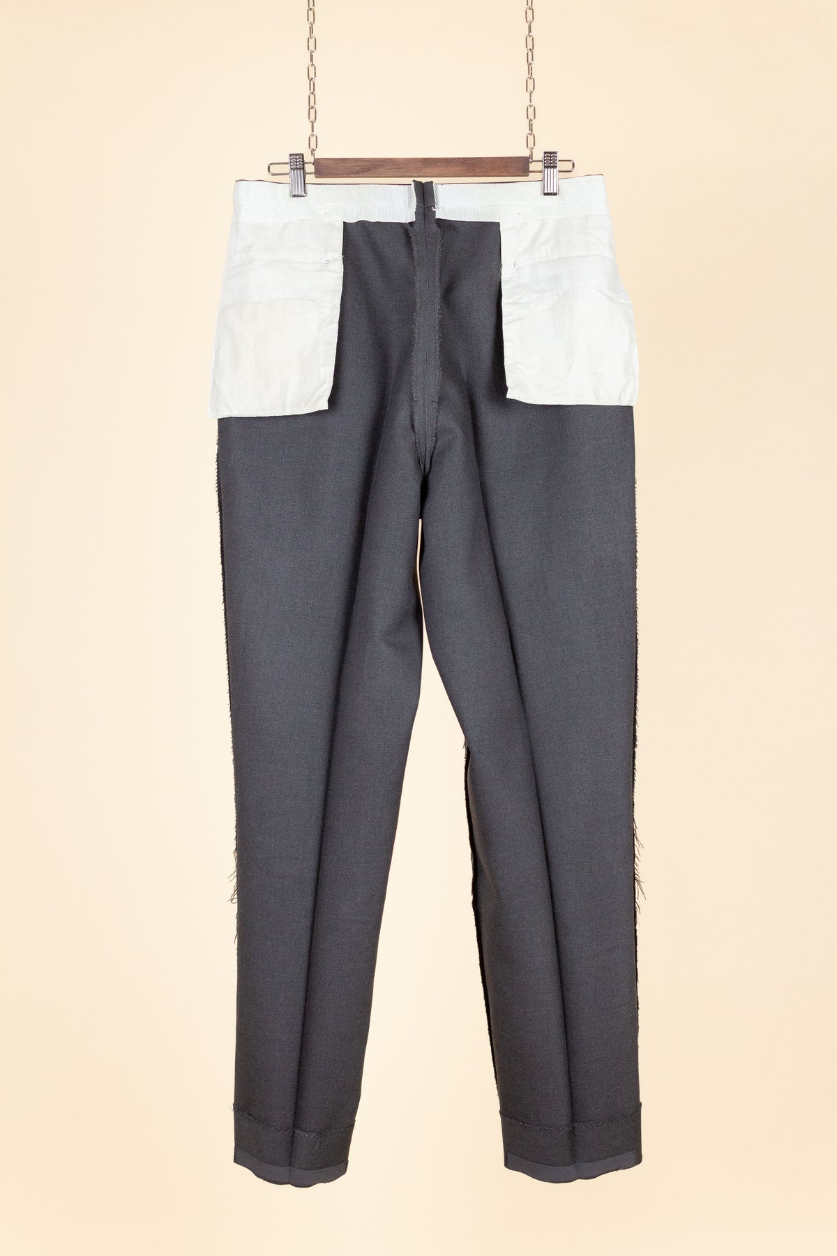 These trousers have no label, but it is still possible to draw certain conclusions from examining them. They are almost certainly of Swedish origin, most likely made sometime during the second half of the 1950s, although they may also be a few years younger. They were most probably originally part of a suit, but they also work very well as separate trousers. In colour they are mid-grey. They are made from a grey wool fabric with a subtle twill structure.