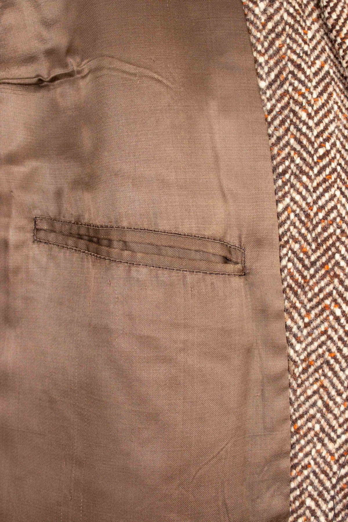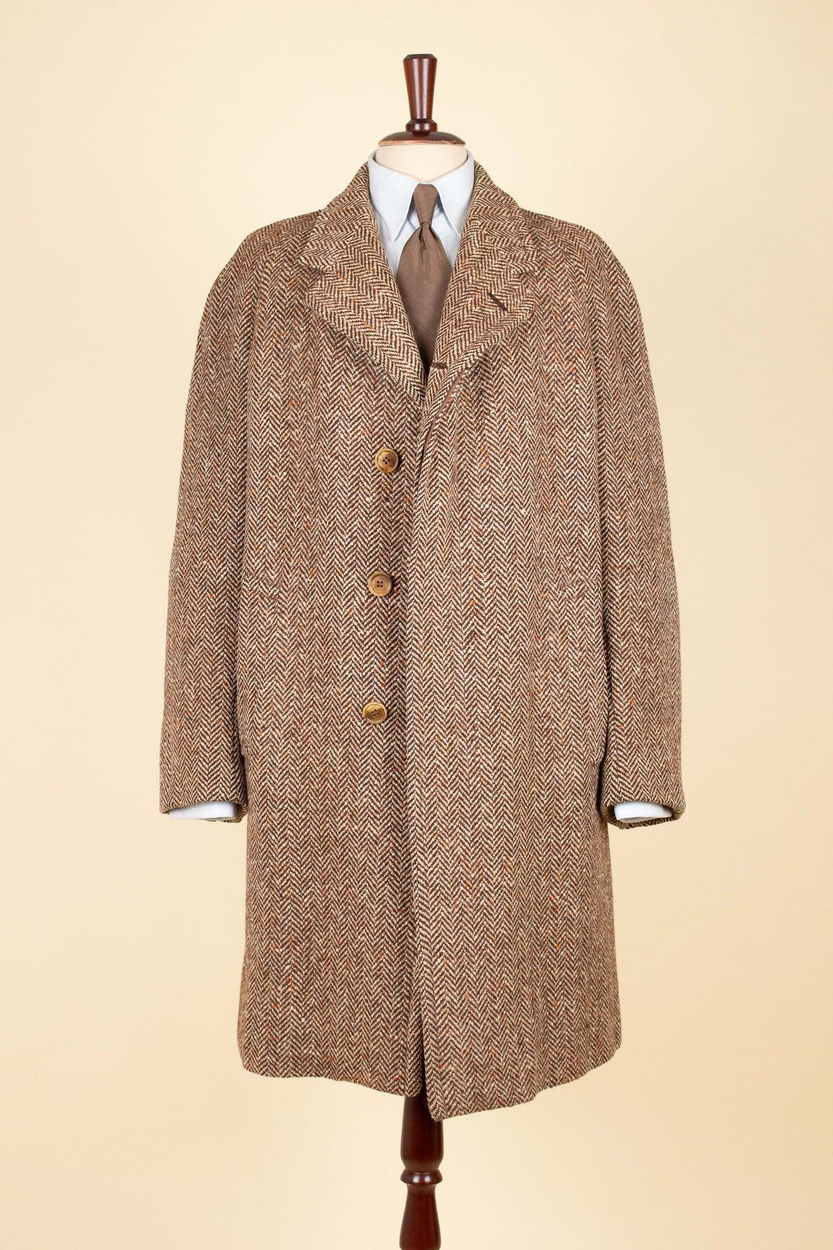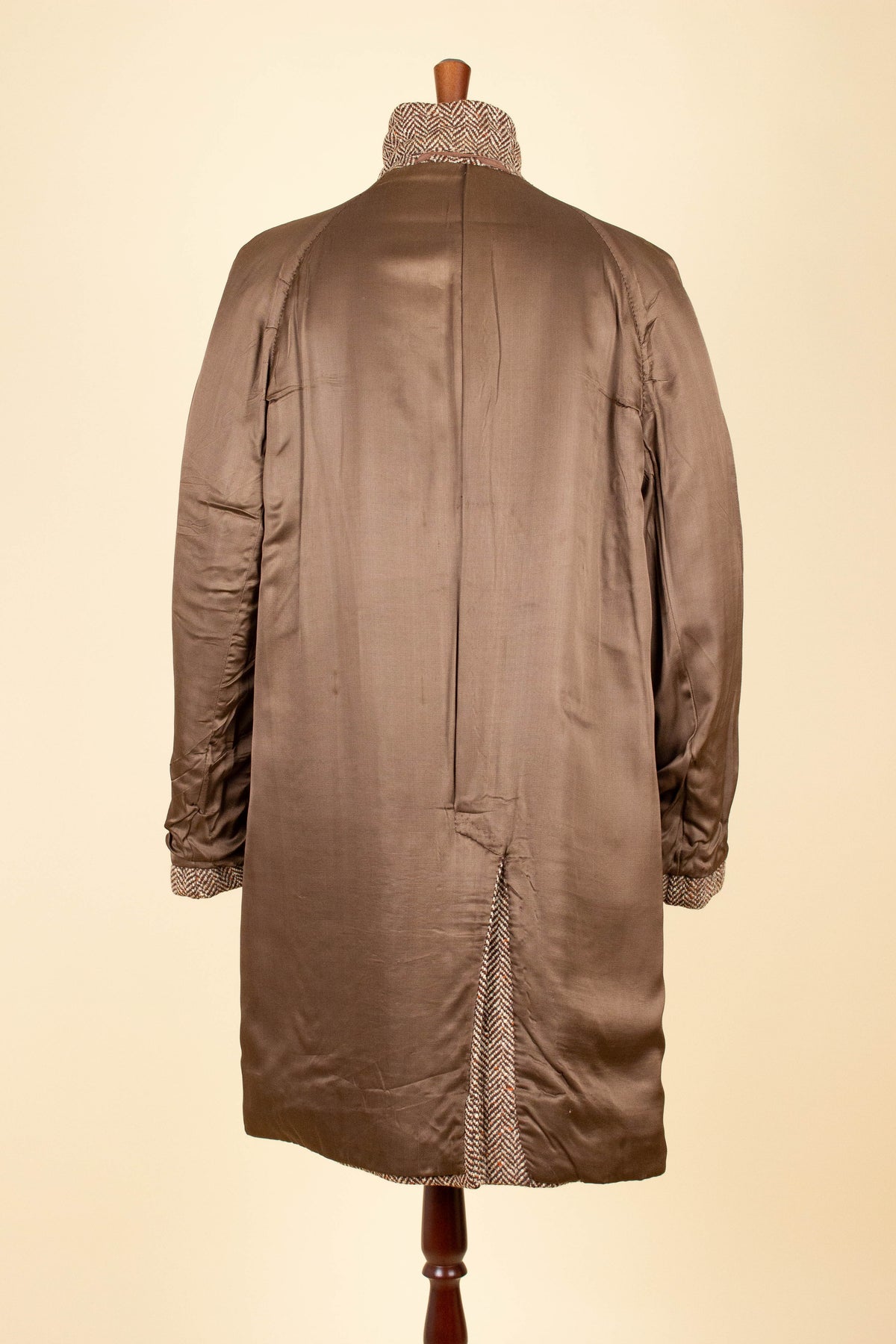 This beautiful raglan-sleeved tweed overcoat bears no labels, but we can confidently say it is of Swedish origin and was tailored sometime during the 1930s or 1940s. It is made from a heavy herringbone-patterned tweed. The pattern is clearly visible—even from a distance—and upon closer inspection, you’ll notice that in addition to brown and white tones, the fabric also includes subtle orange threads. A very attractive fabric that, we would argue, is quite typical of the era.