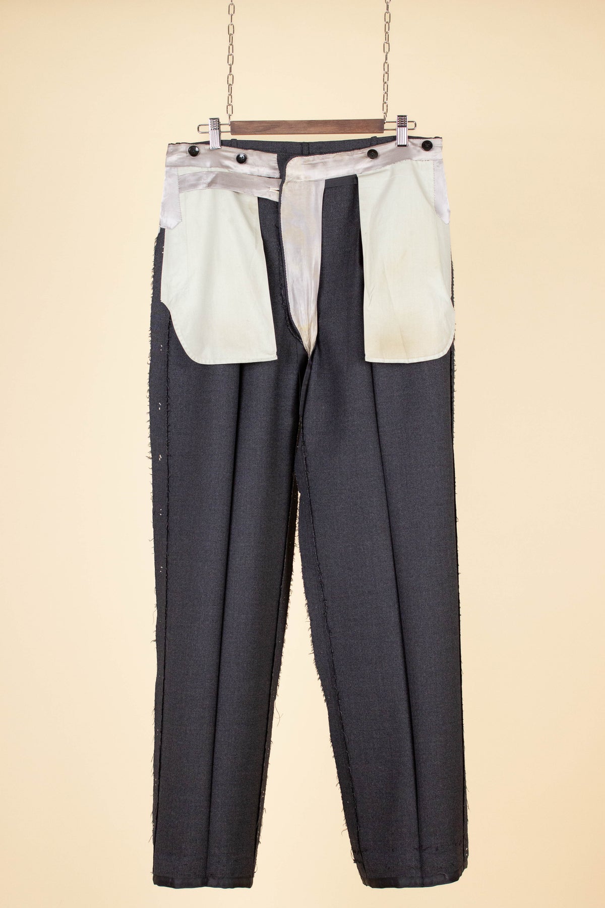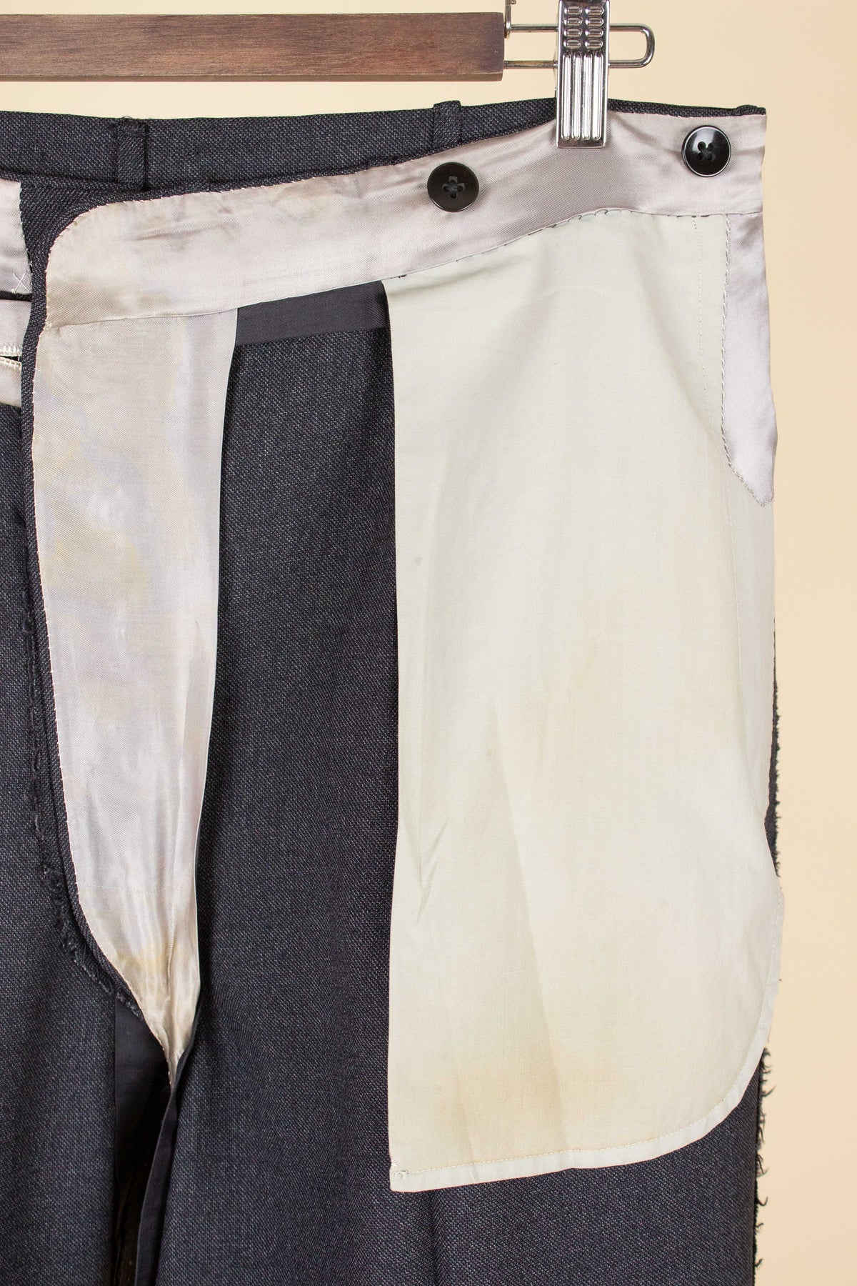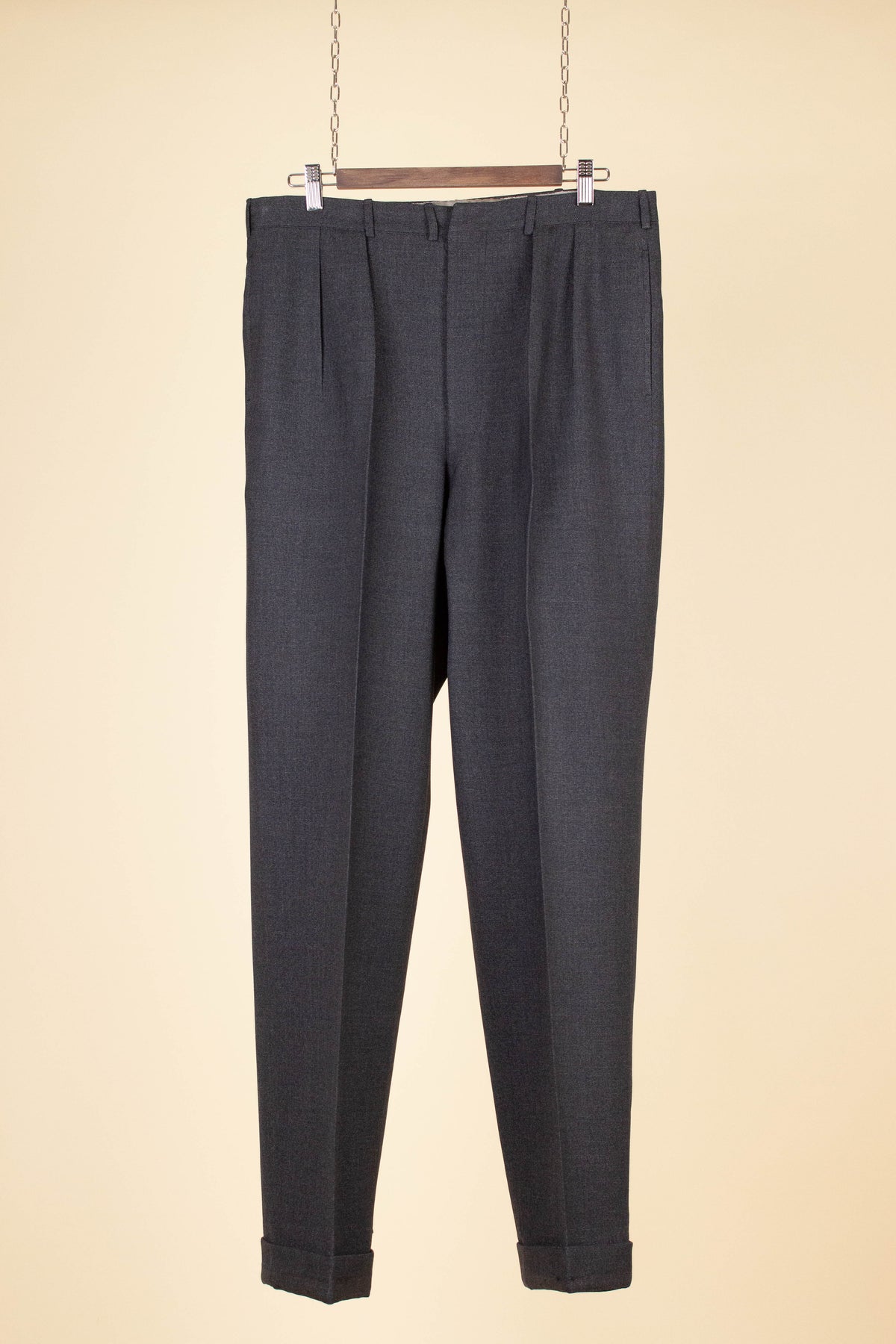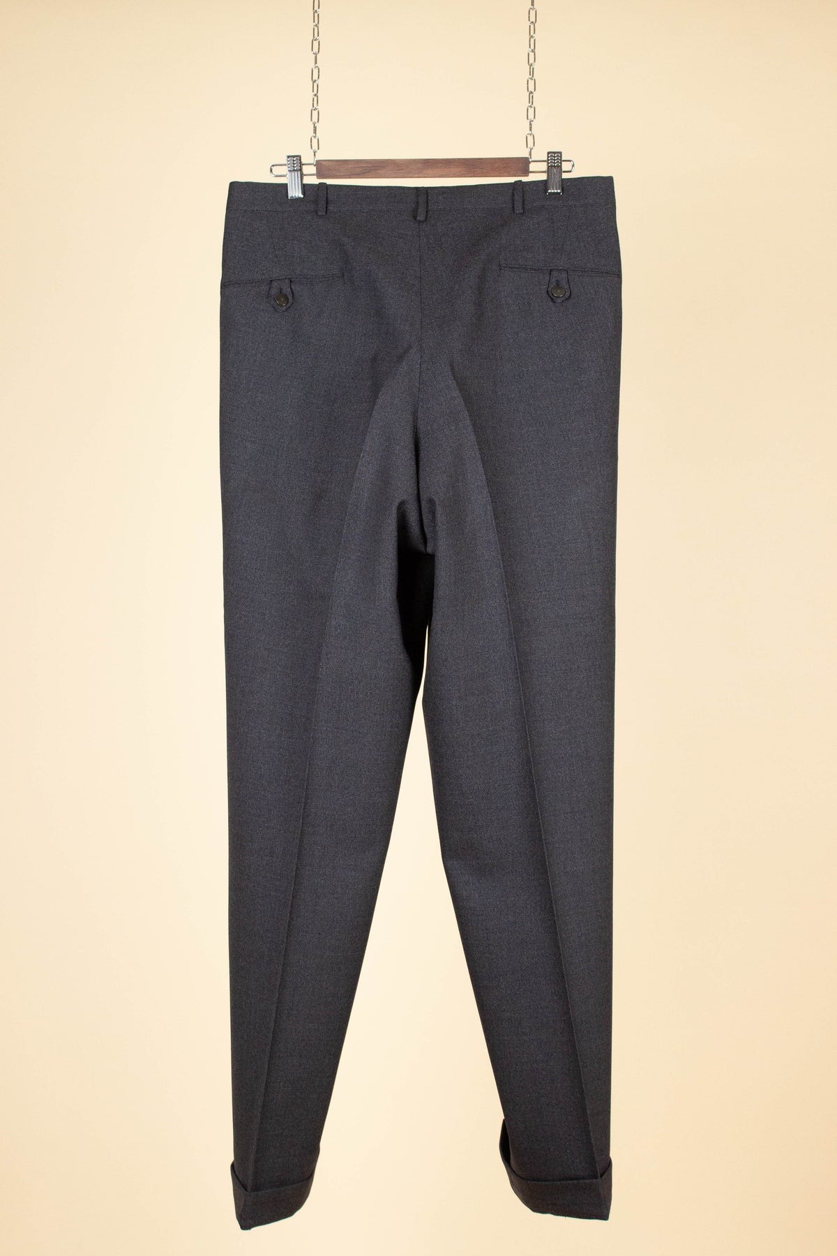 The trousers have double pleats, vertical front pockets, and belt loops. They feature a button fly, and there are buttons on the inside of the waistband for braces. At the back, there is one pocket on each side, both with button closures. The leg ends are cuffed.