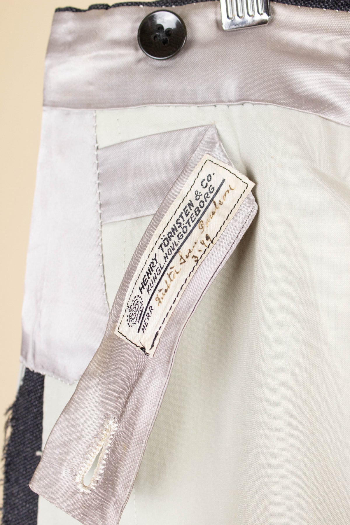 This suit is of Swedish origin and was bespoke by Henry Törnsten & Co in Gothenburg, on the Swedish west coast, in 1949. It is made from a lightweight, subtly mottled mid-grey wool fabric.