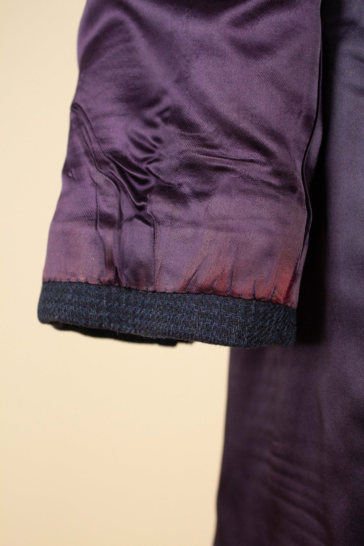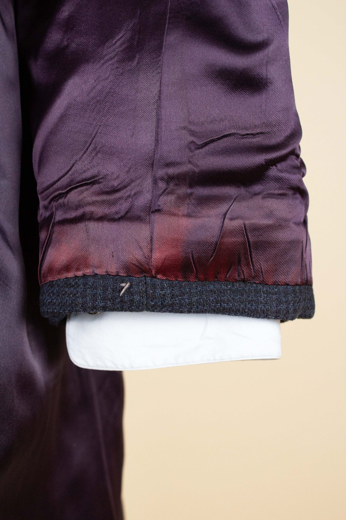 In terms of condition, the overall impression is good; however, there are some minor signs of wear visible upon closer inspection. These consist mainly of slight discolouration at the cuffs and in the fold of the collar. There is also a small flaw in the fabric. Please study the photographs carefully and form your own opinion regarding the condition.