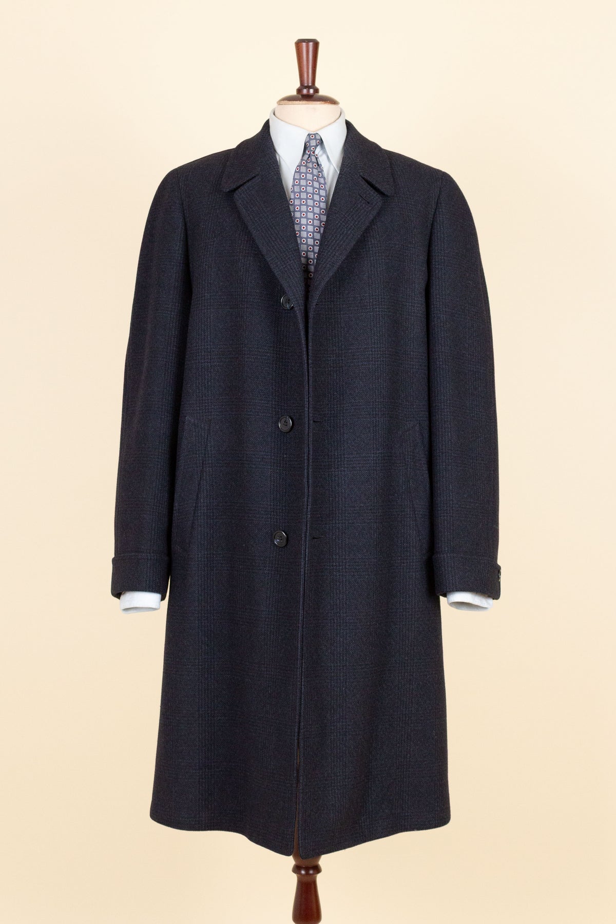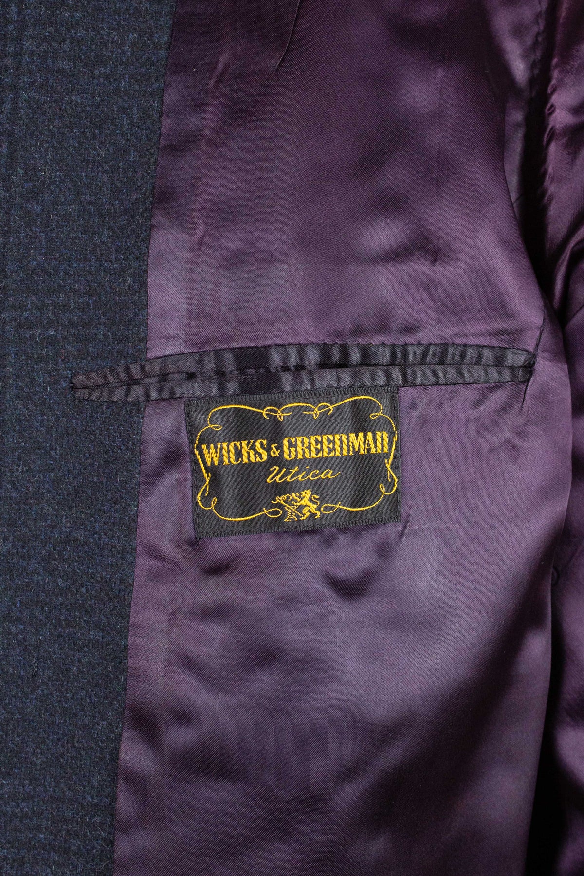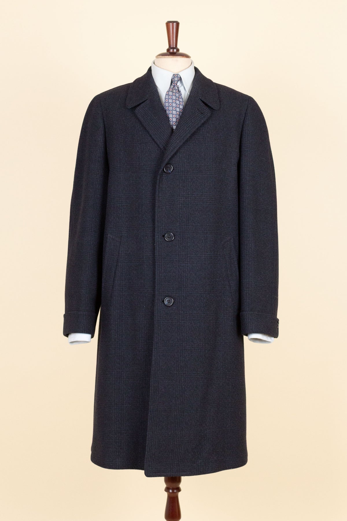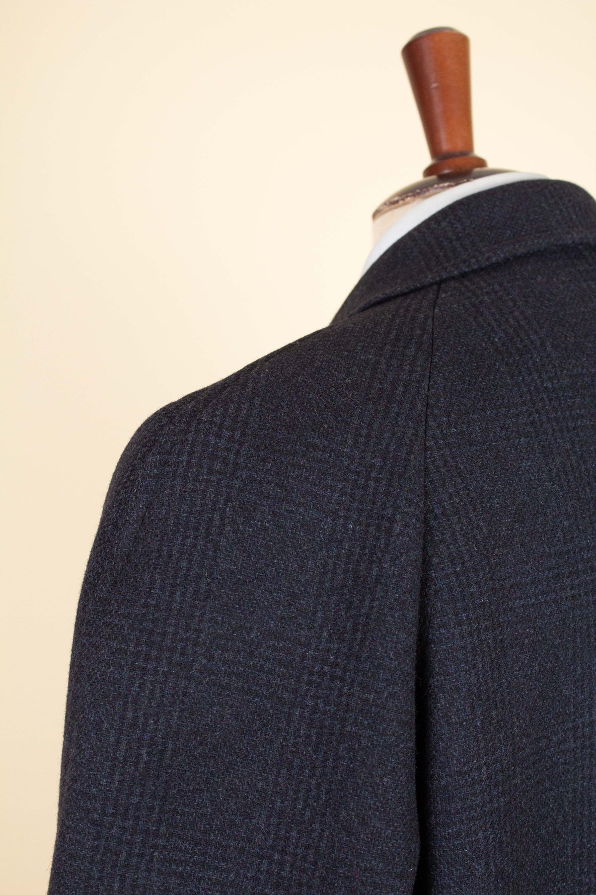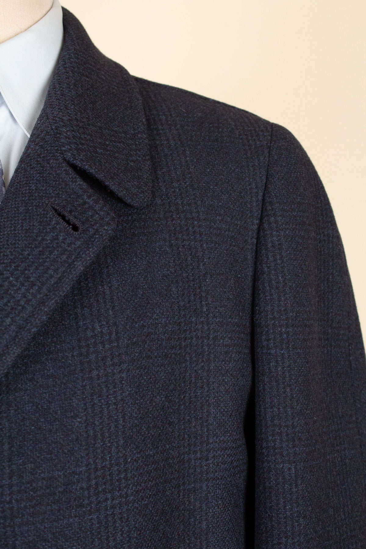 This coat is of American origin and made by Wicks & Greenman, based in Utica, New York. It was produced sometime during the 1960s and is tailored from a dark navy wool fabric featuring a Glen check pattern. The cloth is of Italian origin, as indicated by the label in the neck.