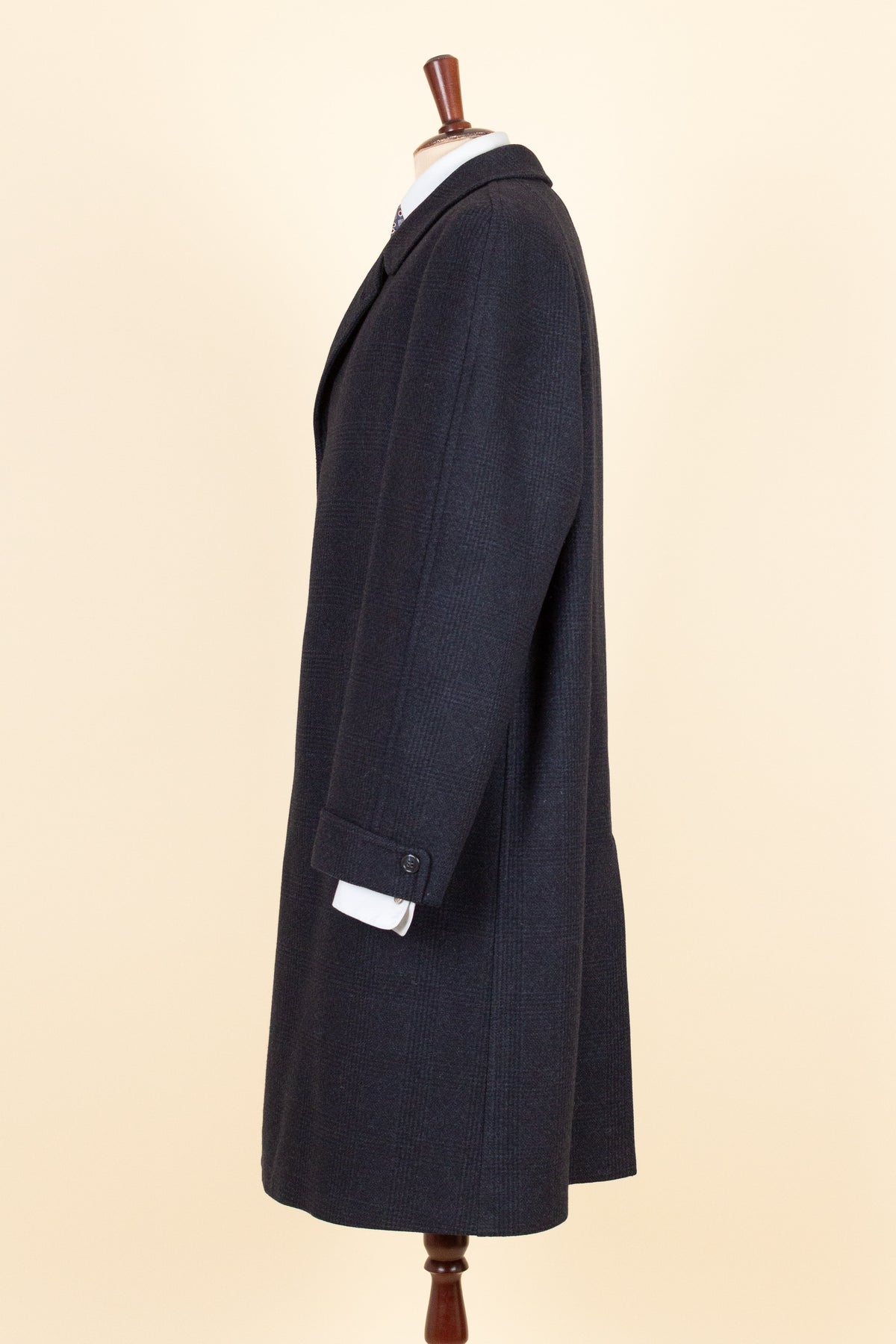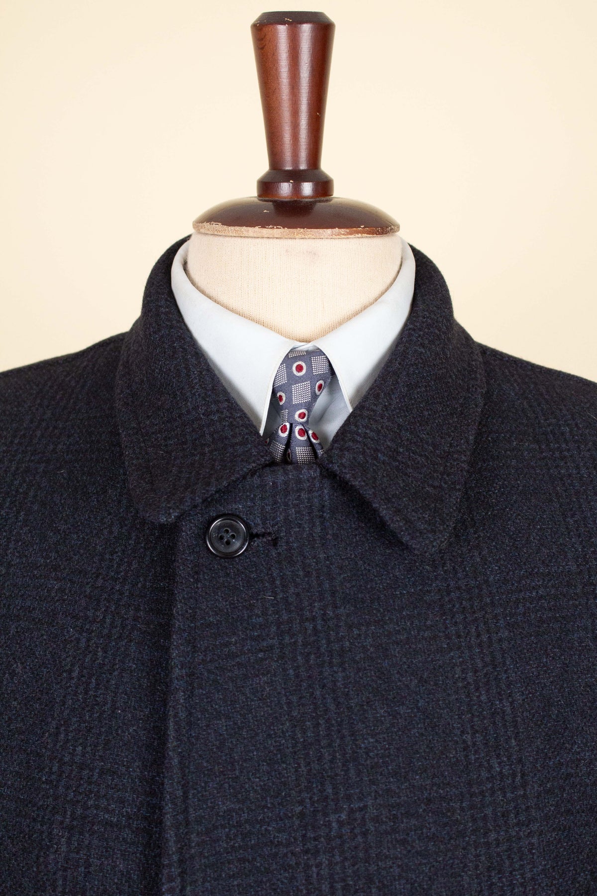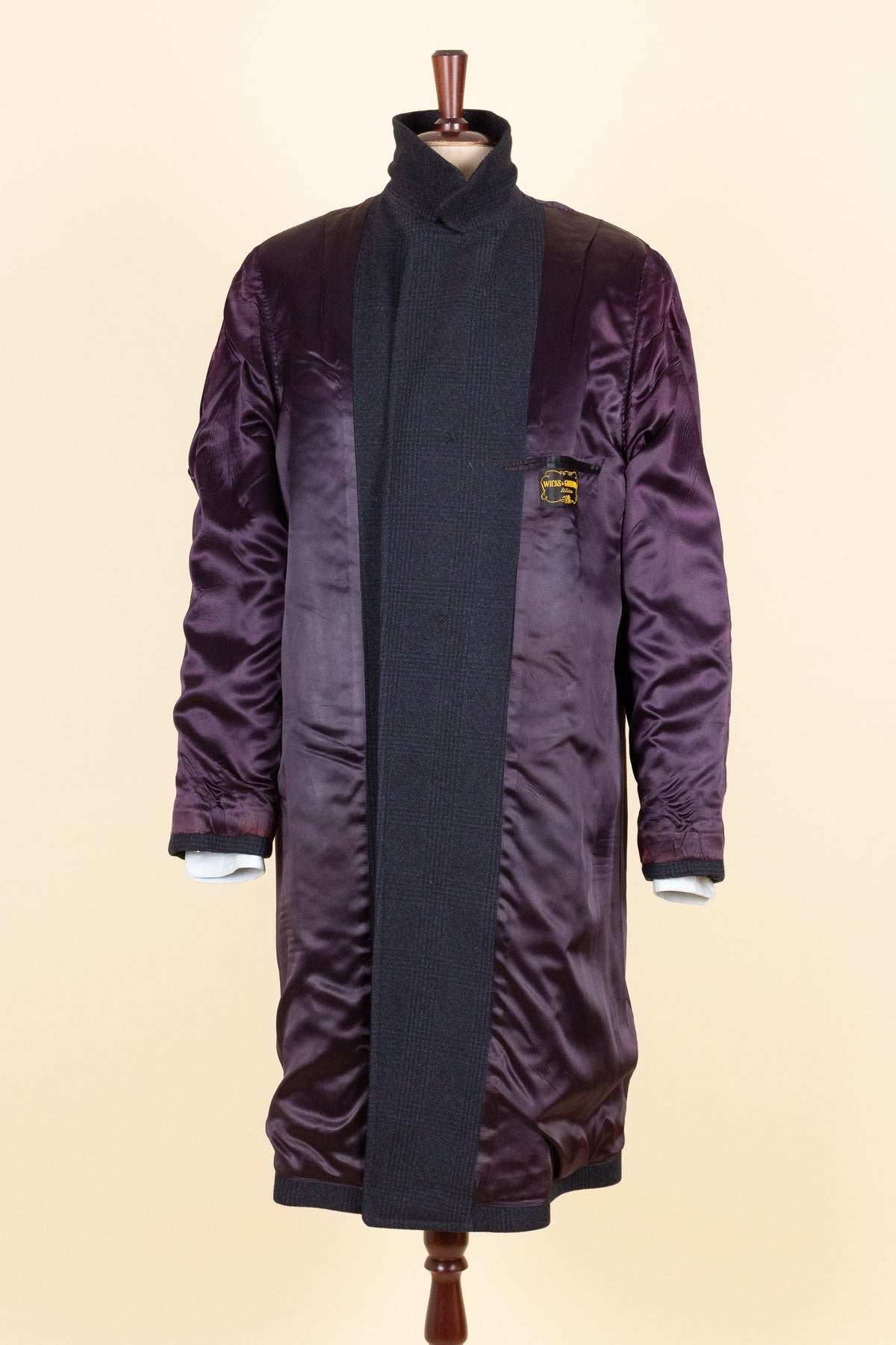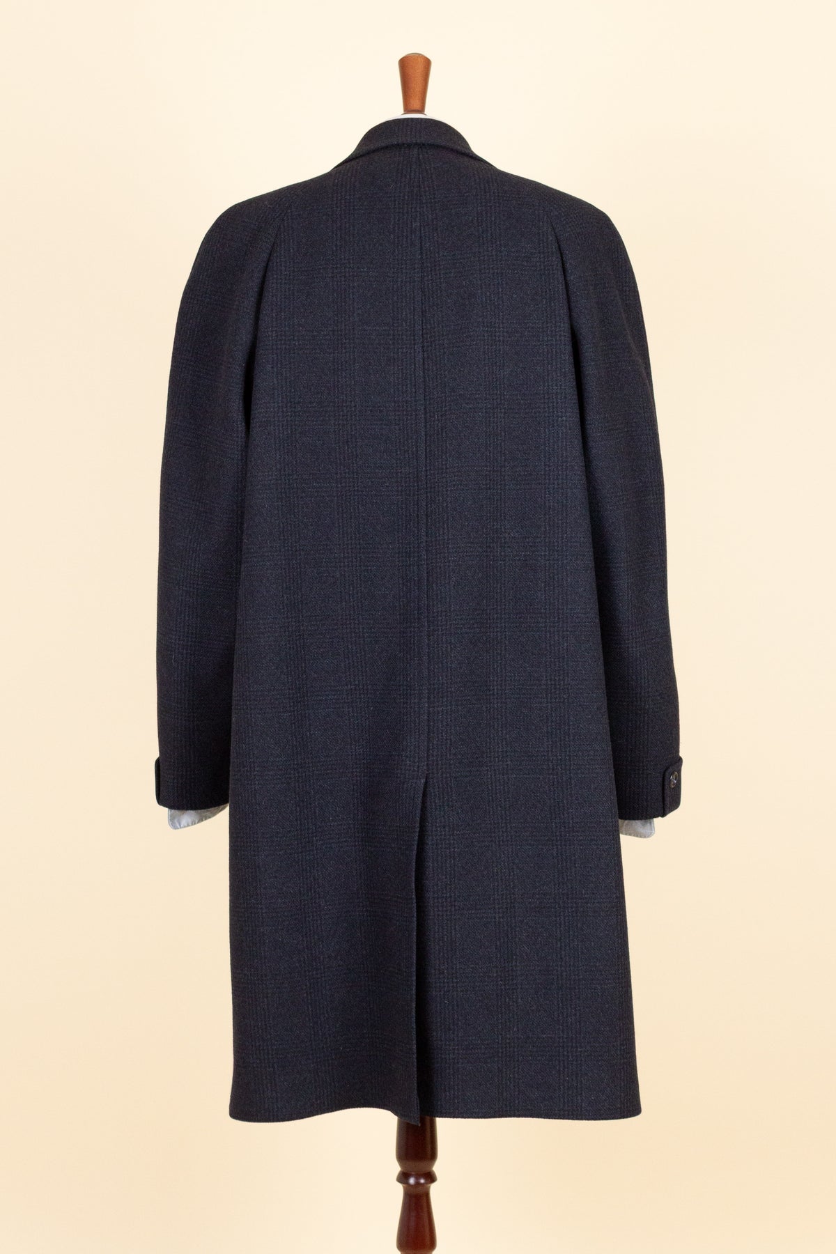 This coat is of American origin and made by Wicks & Greenman, based in Utica, New York. It was produced sometime during the 1960s and is tailored from a dark navy wool fabric featuring a Glen check pattern. The cloth is of Italian origin, as indicated by the label in the neck.