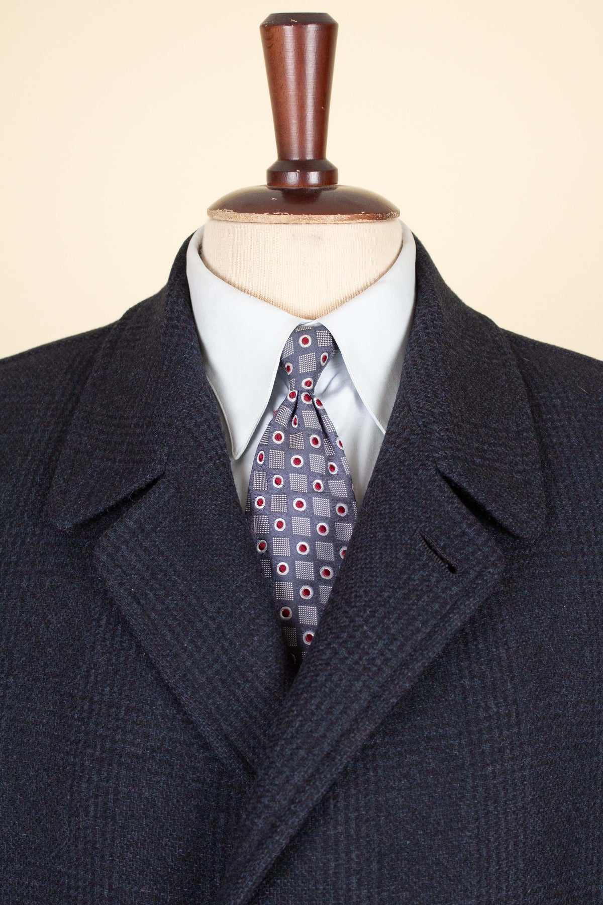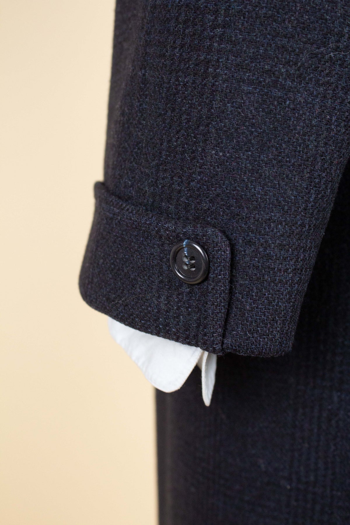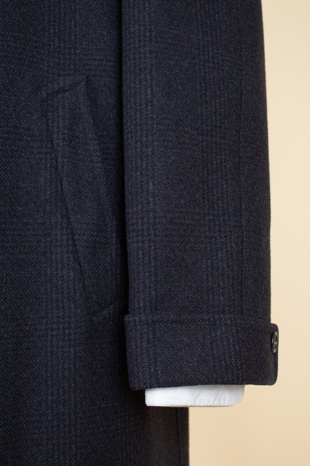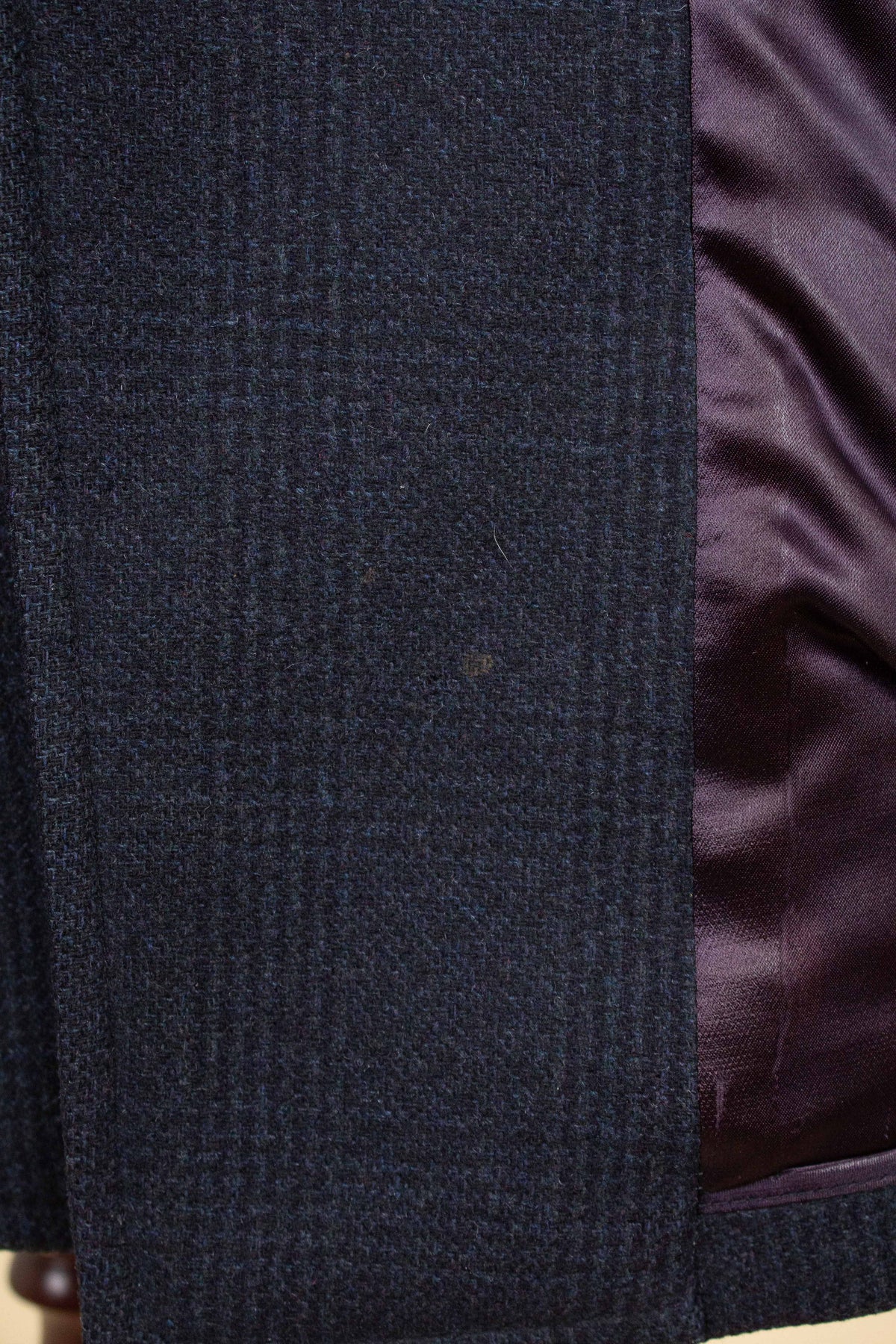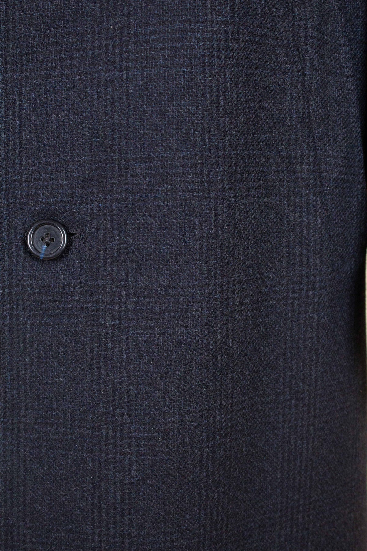 This coat is of American origin and made by Wicks & Greenman, based in Utica, New York. It was produced sometime during the 1960s and is tailored from a dark navy wool fabric featuring a Glen check pattern. The cloth is of Italian origin, as indicated by the label in the neck.