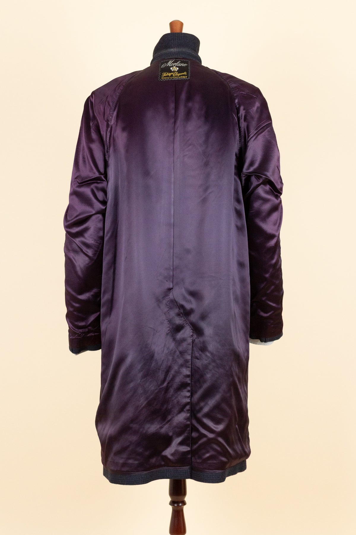 The coat is cut in a raglan style and is single-breasted. It fastens with three buttons, plus an additional button at the neck should one wish to fasten it all the way up. It features slanted front pockets and a buttonhole on the left lapel. The cuffs have decorative turn-ups adorned with a button. The back is straight with a single vent. Internally, the coat is fully lined and has one pocket on the right-hand side.