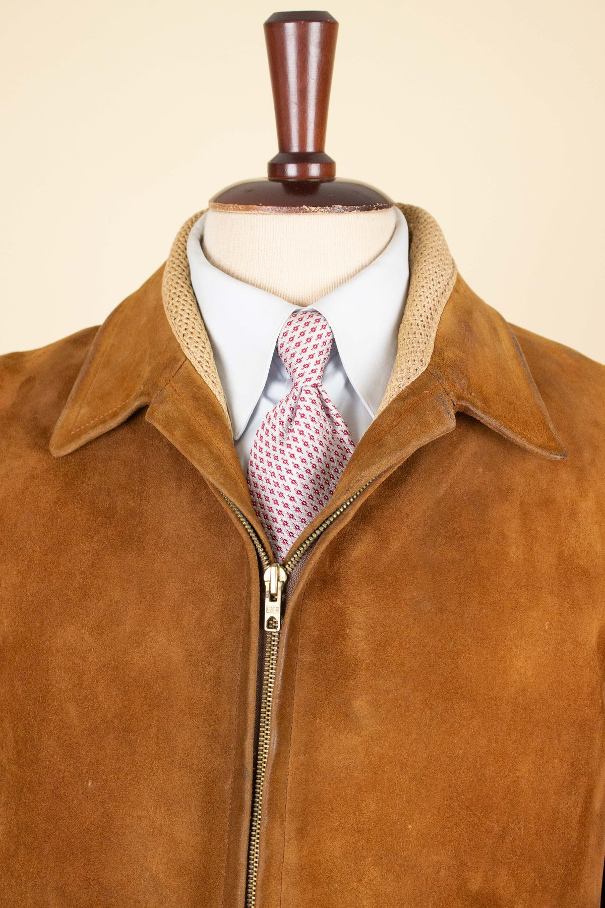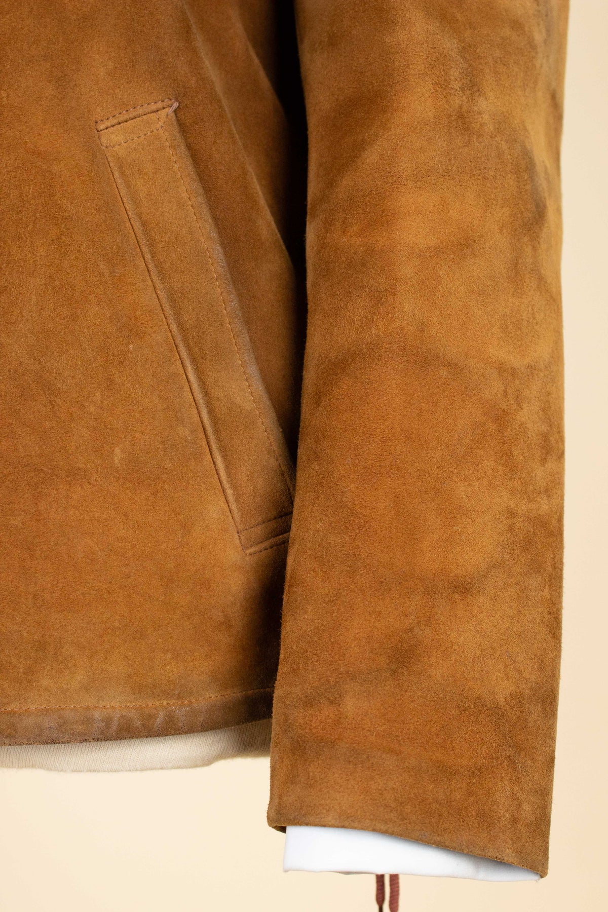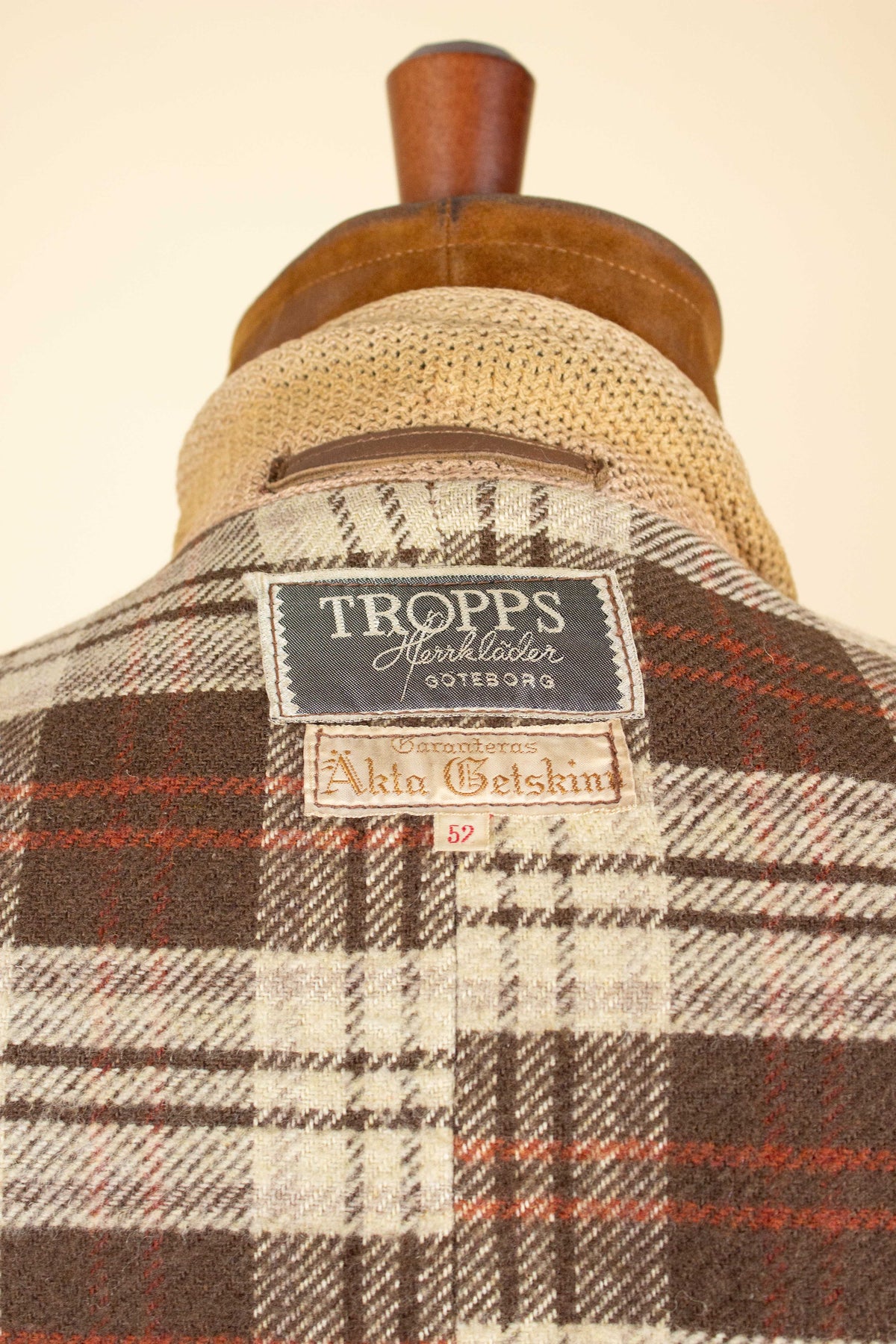 It does, however, have a label indicating the original retailer: Tropps Herrkläder in Gothenburg. Beneath that label is another that reads “äkta getskinn” (genuine goatskin). The jacket is made from brown suede in a warm, earthy tone.