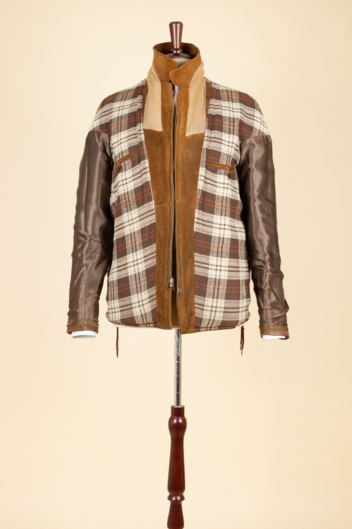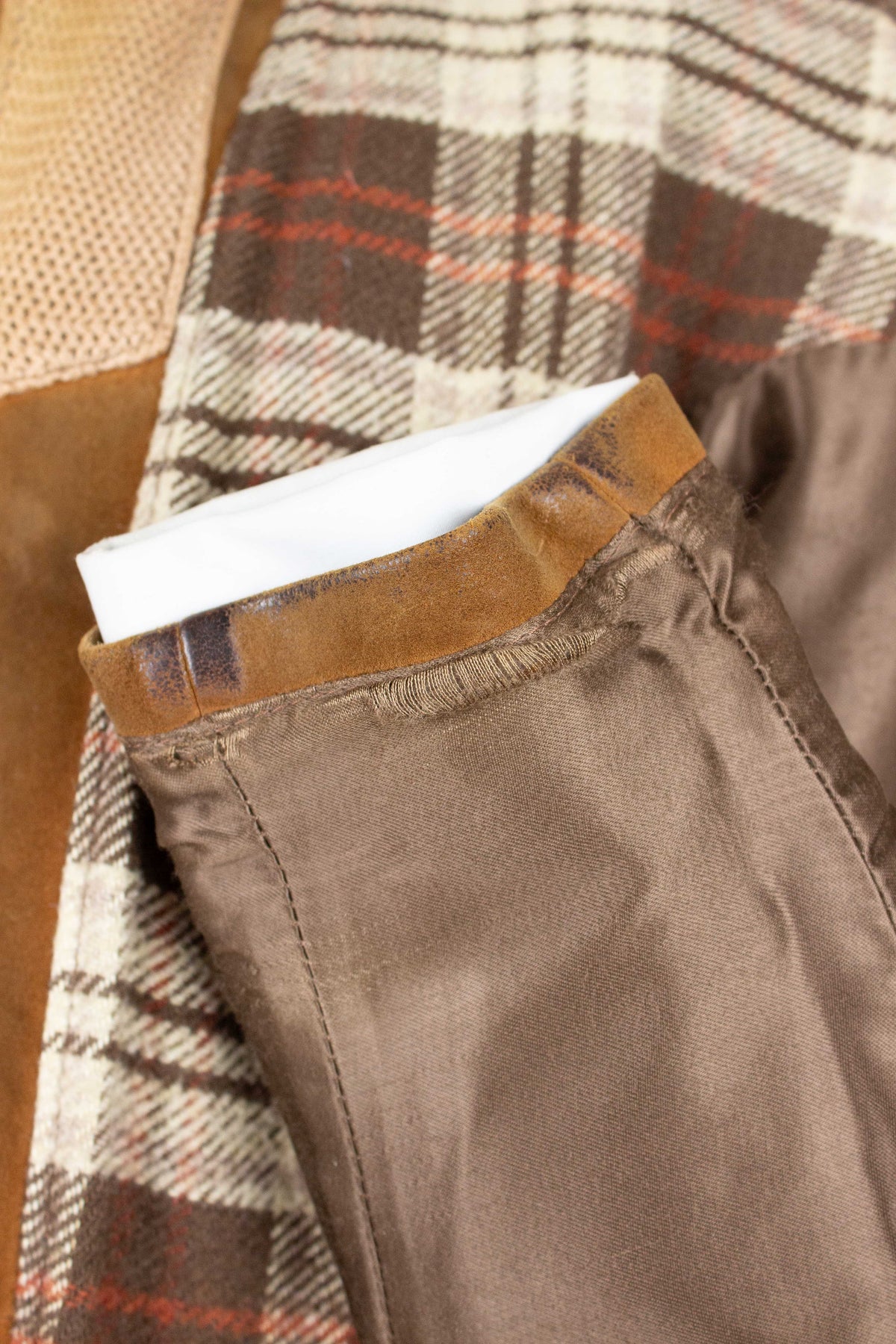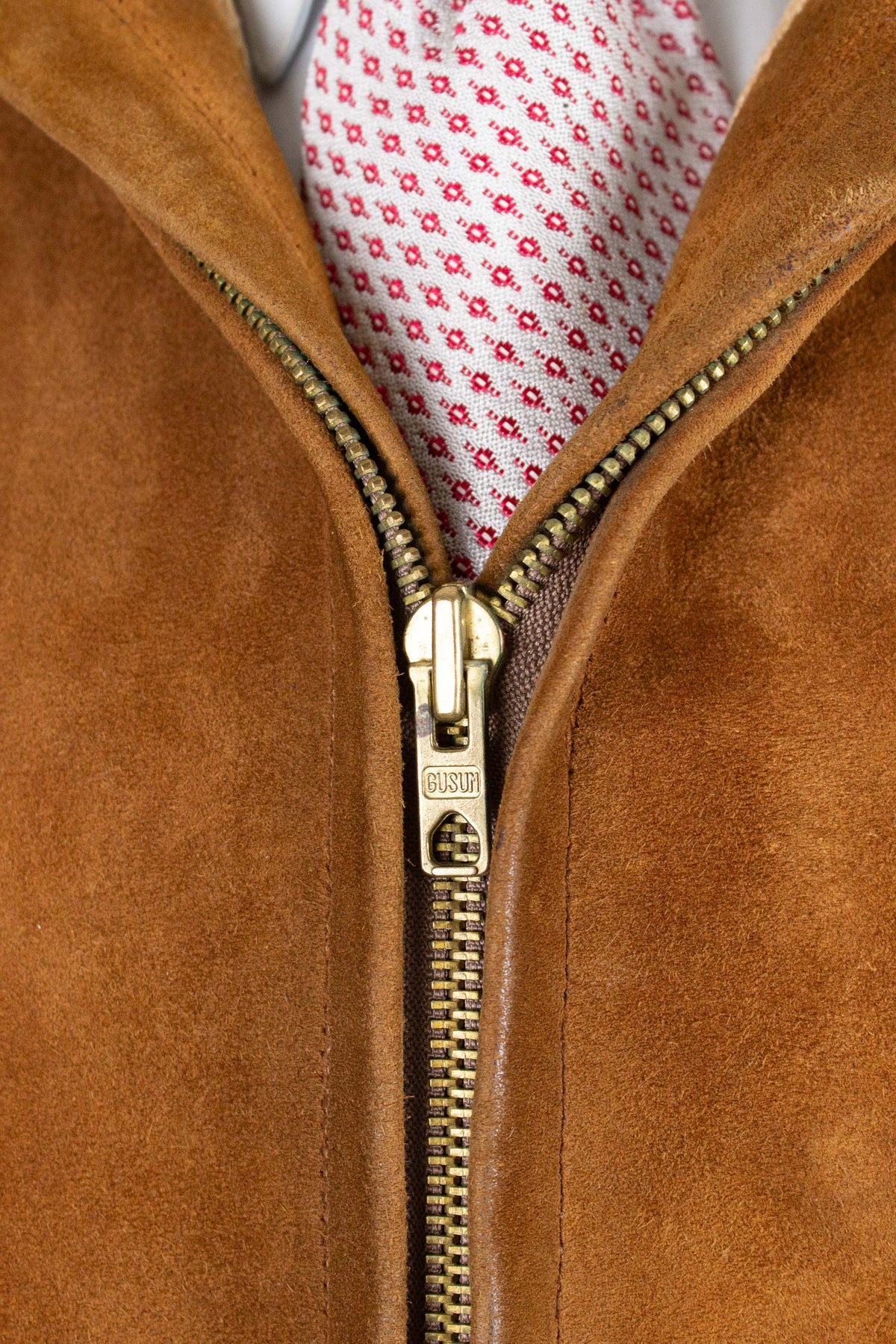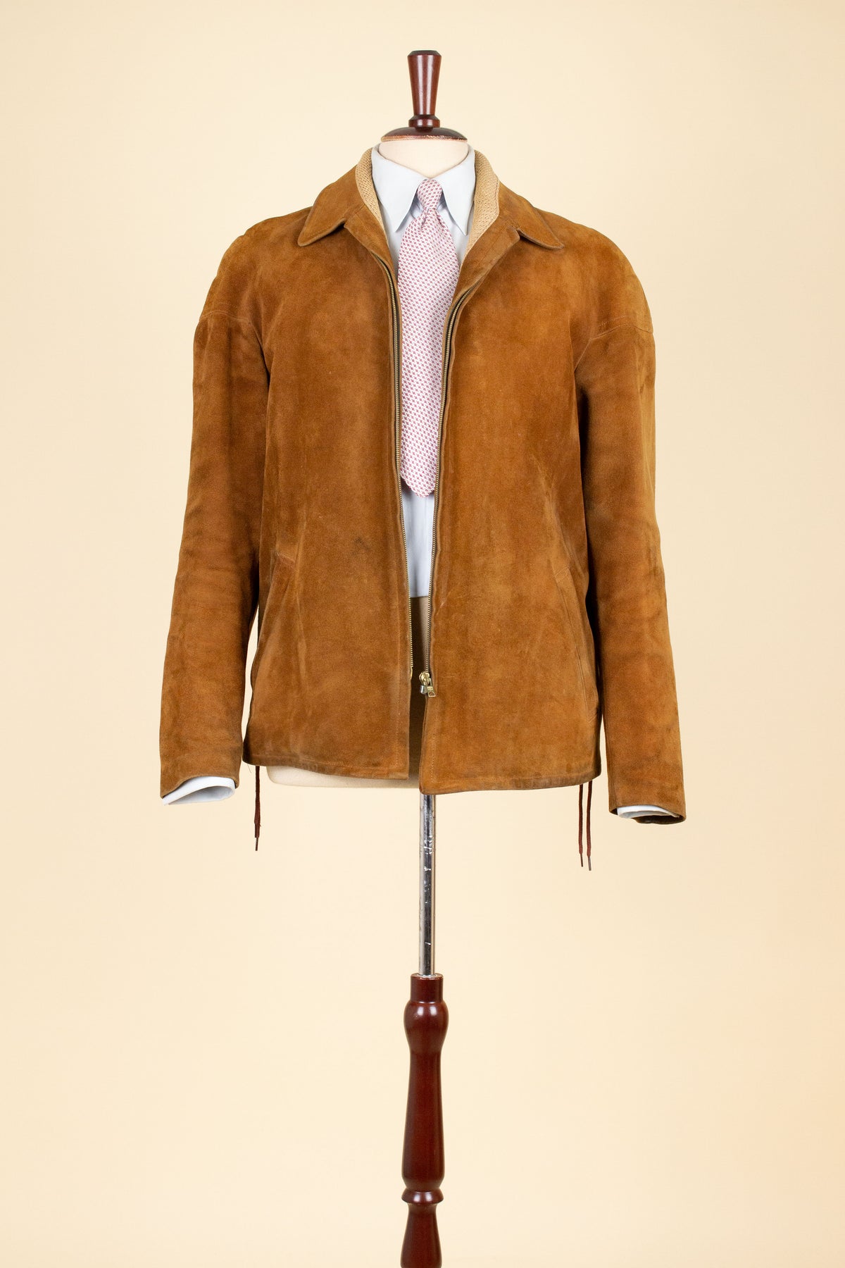 It does, however, have a label indicating the original retailer: Tropps Herrkläder in Gothenburg. Beneath that label is another that reads “äkta getskinn” (genuine goatskin). The jacket is made from brown suede in a warm, earthy tone.