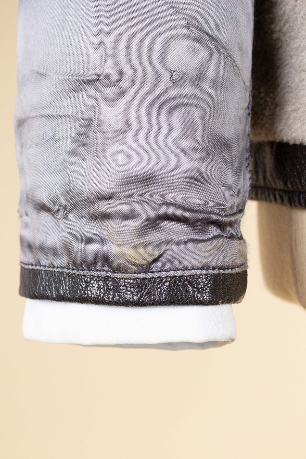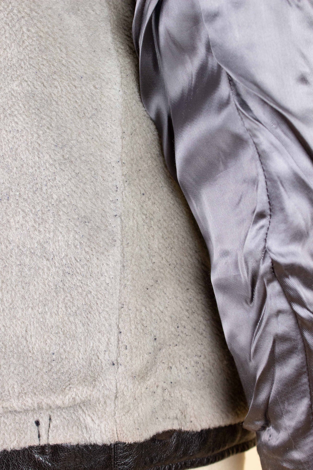This short leather jacket is of Swedish origin. It bears no labels except for the one at the back of the neck stating “genuine goatskin guaranteed,” but it can still be confidently dated to the 1950s and is likely produced in the Malung area, in the province of Dalarna. It is dark brown and features a short, classic cut. The jacket fastens with a zipper and has slightly angled front pockets. The sides are equipped with buckles to adjust the fit, and the back is straight. The interior is lined with grey teddy fabric in the body and silver-coloured silk in the sleeves. There is also an inner pocket on the right side.