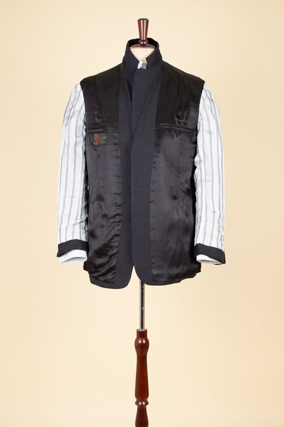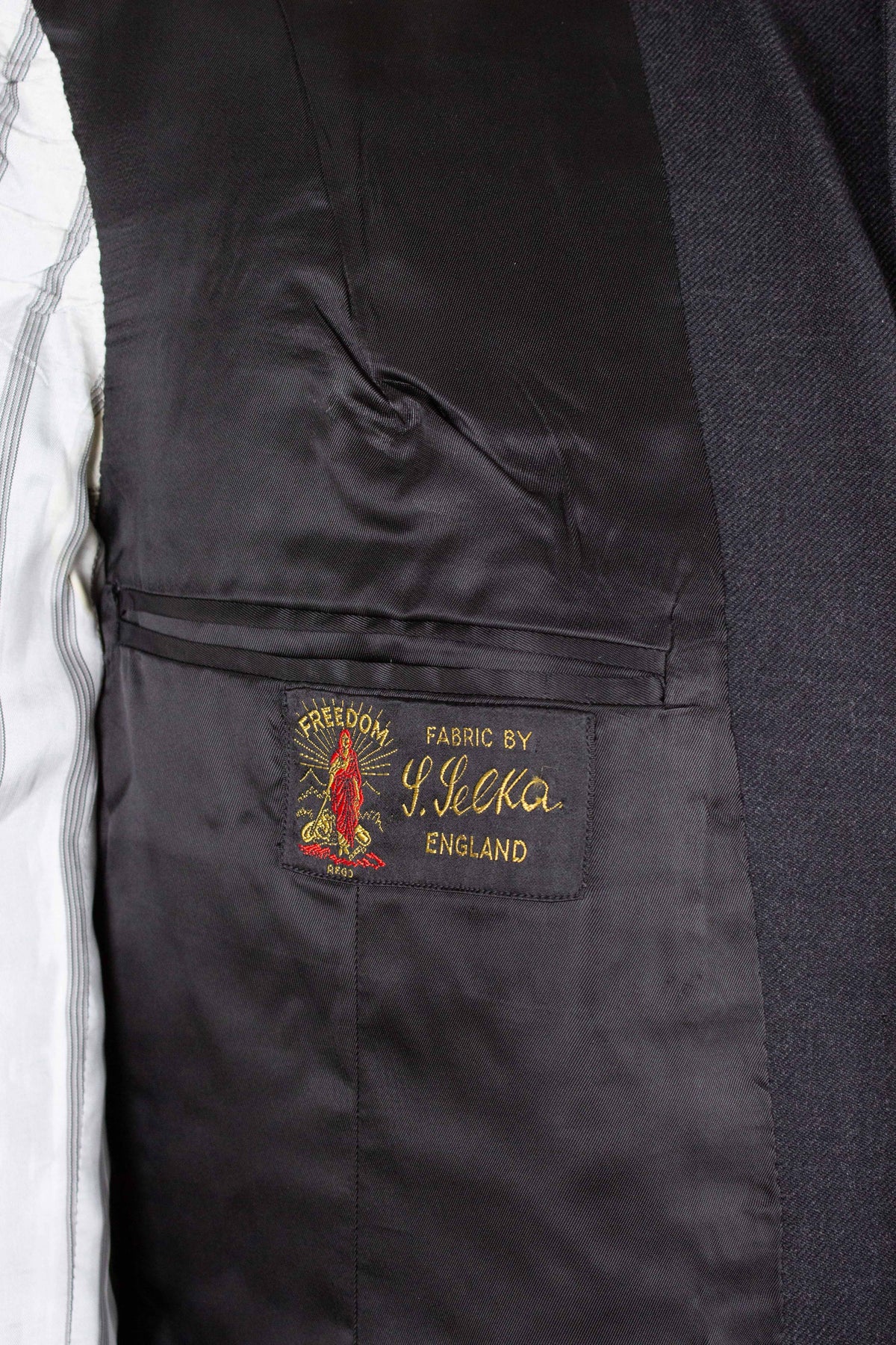 This suit lacks a manufacturer’s label, so it is not possible to determine who made it. There is, however, a label in the jacket from the fabric supplier, indicating that the cloth is of British origin. The suit itself appears to have been made in Sweden. It has several details clearly showing that it is bespoke, such as the working buttonholes on the sleeve cuffs. It is made from a dark grey fabric with a subtle twill texture.