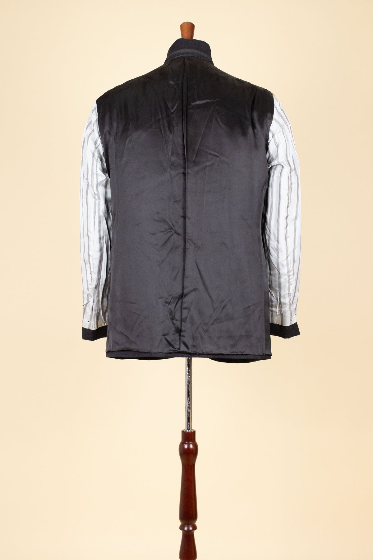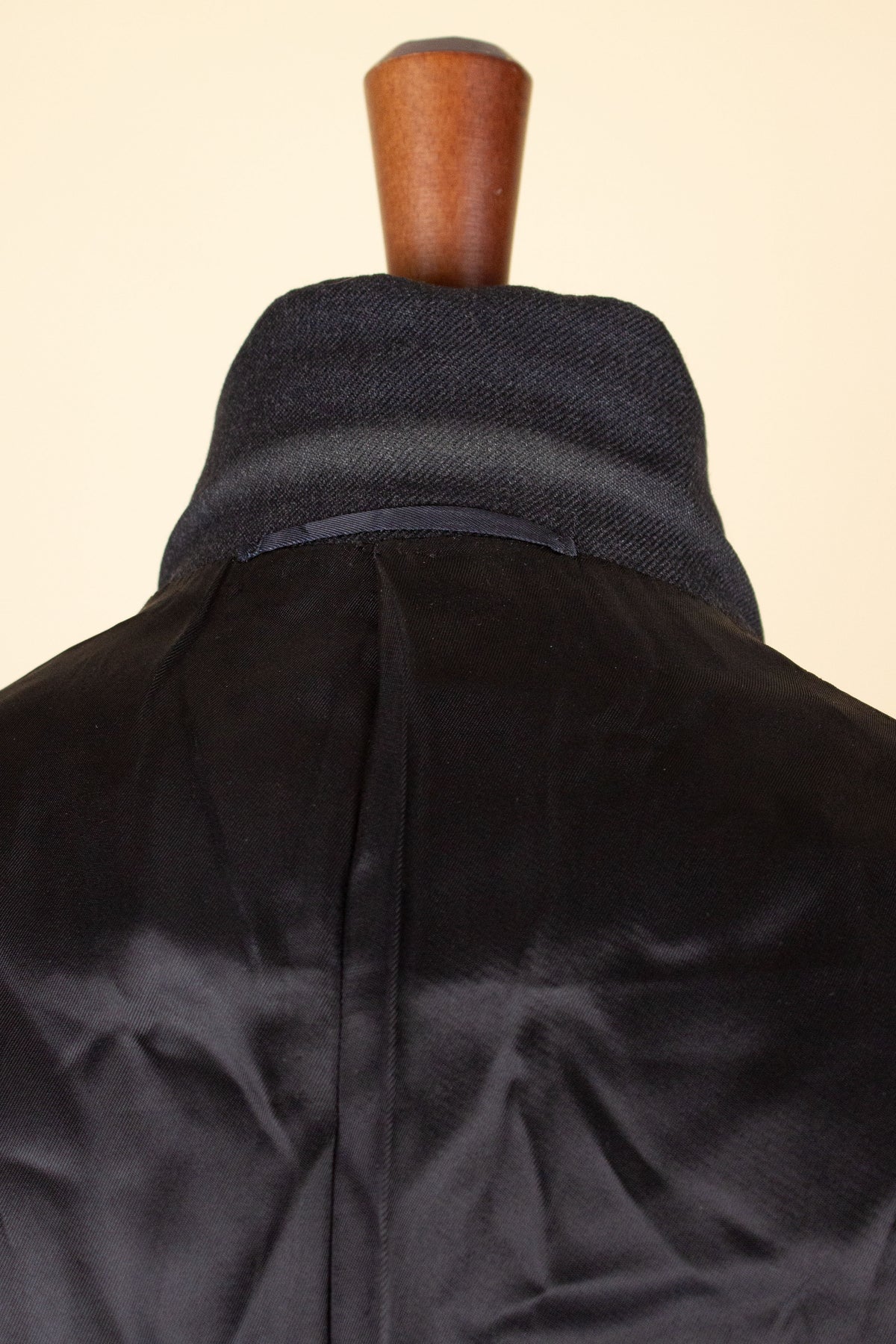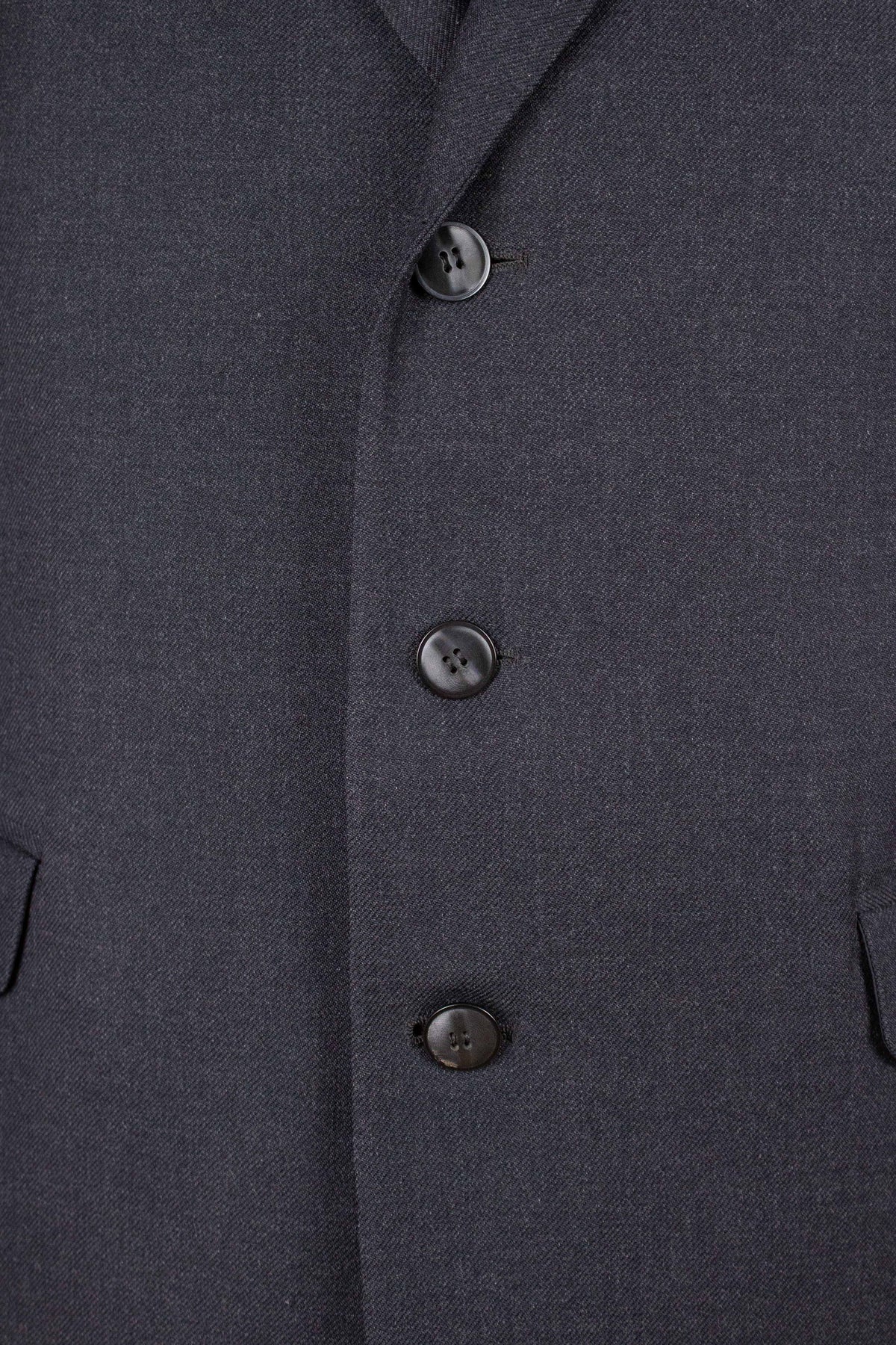 The jacket is single-breasted and fastens with three buttons. It features horizontal front pockets with flaps and a breast pocket. There is a buttonhole on the left lapel. The back is straight and closed, with no vent. As mentioned earlier, the sleeve cuffs have functioning buttonholes. The jacket is fully lined on the inside and has two inner pockets, one on each side.