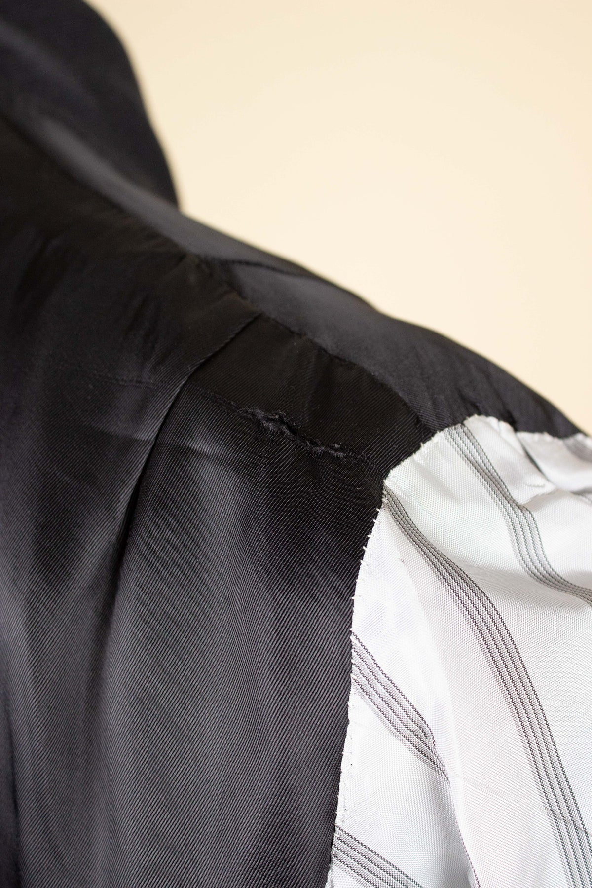 As for the condition, the overall impression is very good. However, on closer inspection of the interior, a few minor imperfections can be found. There is a small tear in the jacket lining, and there are also some discolourations in the lining of both the jacket and trousers. These, however, do not affect the overall impression and are not visible when the suit is worn. From a craftsmanship perspective, it is a very fine suit. Please study the photos to form your own opinion of its condition.
