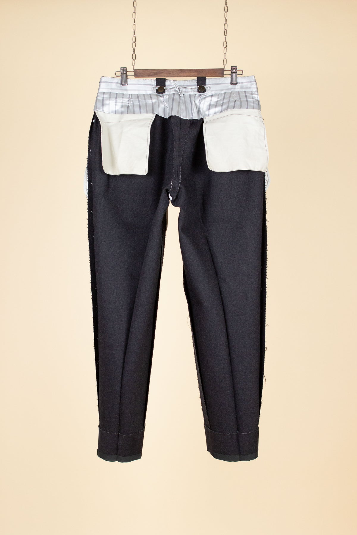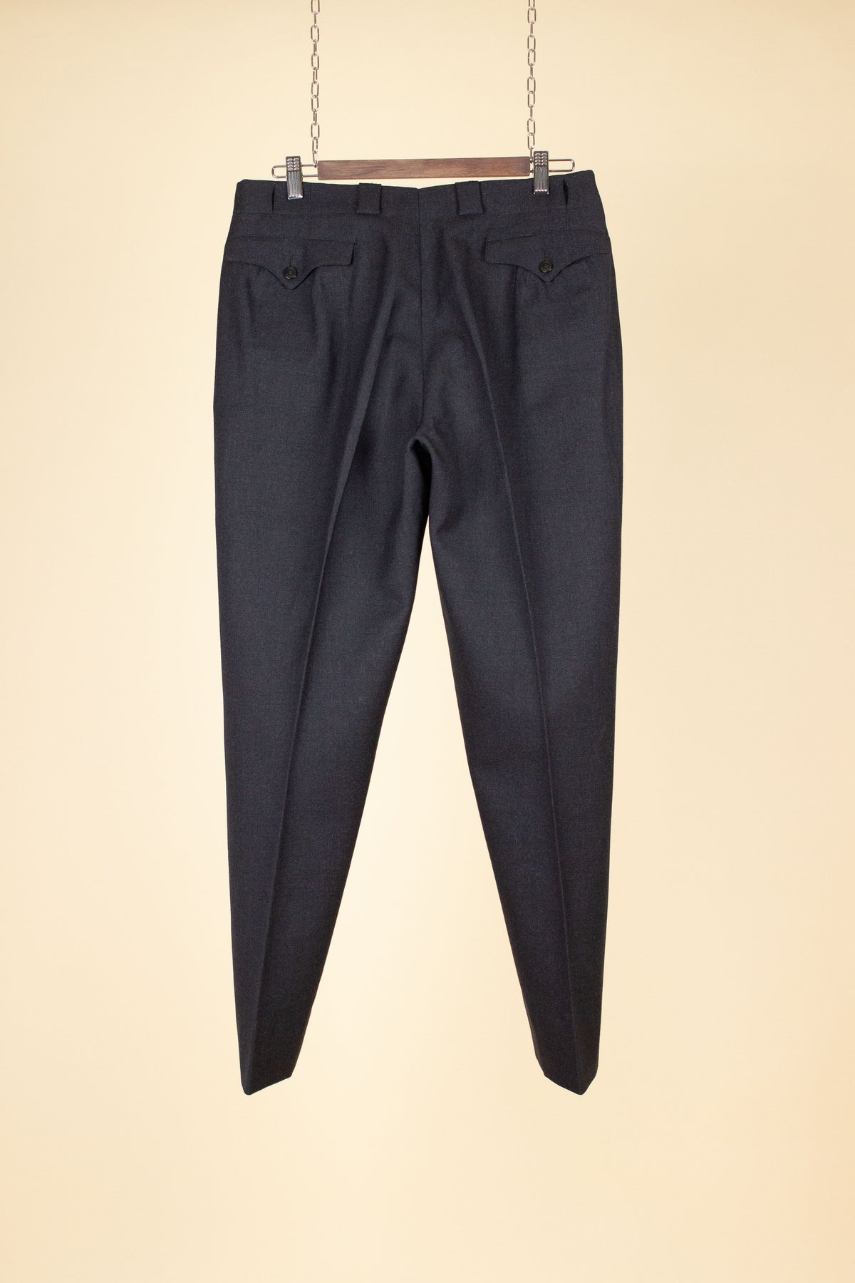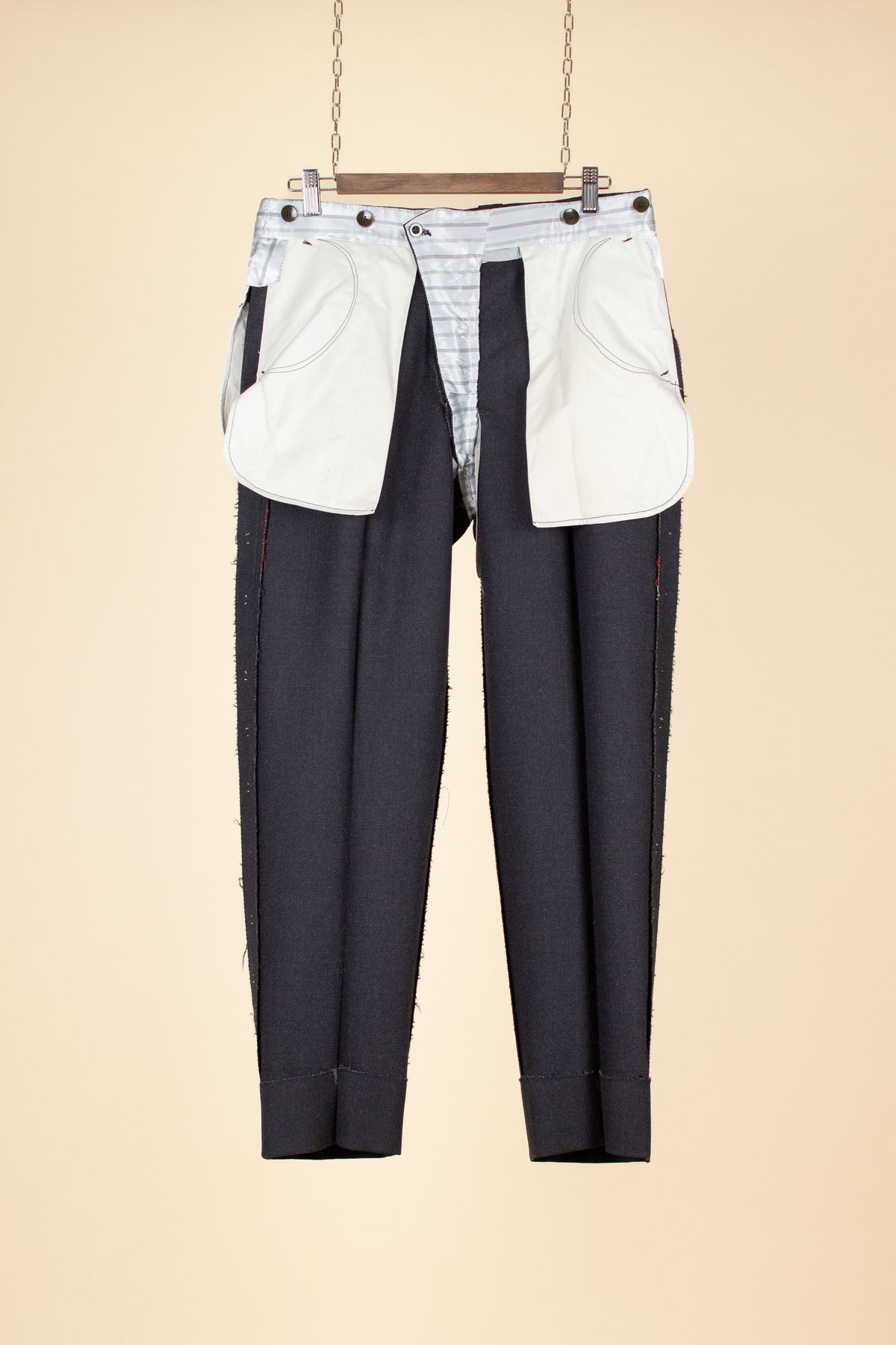 The trousers have double pleats, slightly slanted front pockets, and a so-called belt tunnel design, meaning that any belt would be partially hidden in a channel along the waistband. On the inside of the waistband, there are buttons for braces, and the fly is buttoned. At the back, there is one pocket on each side, both with flaps and button closures.