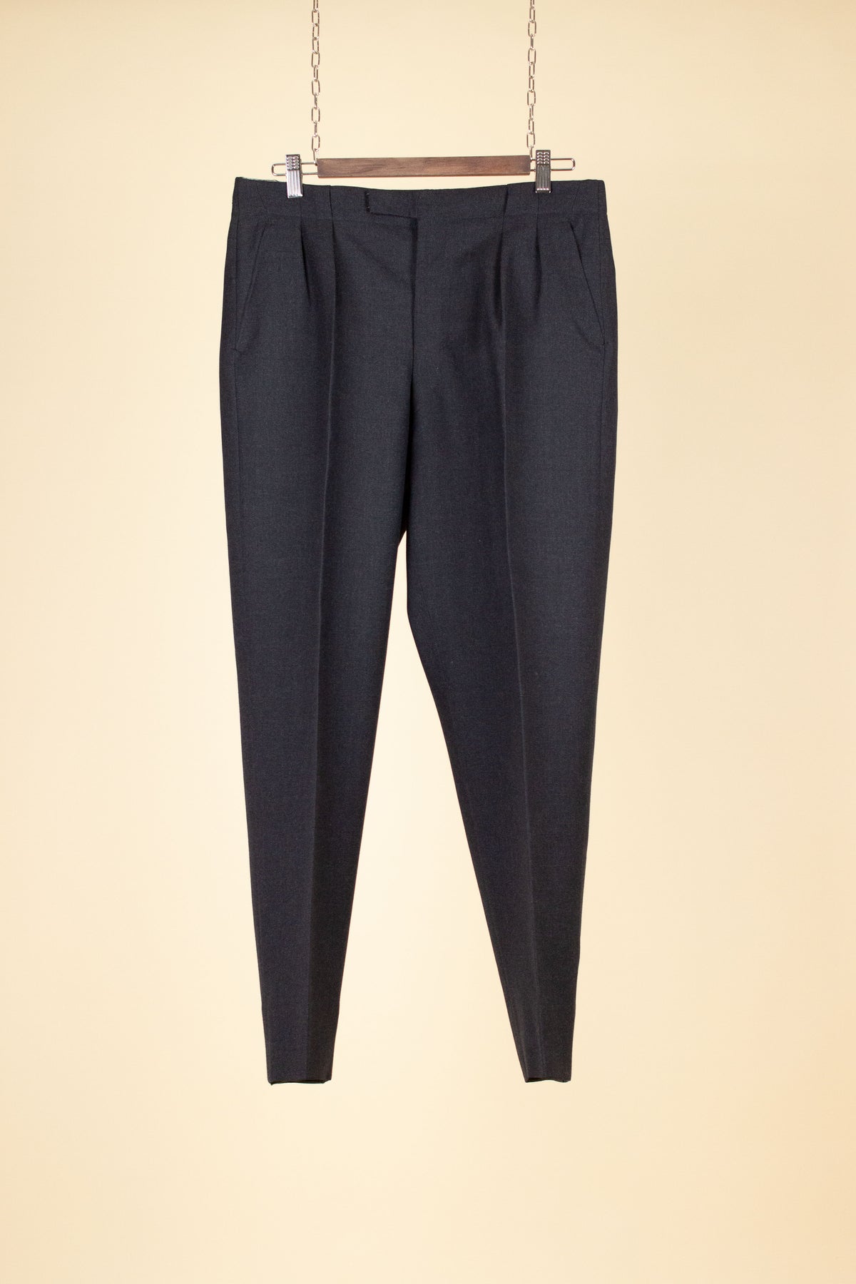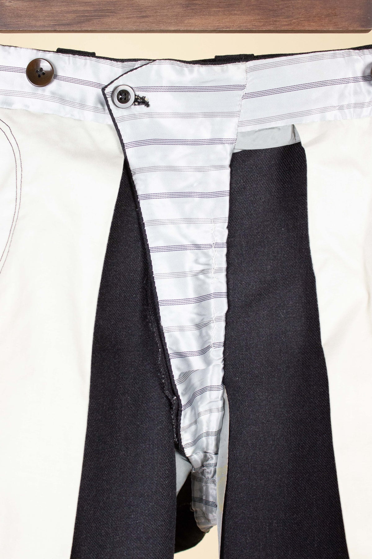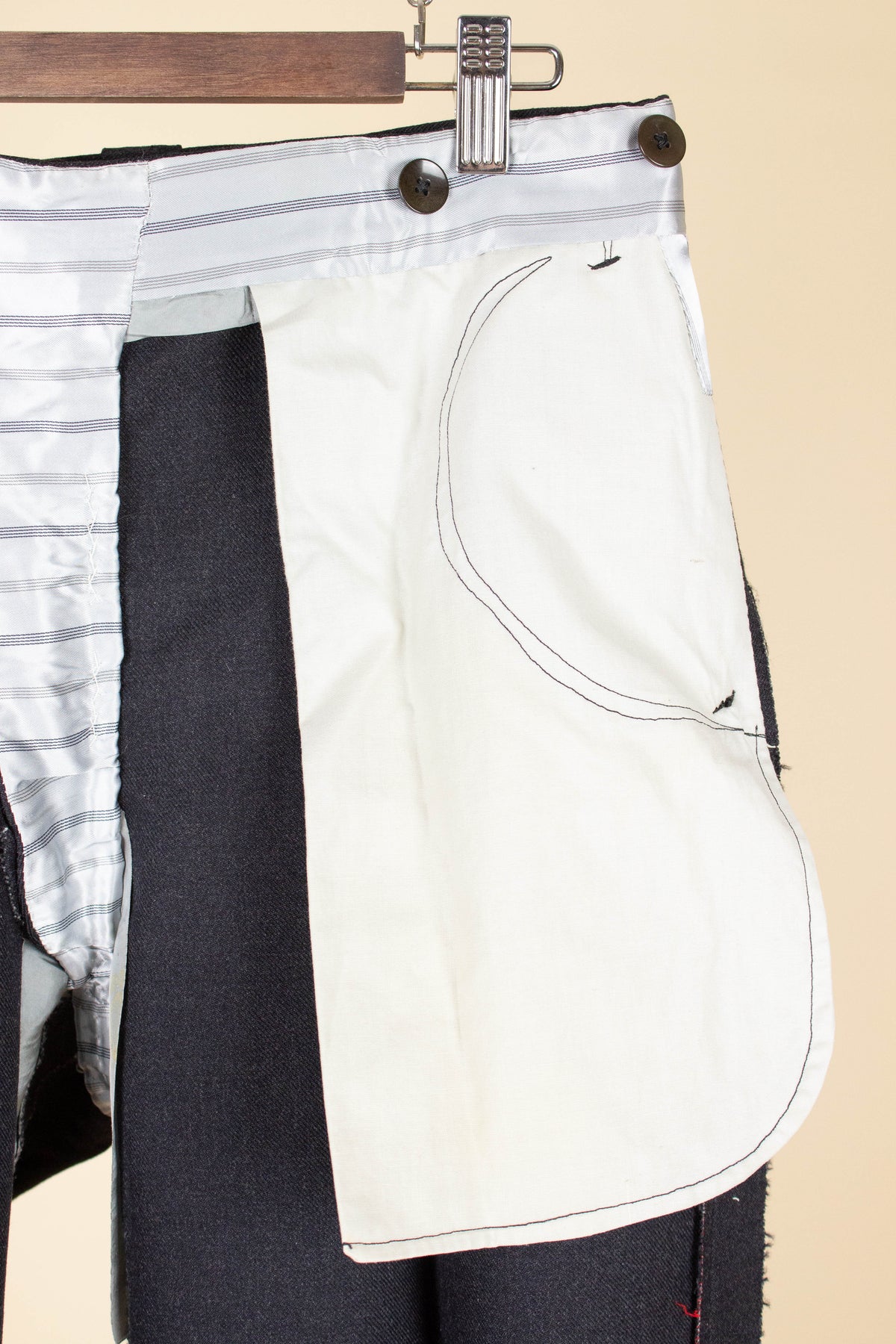 The trousers have double pleats, slightly slanted front pockets, and a so-called belt tunnel design, meaning that any belt would be partially hidden in a channel along the waistband. On the inside of the waistband, there are buttons for braces, and the fly is buttoned. At the back, there is one pocket on each side, both with flaps and button closures.