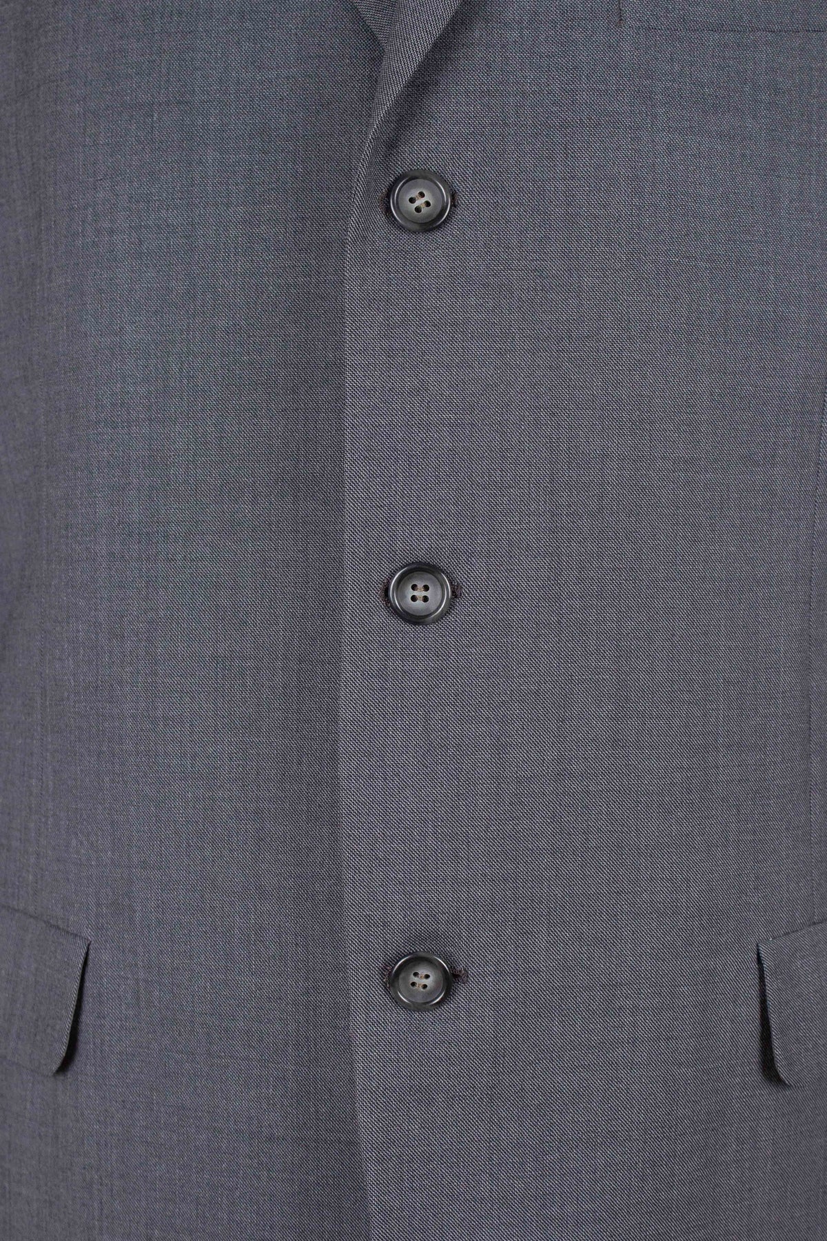 The jacket is single-breasted and fastens with three buttons. It features horizontal front pockets with flaps and a breast pocket. There is a buttonhole on the left lapel. The back is straight with a single vent — a short one, which we would also describe as a typically American feature. As mentioned, the interior is fully lined and has two inner pockets, one on each side — the left one with a button fastening and flap.