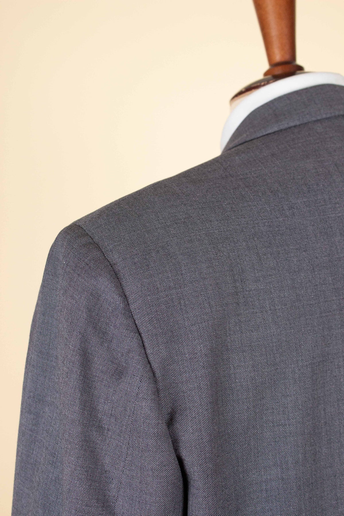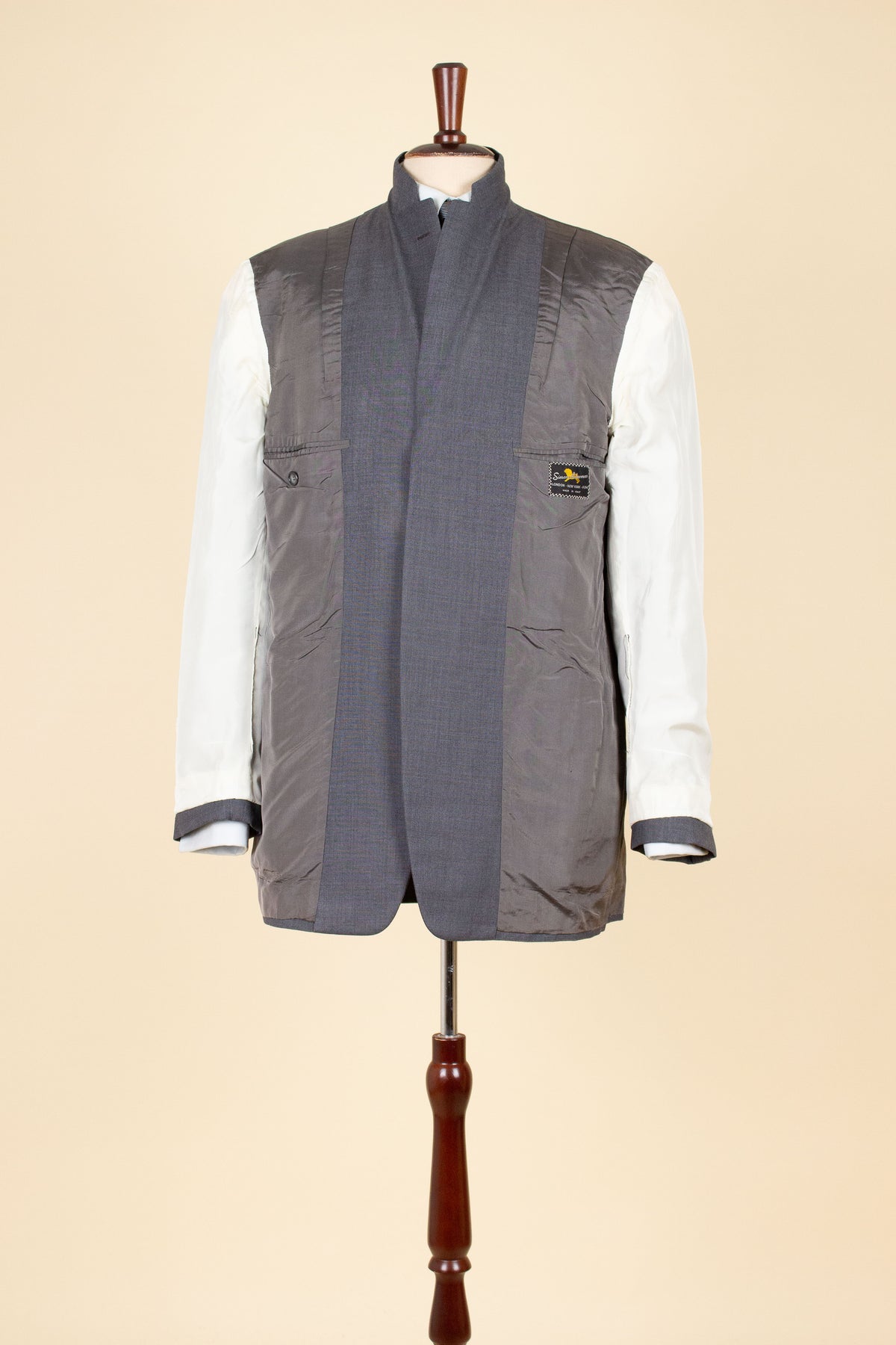 According to its label, this suit was made in Italy. The brand is Simon Ackerman, a chain whose shops were primarily based in the United States, so it is quite possible that this suit was originally sold there — though we can only speculate. In its overall character, it feels distinctly American, apart from the fact that the jacket is fully lined; at the time, American jackets were more commonly half-lined. It is made from a medium-grey fabric that is somewhat lighter than the cloth typically seen in Swedish suits from the same era, making it quite suitable as a summer suit.