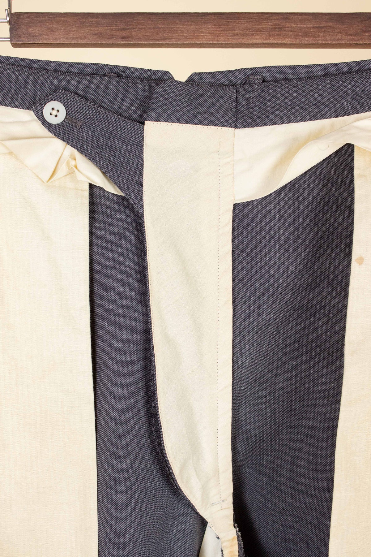Based on the chest measurement alone, the jacket sits between a EU 48 (US/UK 38) and a EU 50 (US/UK 40). However, we believe the suit as a whole would best fit someone who wears a EU 50 (US/UK 40), as the trouser waist corresponds well to that size. Please scroll down for exact measurements and seam allowances.