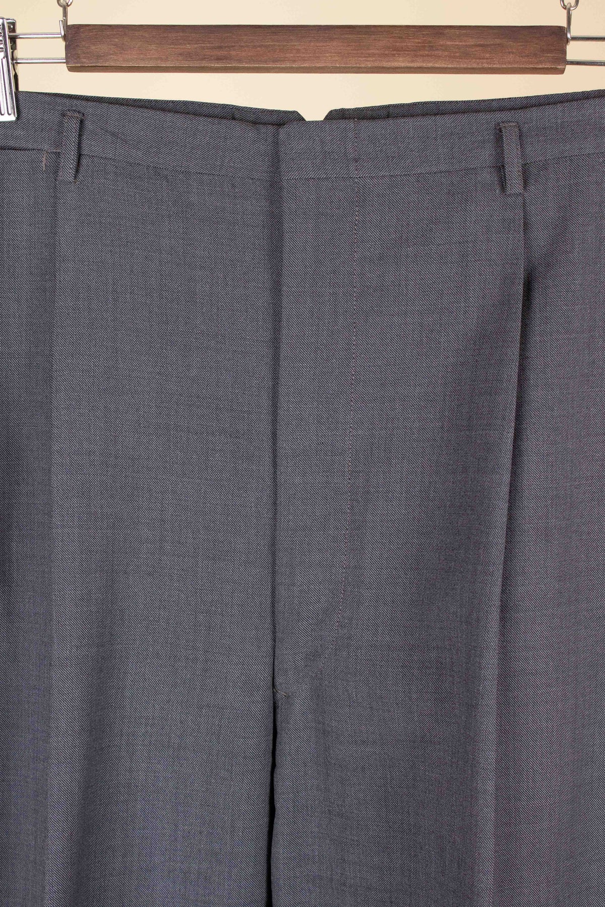 The trousers have double front pleats and vertical side pockets. They are fitted with a zip fly and belt loops. The hems are turned up. At the back, they have the somewhat unusual combination of one pocket with flap and button fastening (left) and one jetted pocket (right).