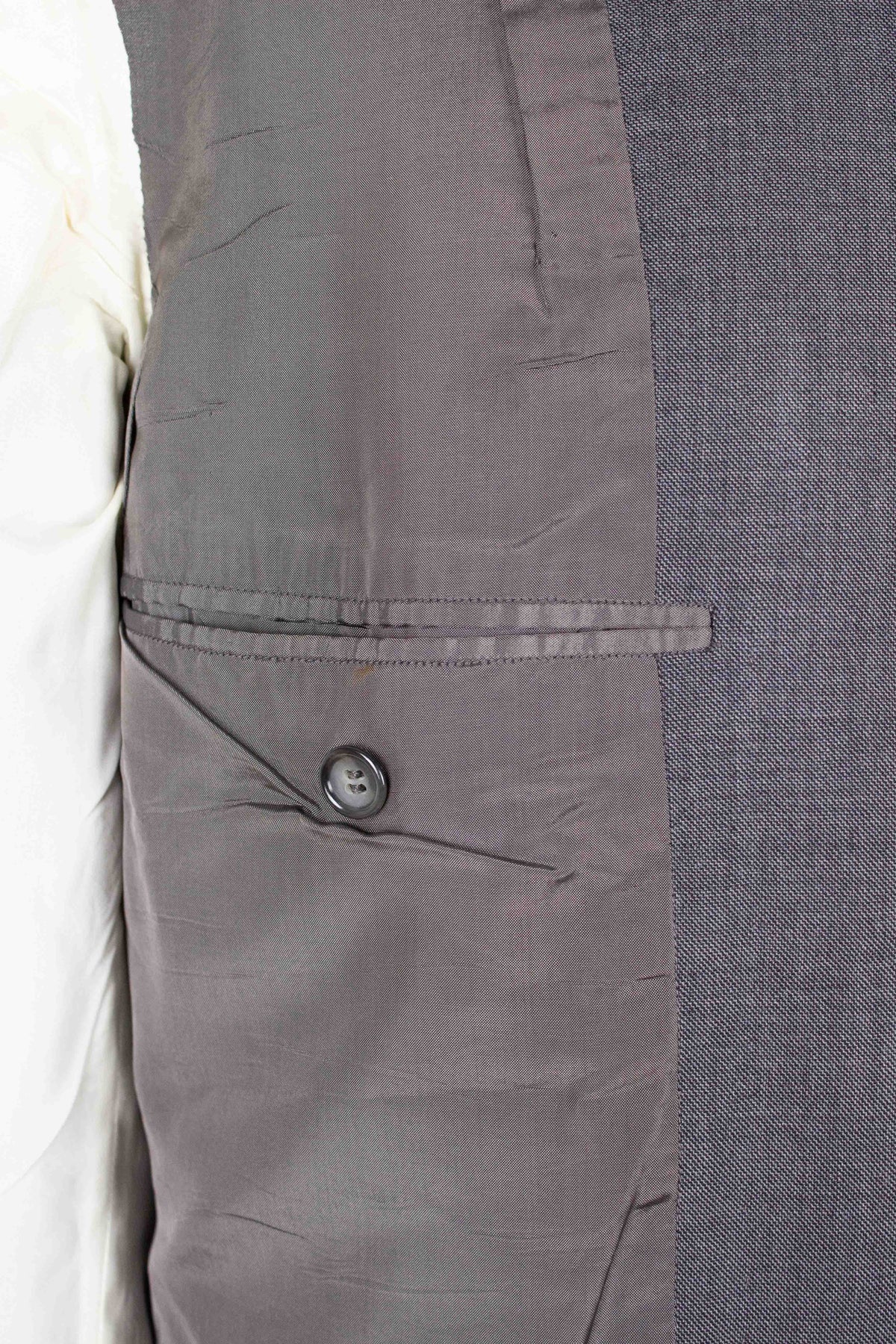 The overall condition is good, though not flawless. There is a small imperfection in the fabric near the bottom of the right sleeve. There are also some light discolourations in the jacket’s underarms and the trouser lining. None of these minor flaws affect the overall impression. Please study the photos carefully to form your own view of the condition.