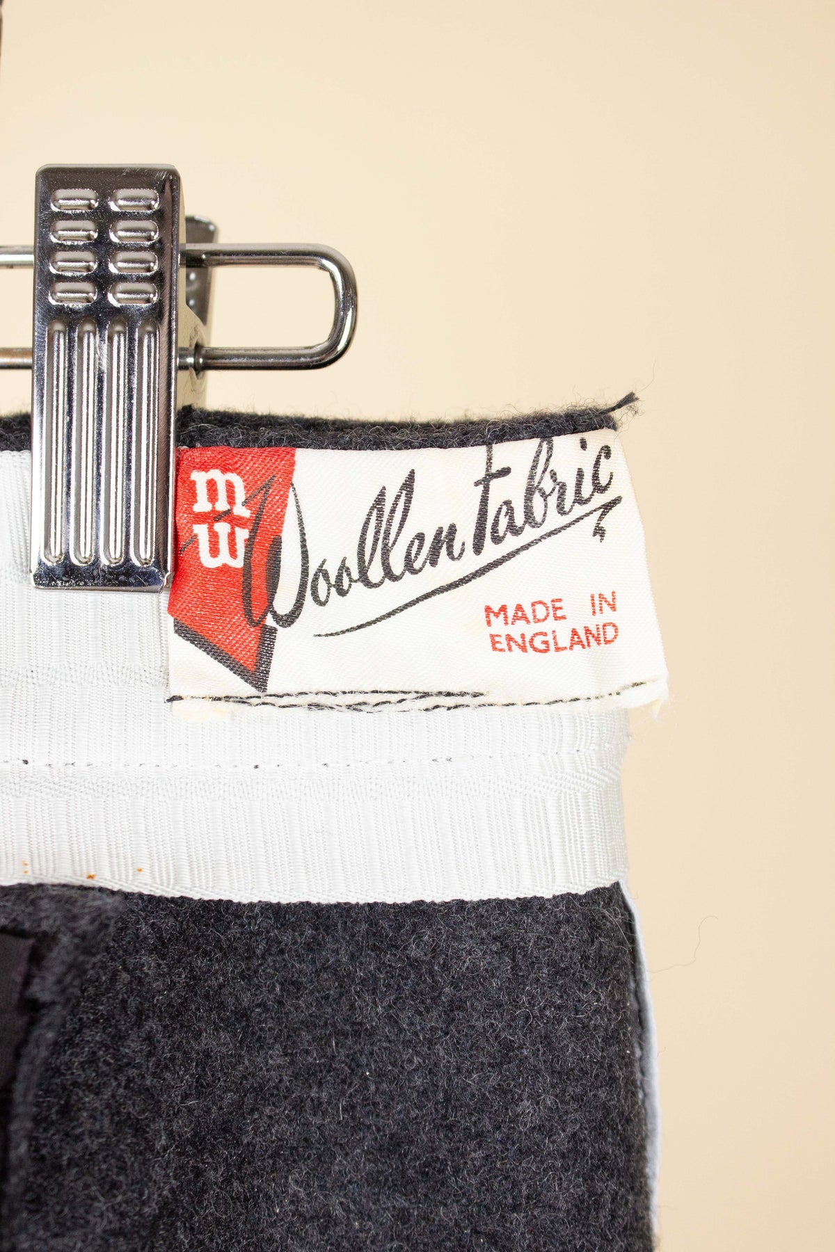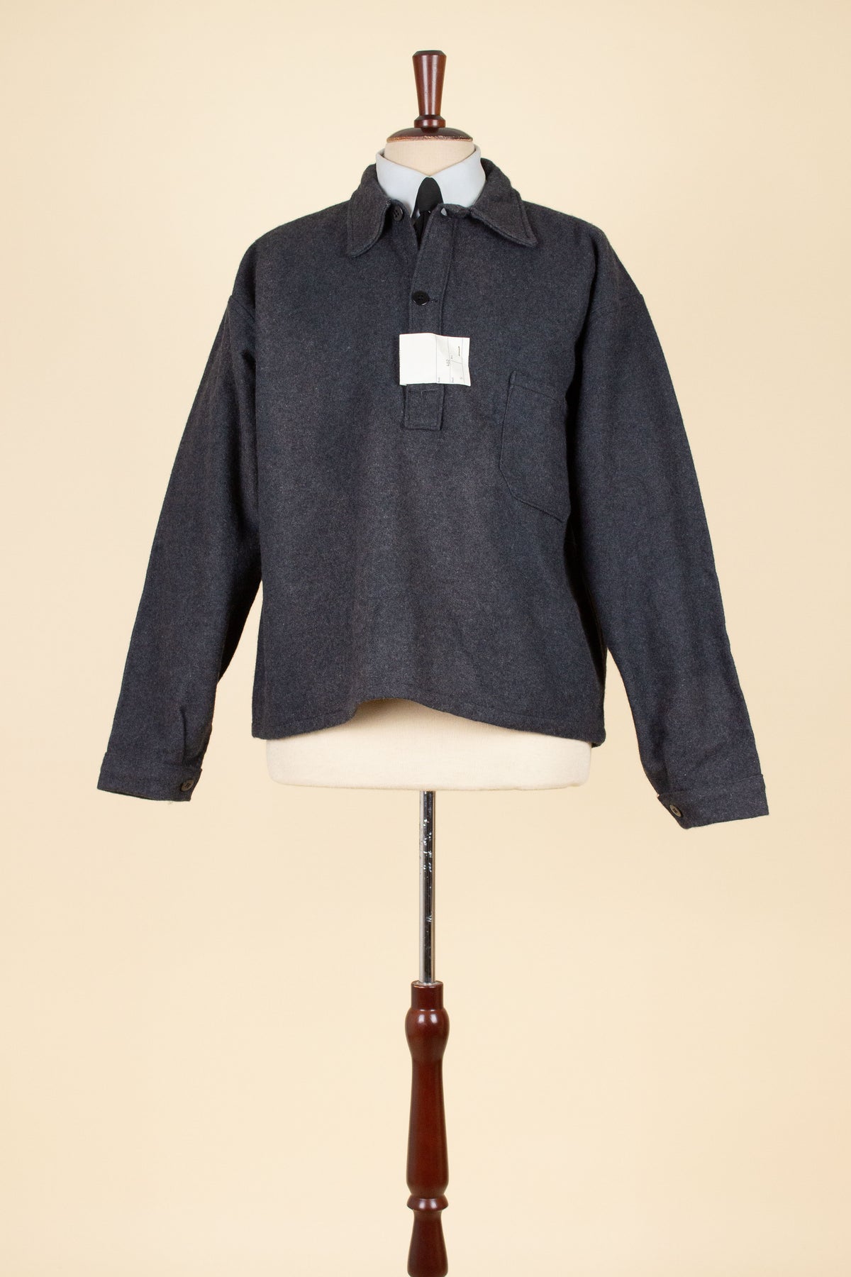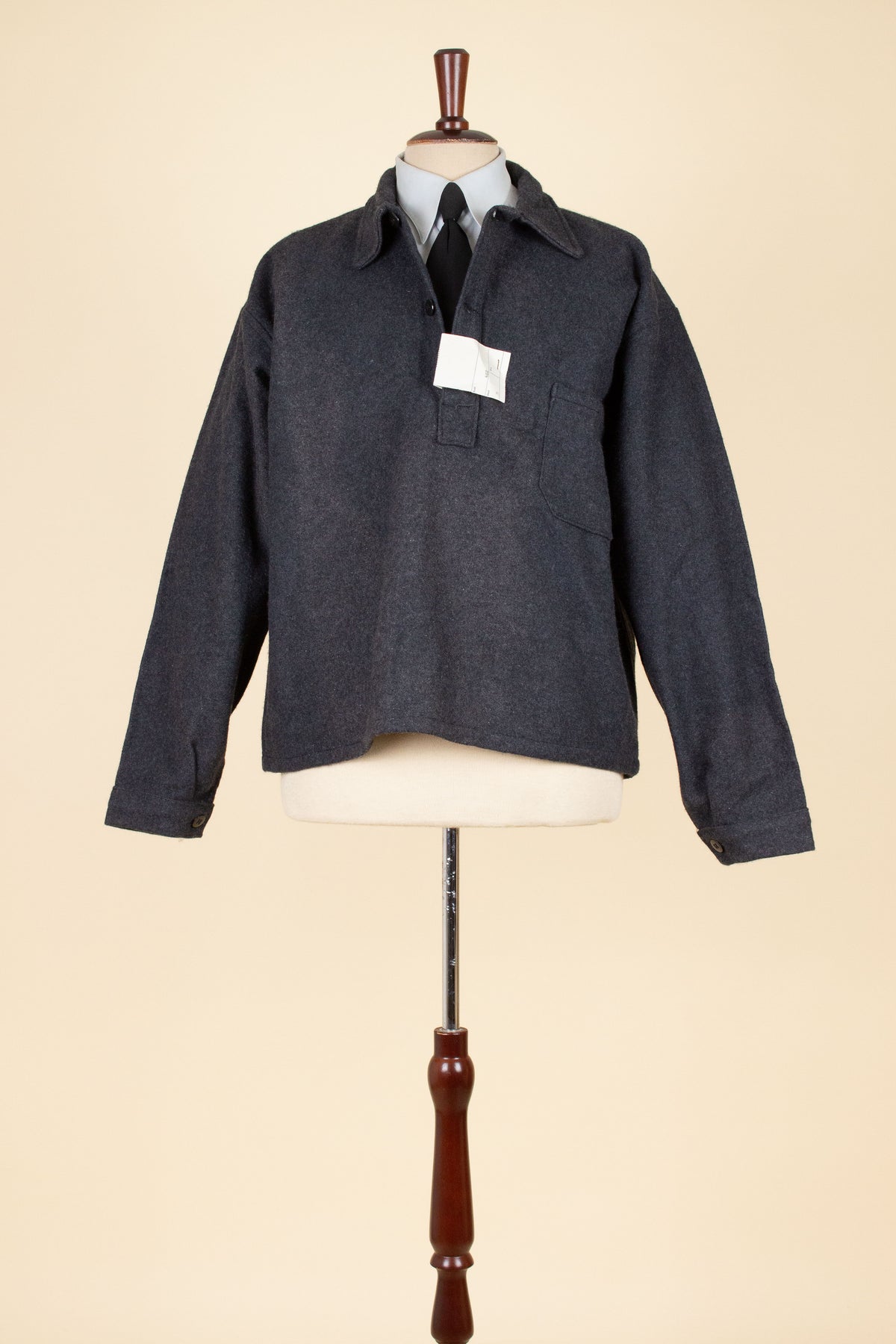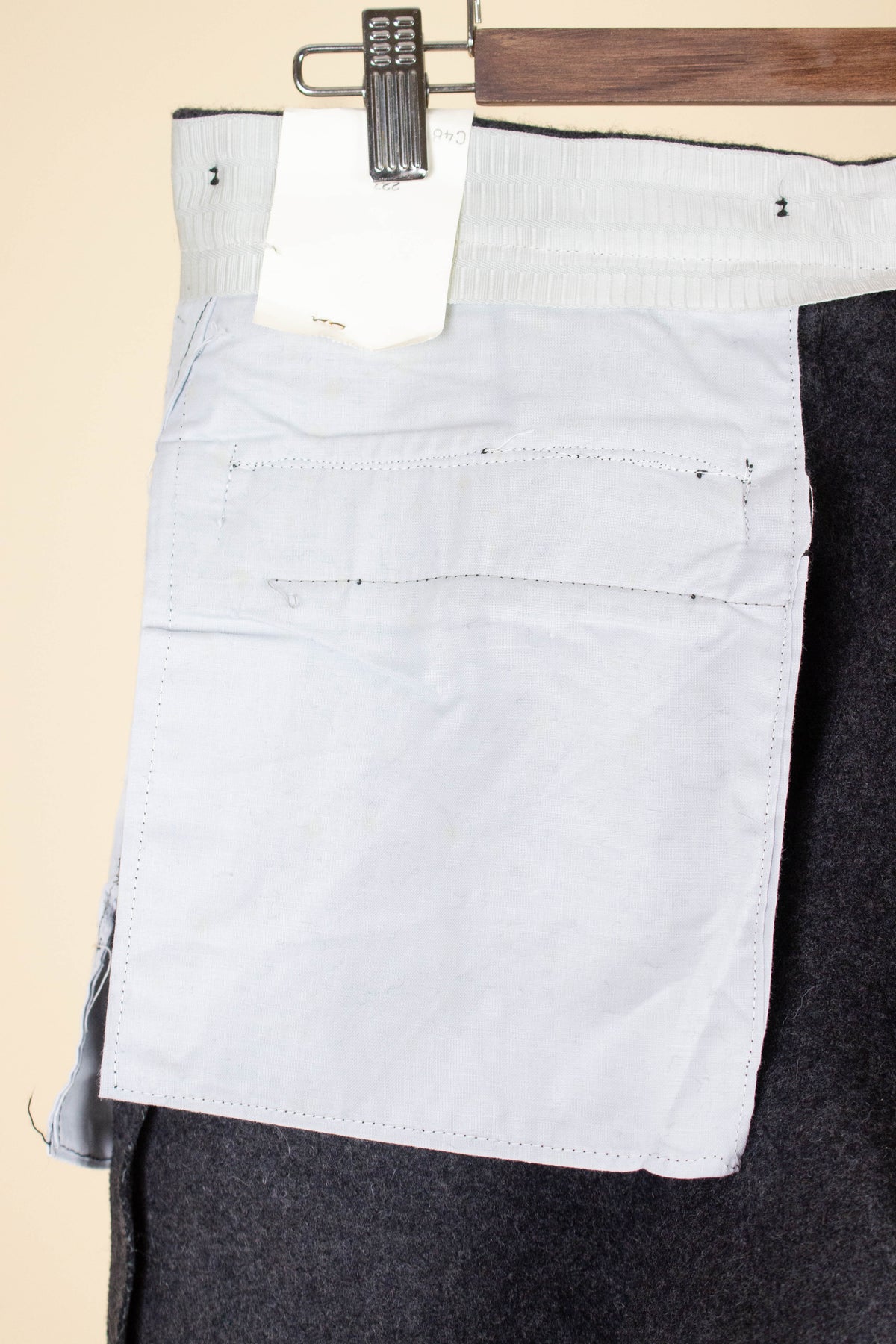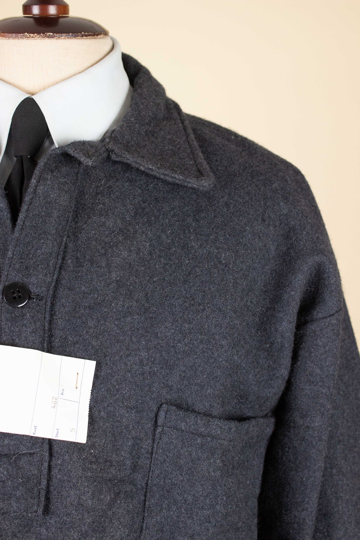 This workwear set is of Swedish origin. The manufacturer is not stated, but the design of the labels makes it clear that it is Swedish. It was most likely produced during the 1950s. The fabric is a heavy dark grey broadcloth, made in England. It is deadstock - completely unworn - and still has its original tags attached to both the top and the trousers.