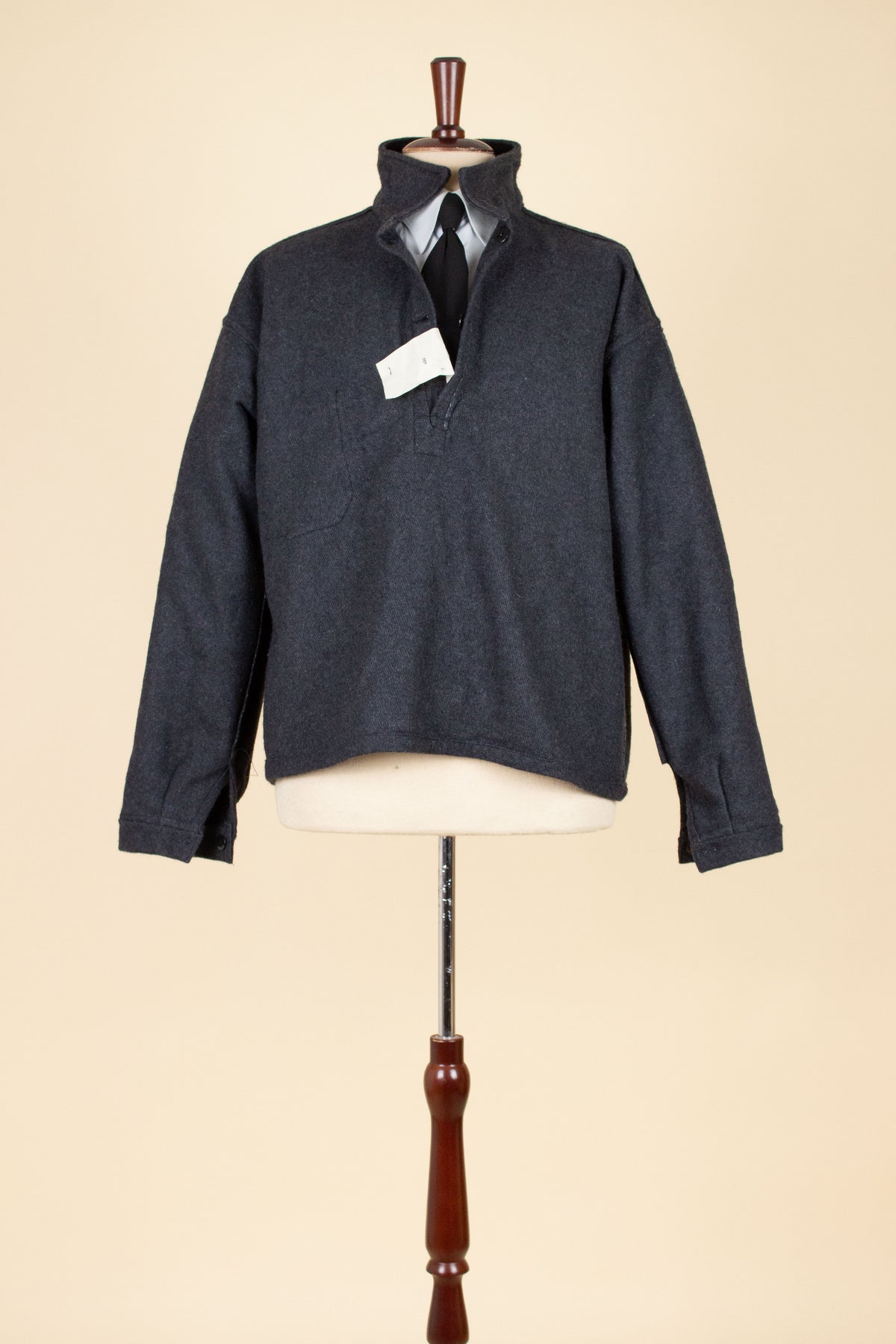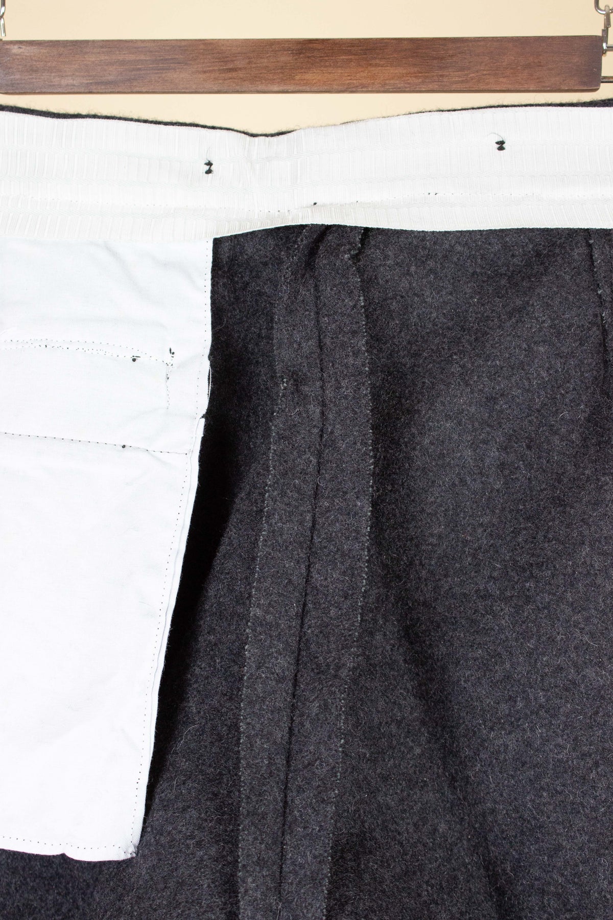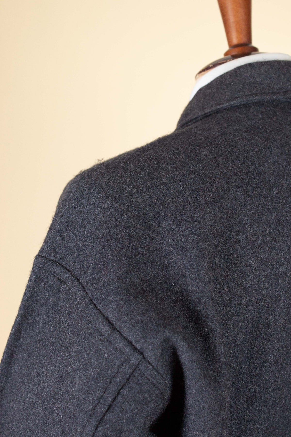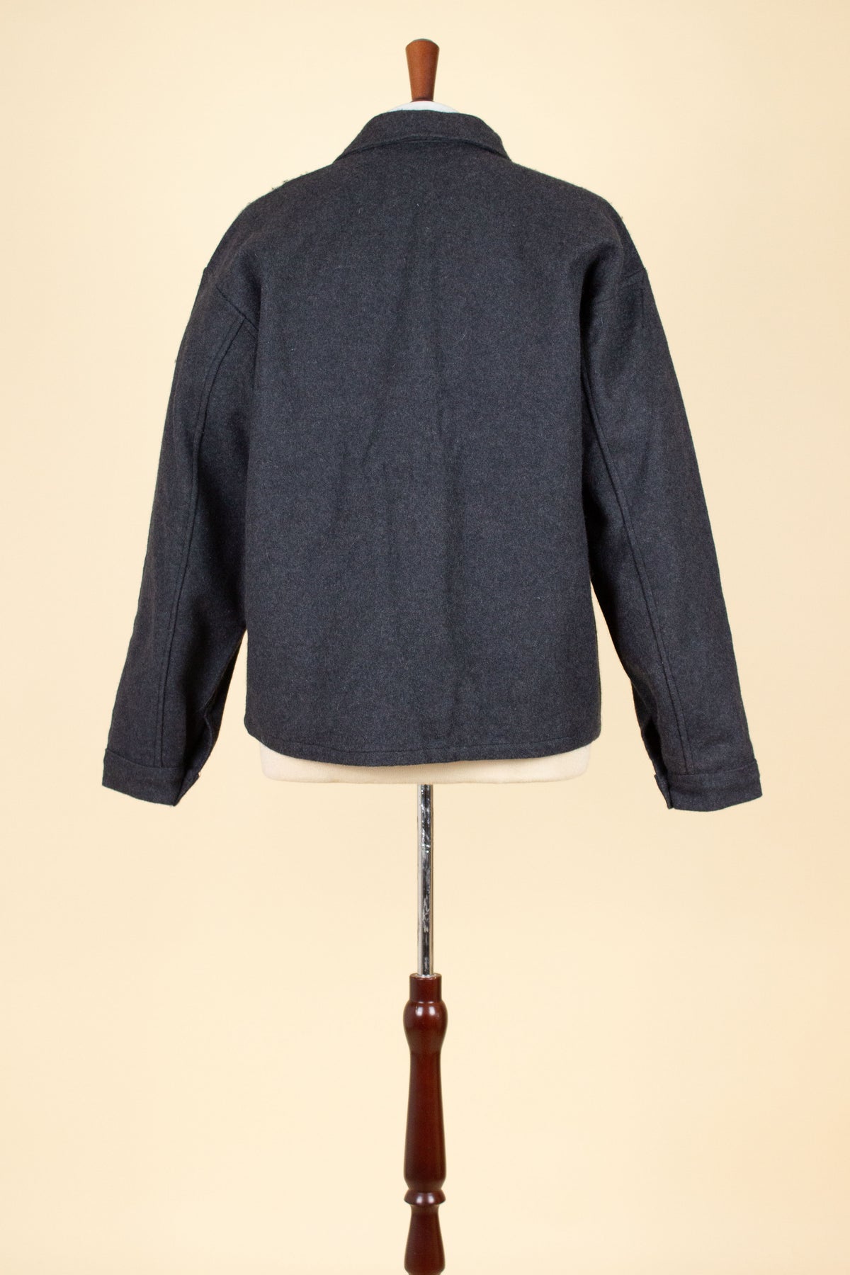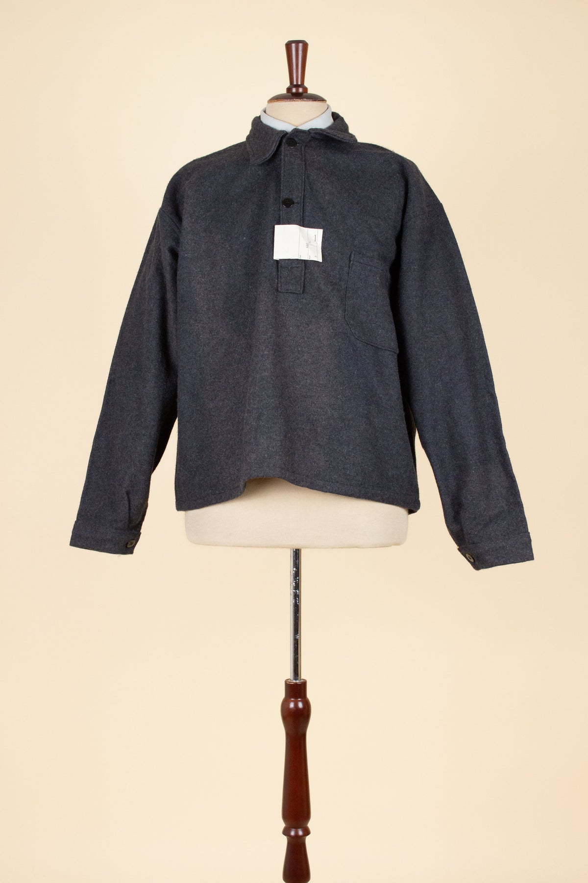 This workwear set is of Swedish origin. The manufacturer is not stated, but the design of the labels makes it clear that it is Swedish. It was most likely produced during the 1950s. The fabric is a heavy dark grey broadcloth, made in England. It is deadstock - completely unworn - and still has its original tags attached to both the top and the trousers.