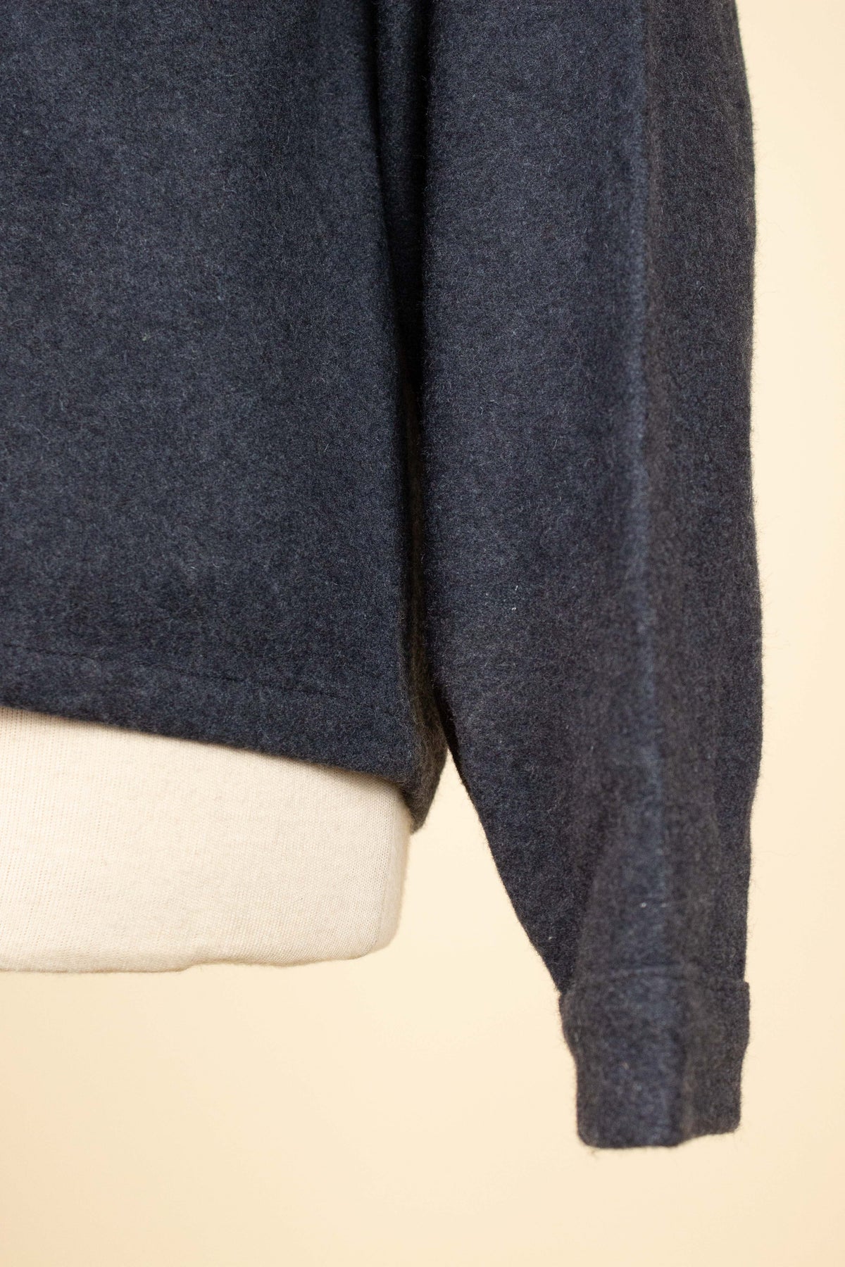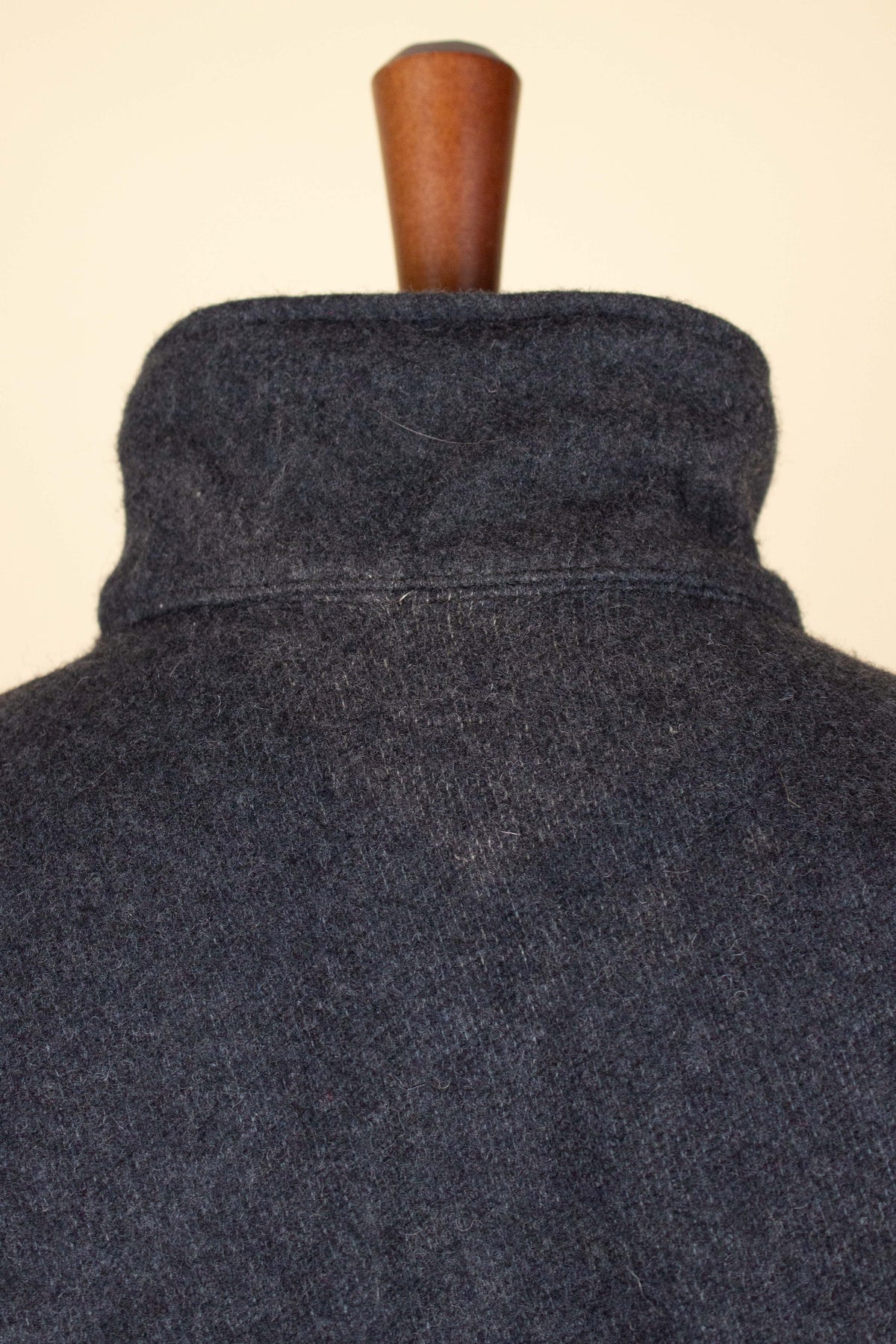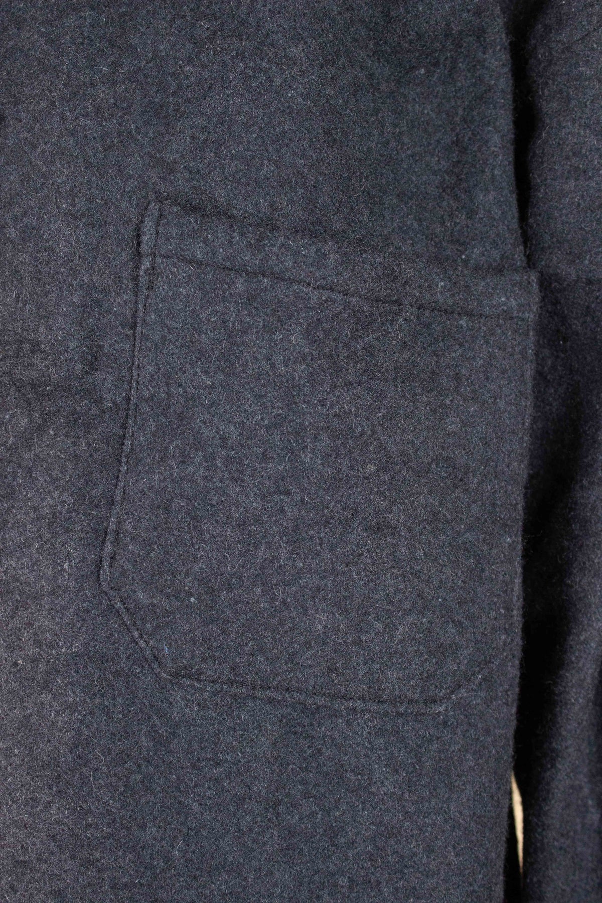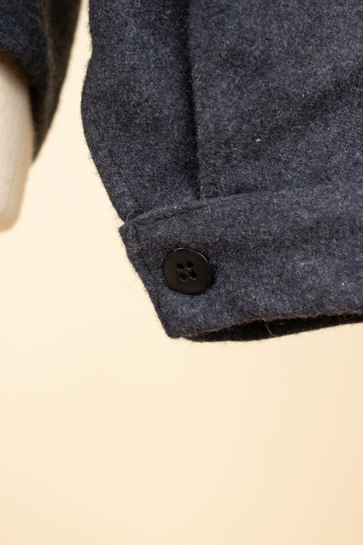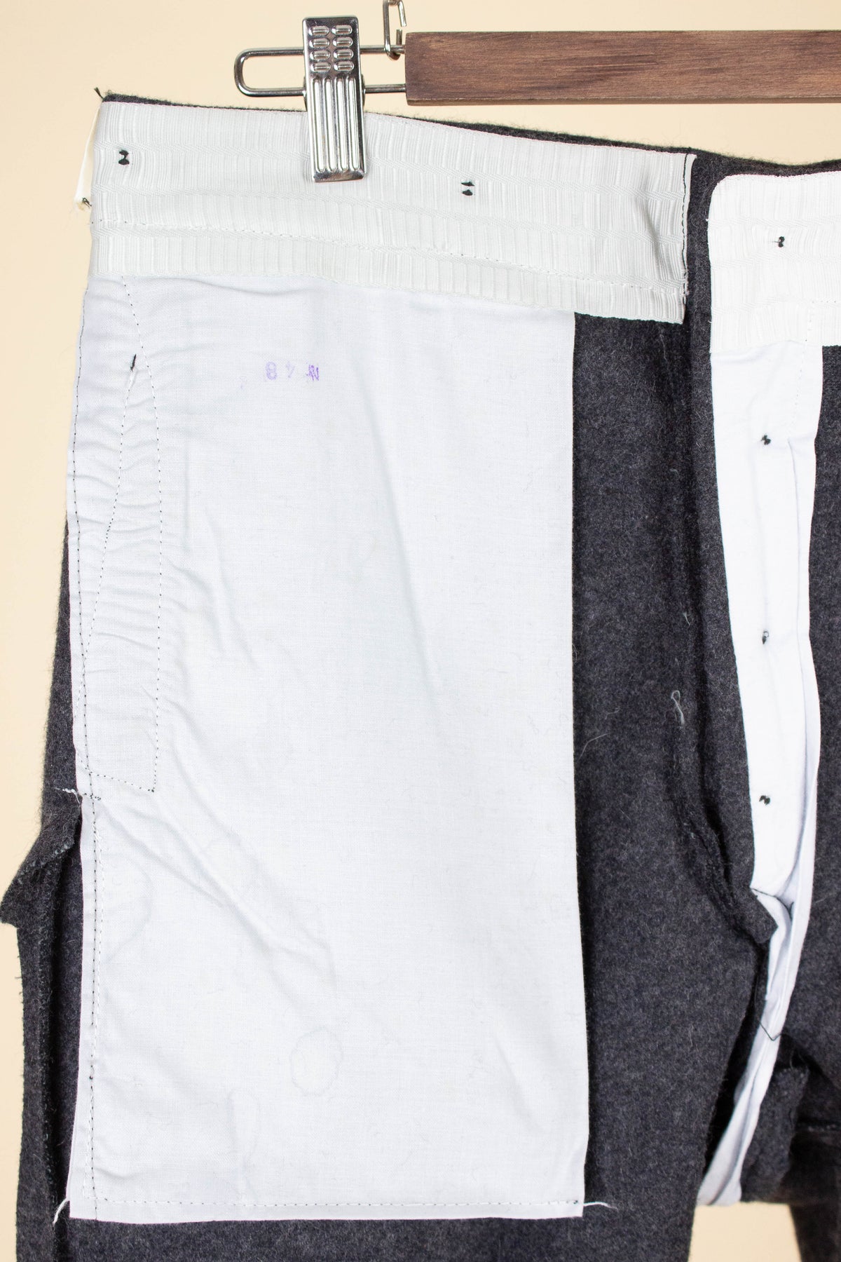 This workwear set is of Swedish origin. The manufacturer is not stated, but the design of the labels makes it clear that it is Swedish. It was most likely produced during the 1950s. The fabric is a heavy dark grey broadcloth, made in England. It is deadstock - completely unworn - and still has its original tags attached to both the top and the trousers.
