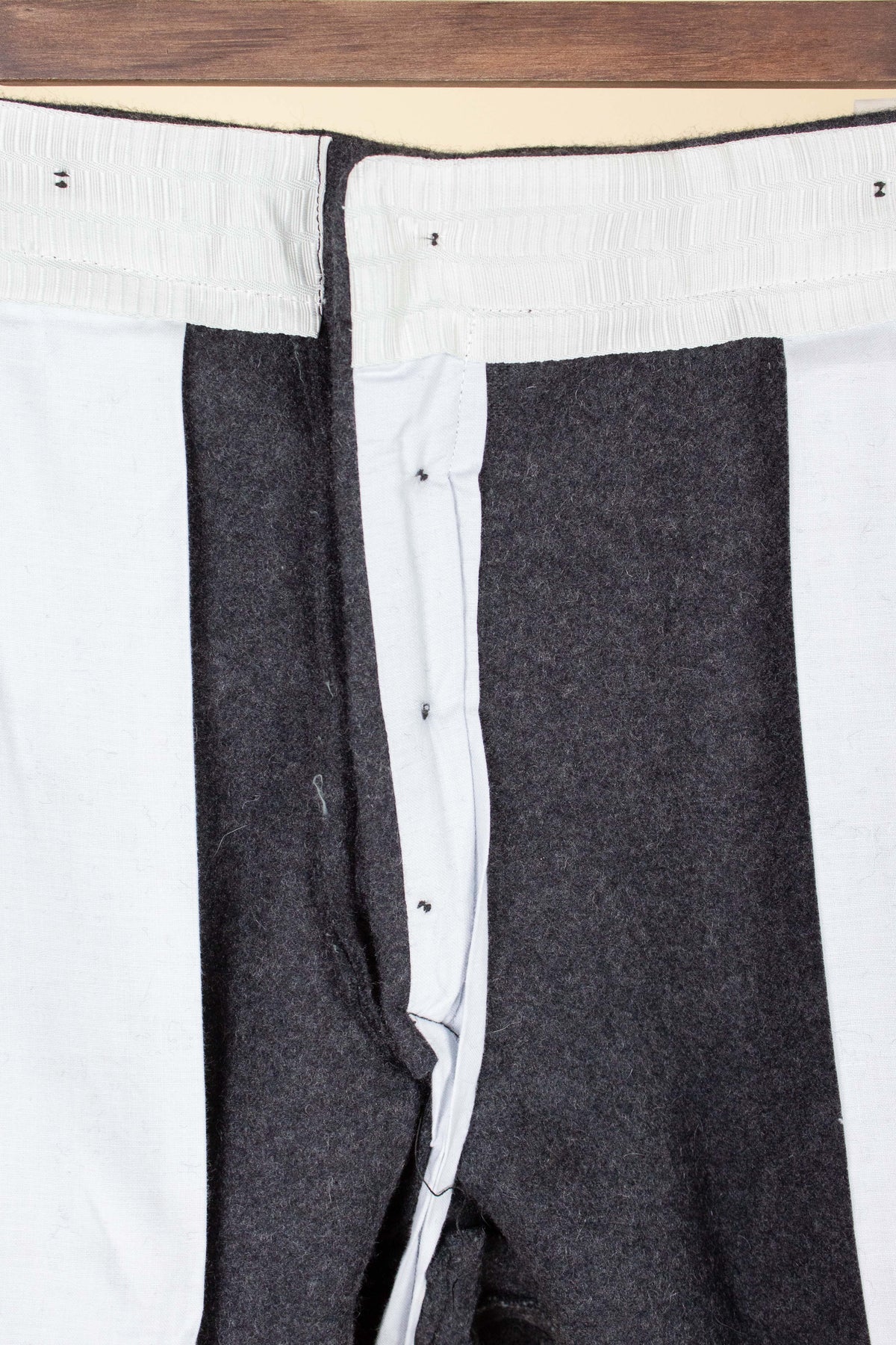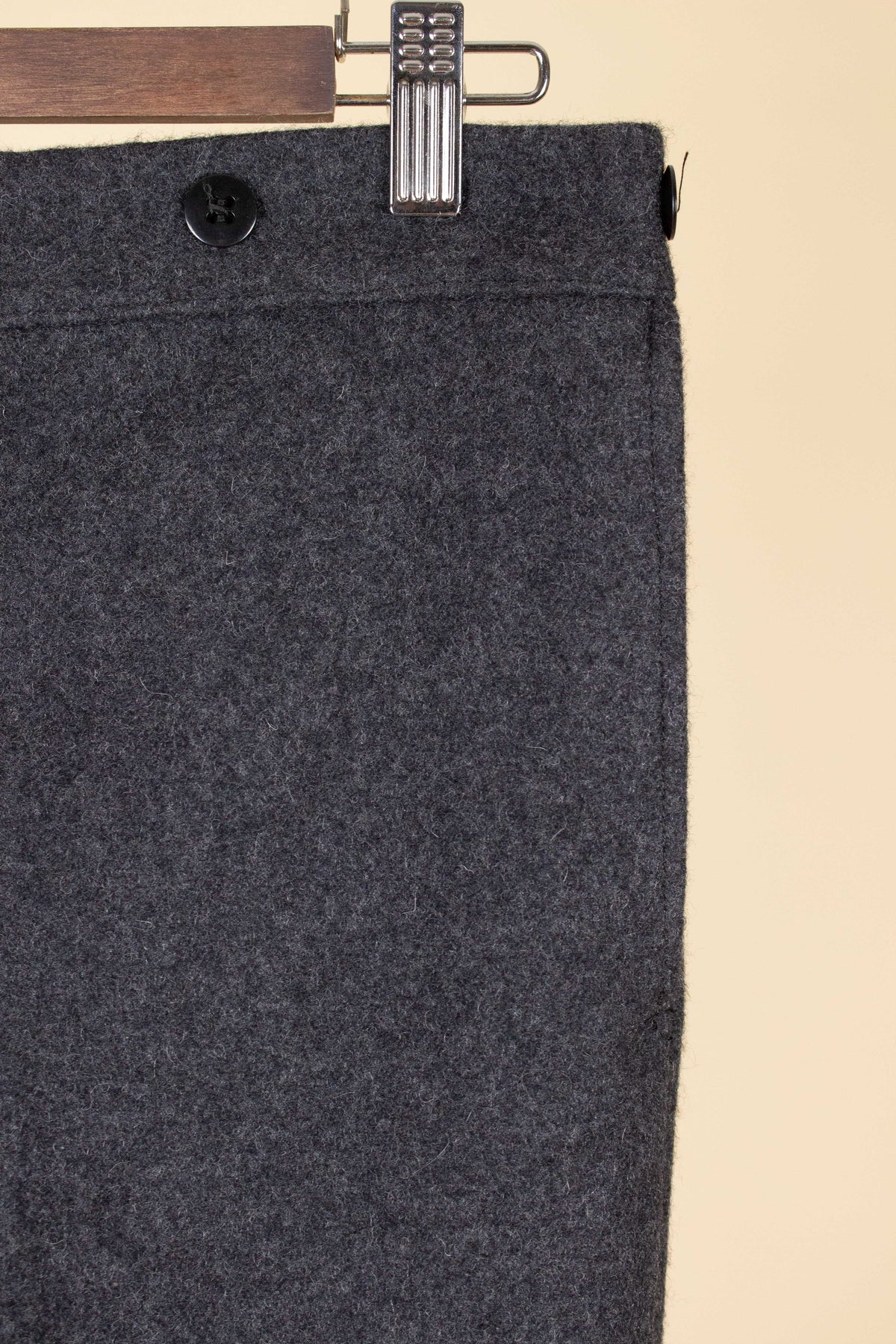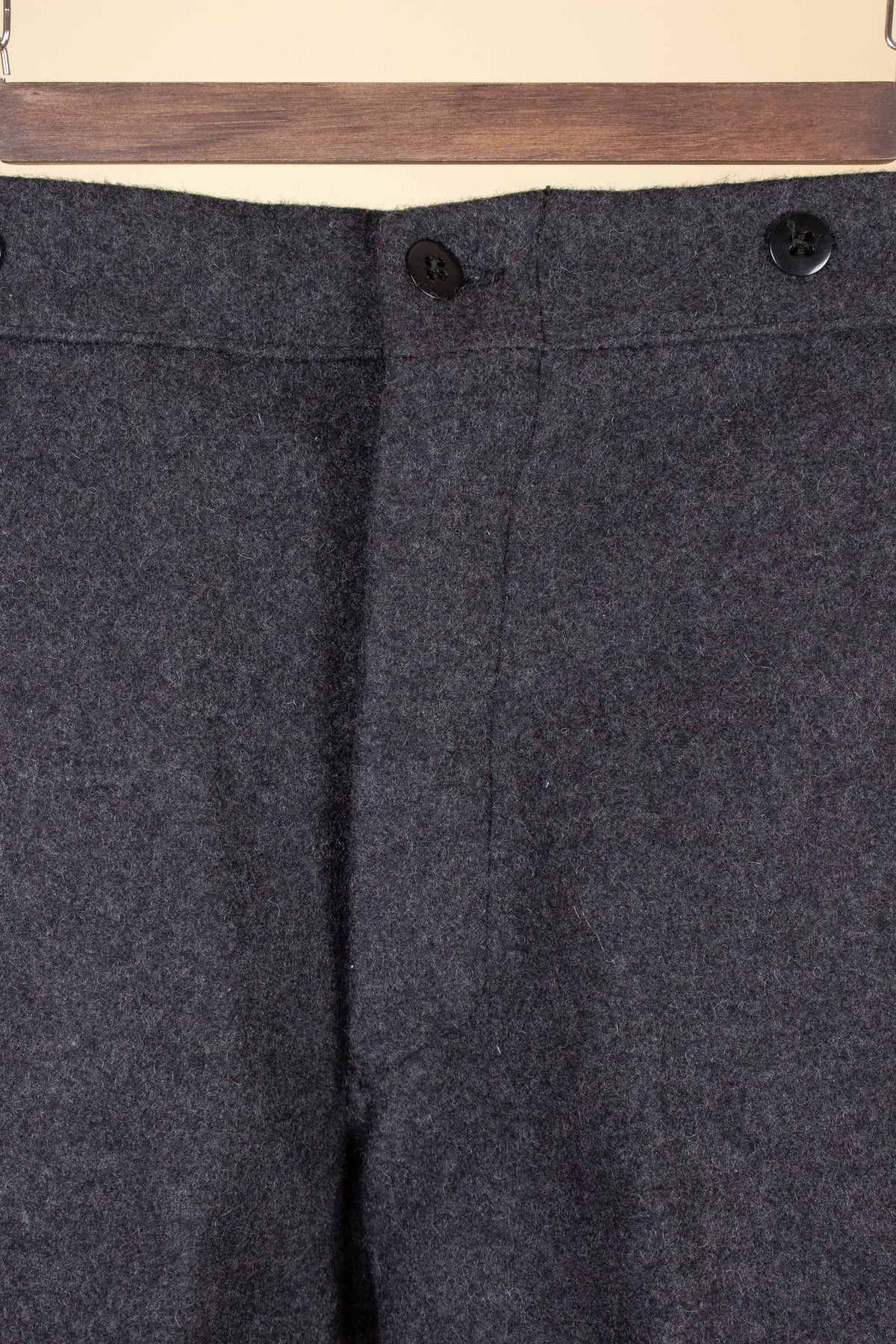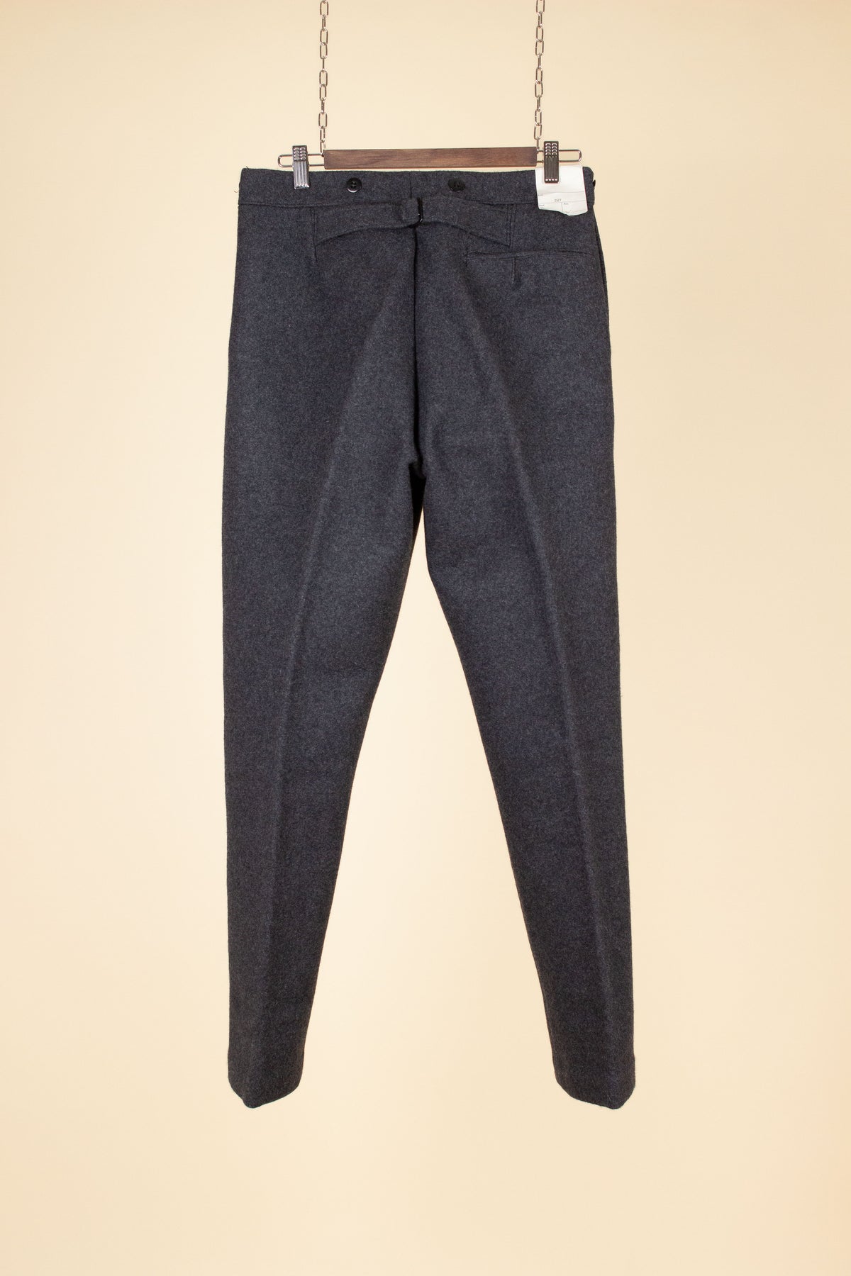 The trousers are flat-fronted with vertical side pockets and a button fly. They have buttons for braces on the outside of the waistband. At the back, there is a single pocket on the left side and a solid metal buckle for size adjustment.