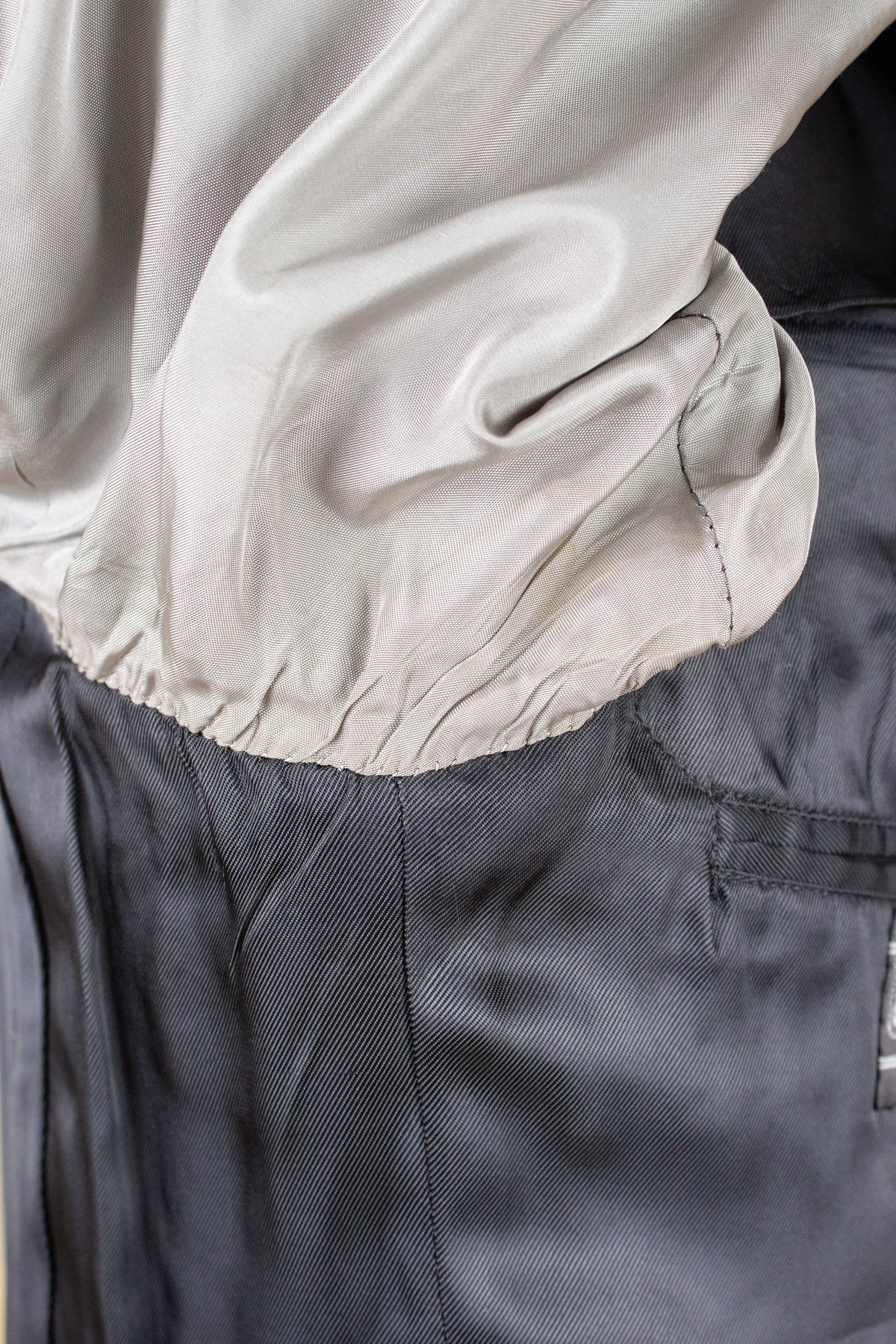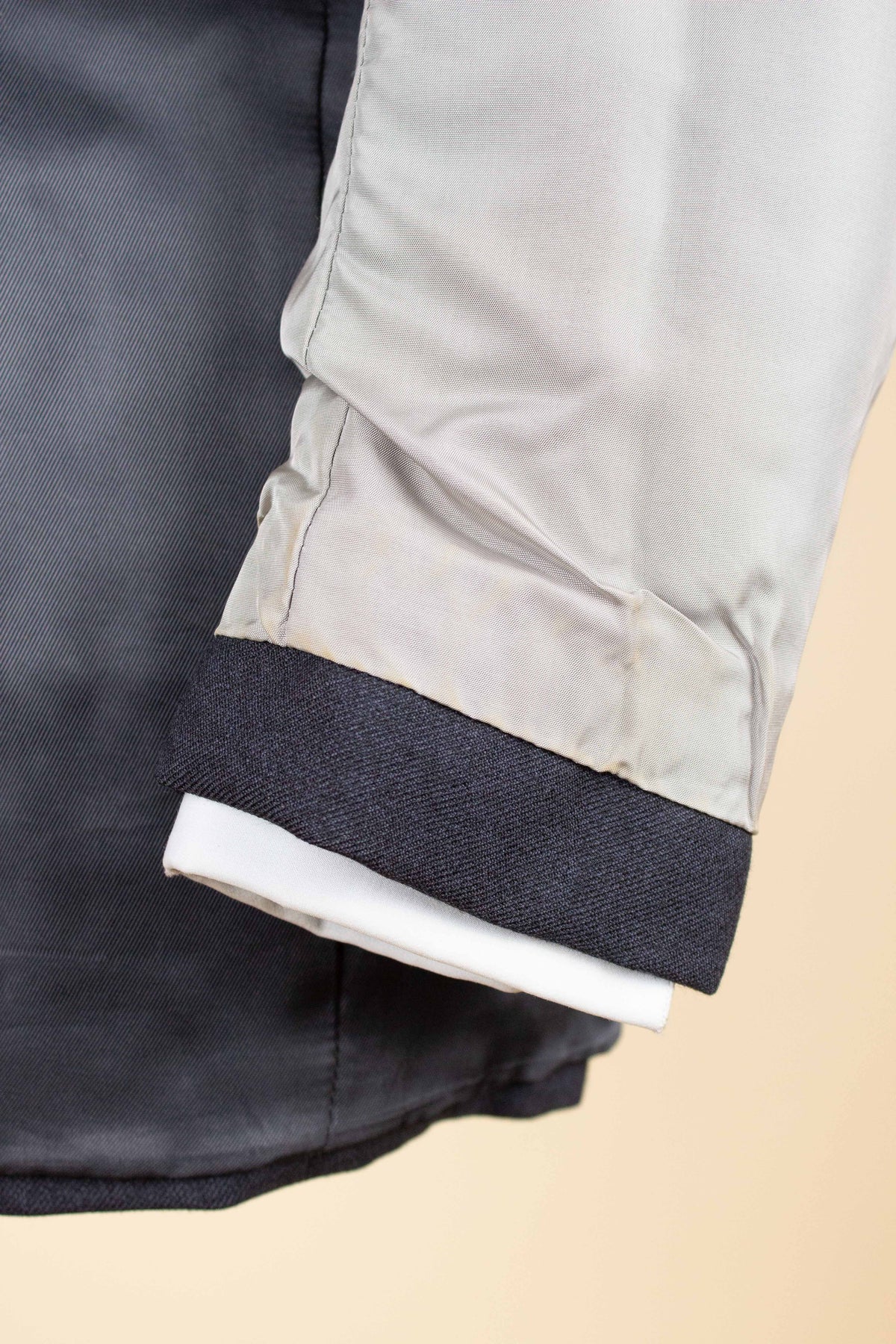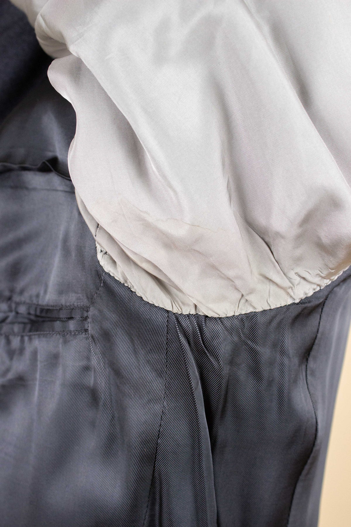 This suit is of Swedish origin and was most likely made sometime during the 1940s, or possibly in the very early 1950s. It is by Kabom, a Swedish ready-to-wear manufacturer that enjoyed its prime during this period. The suit is made from a dark grey fabric with a clearly defined twill texture.