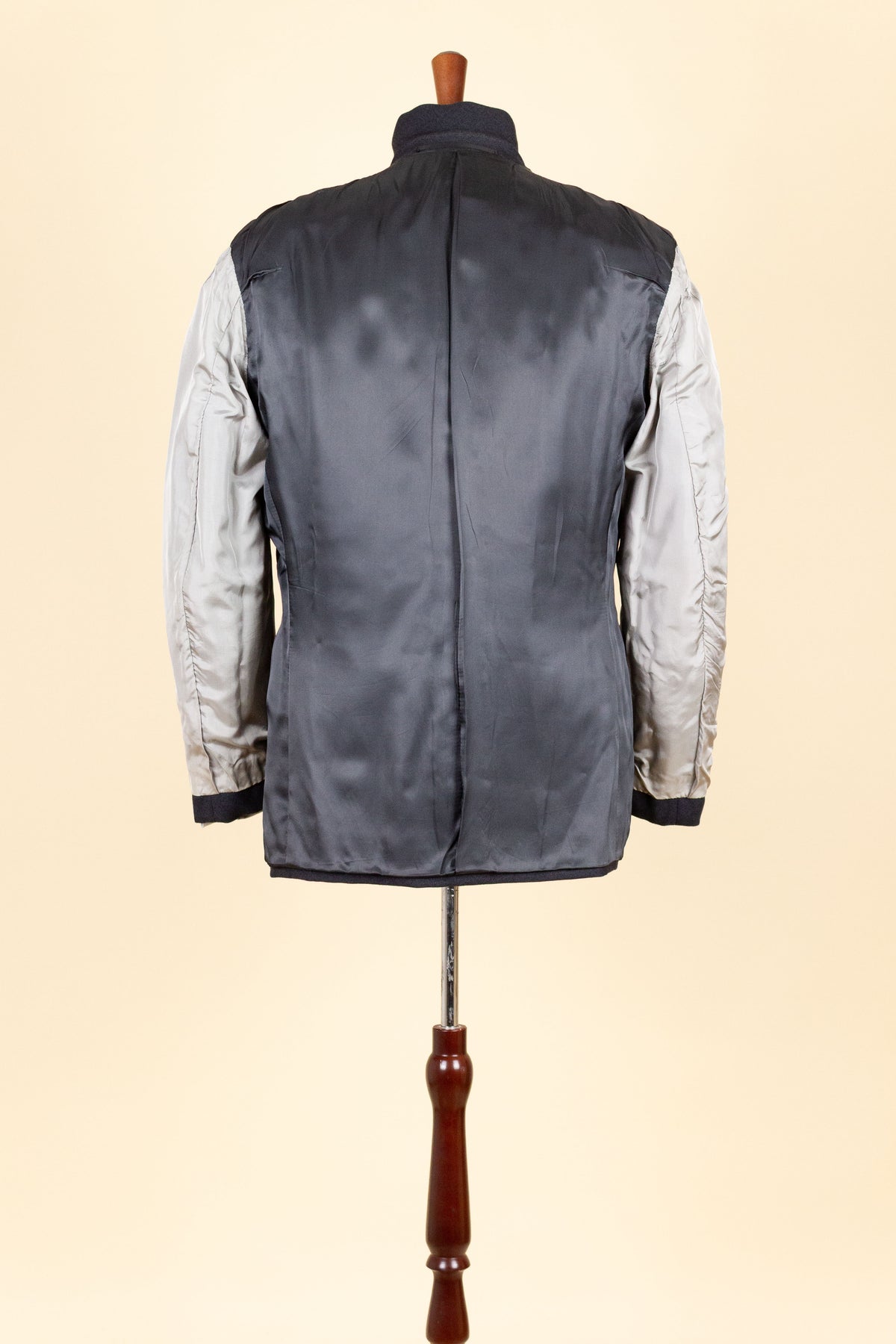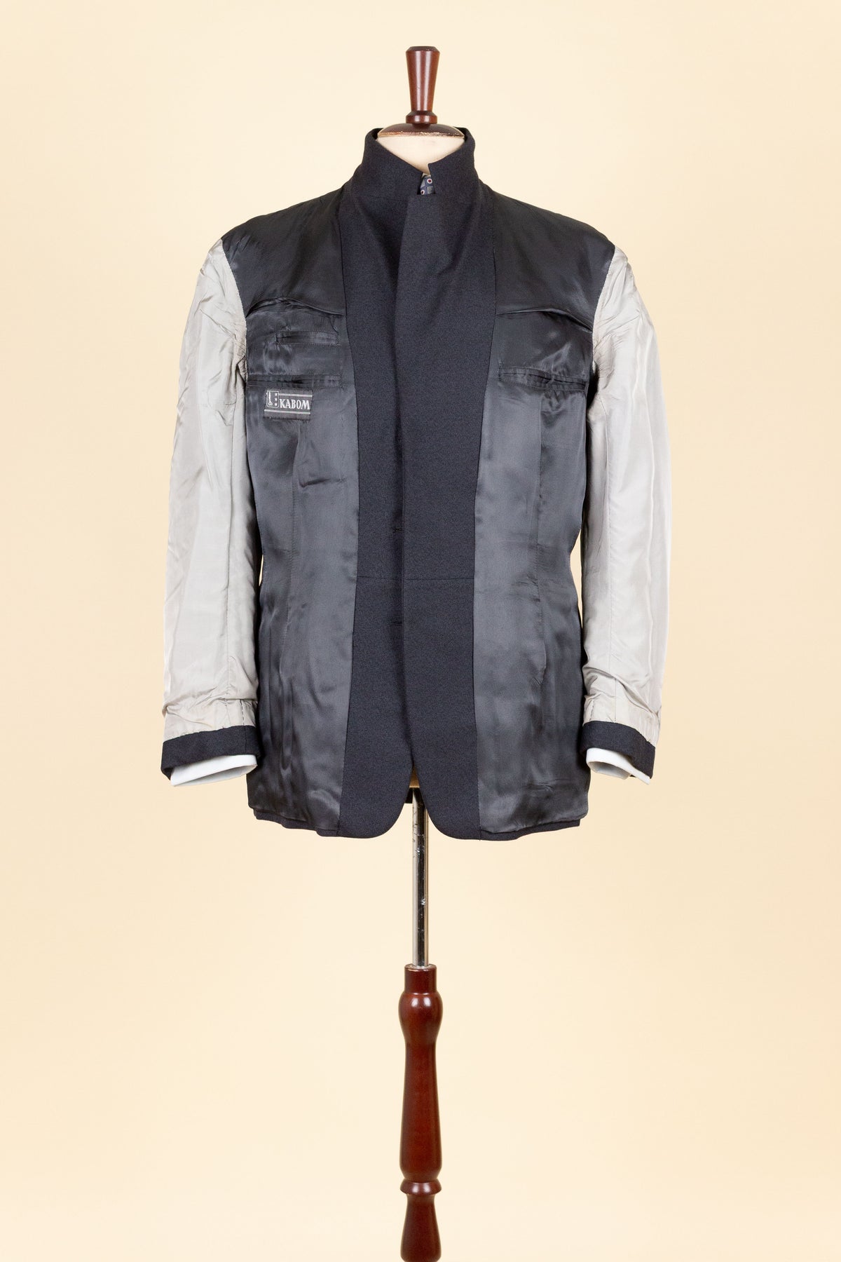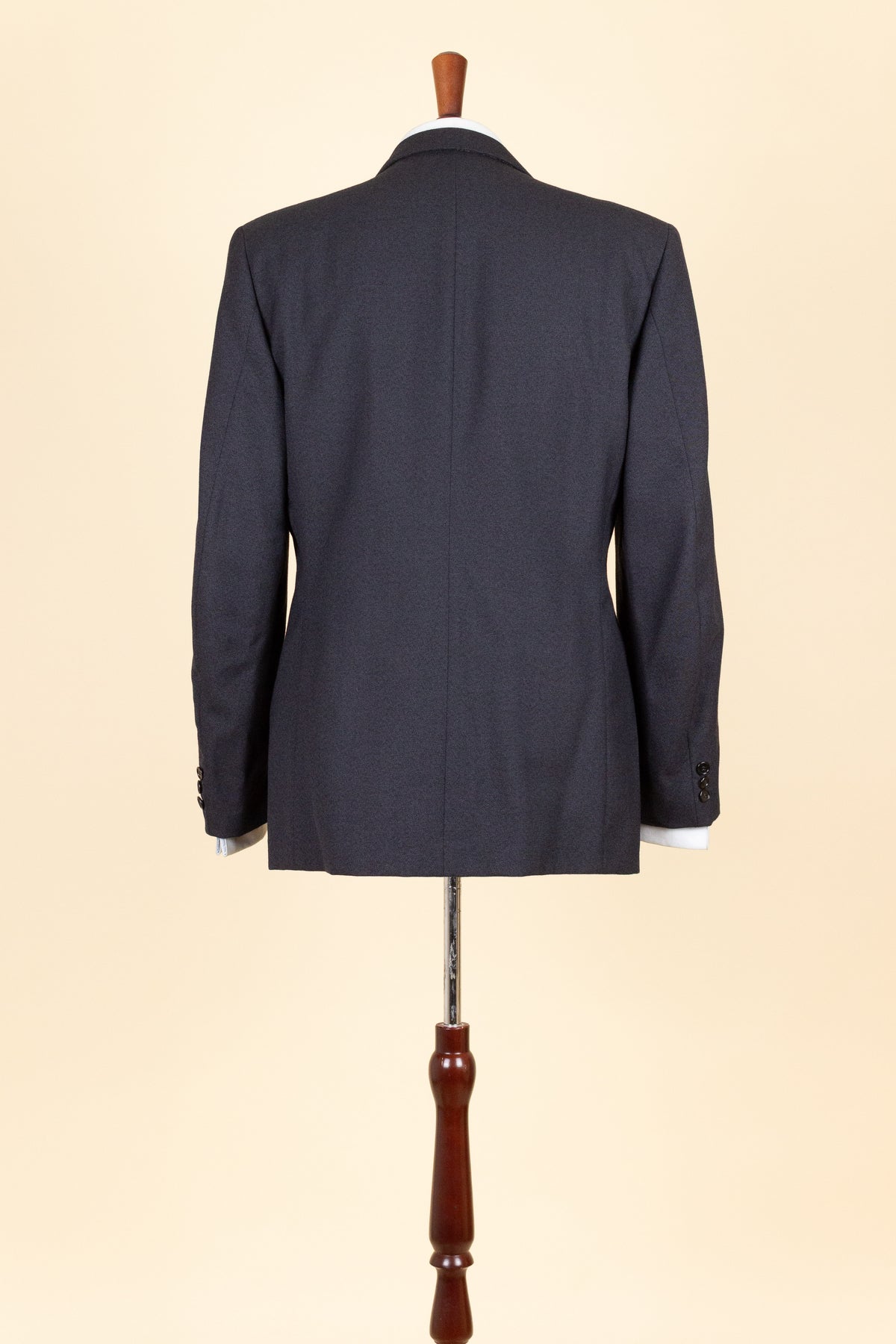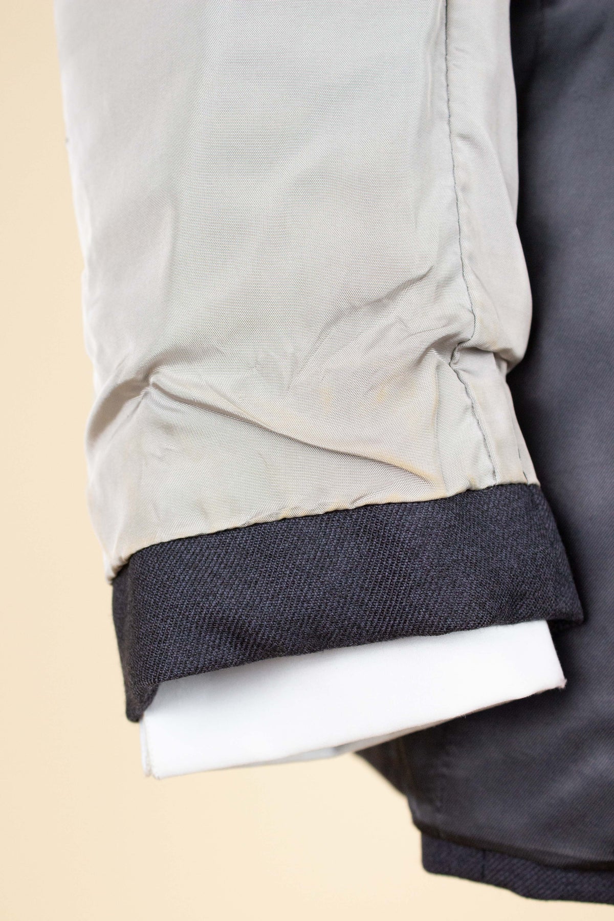 This suit is of Swedish origin and was most likely made sometime during the 1940s, or possibly in the very early 1950s. It is by Kabom, a Swedish ready-to-wear manufacturer that enjoyed its prime during this period. The suit is made from a dark grey fabric with a clearly defined twill texture.