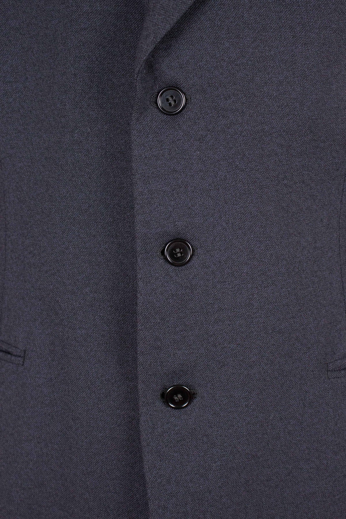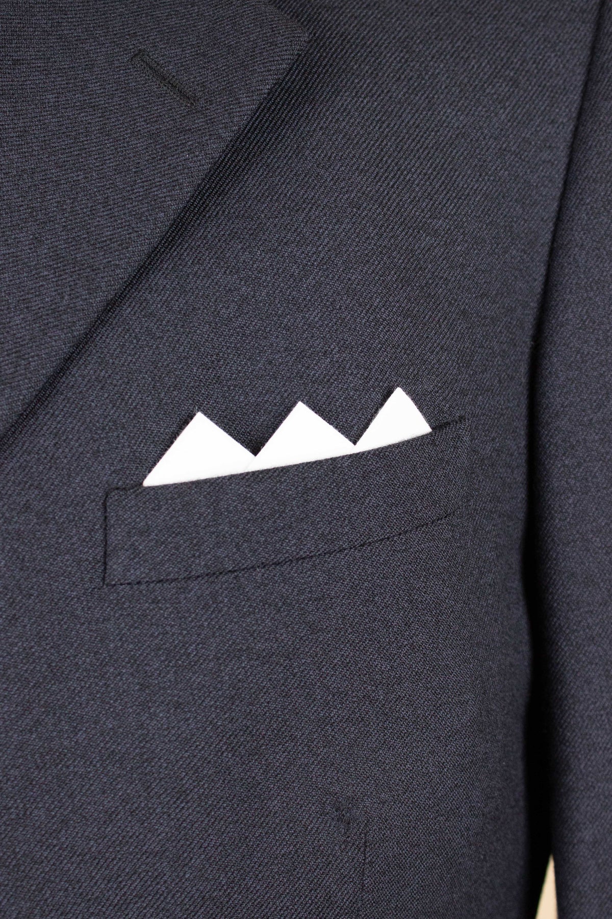 The jacket is single-breasted and fastens with three buttons. It features horizontal welted front pockets and a breast pocket. There is a buttonhole on the left lapel. The back is straight with a vent. Inside, the jacket is fully lined and has three inner pockets - a large one on each side and a smaller one on the right.