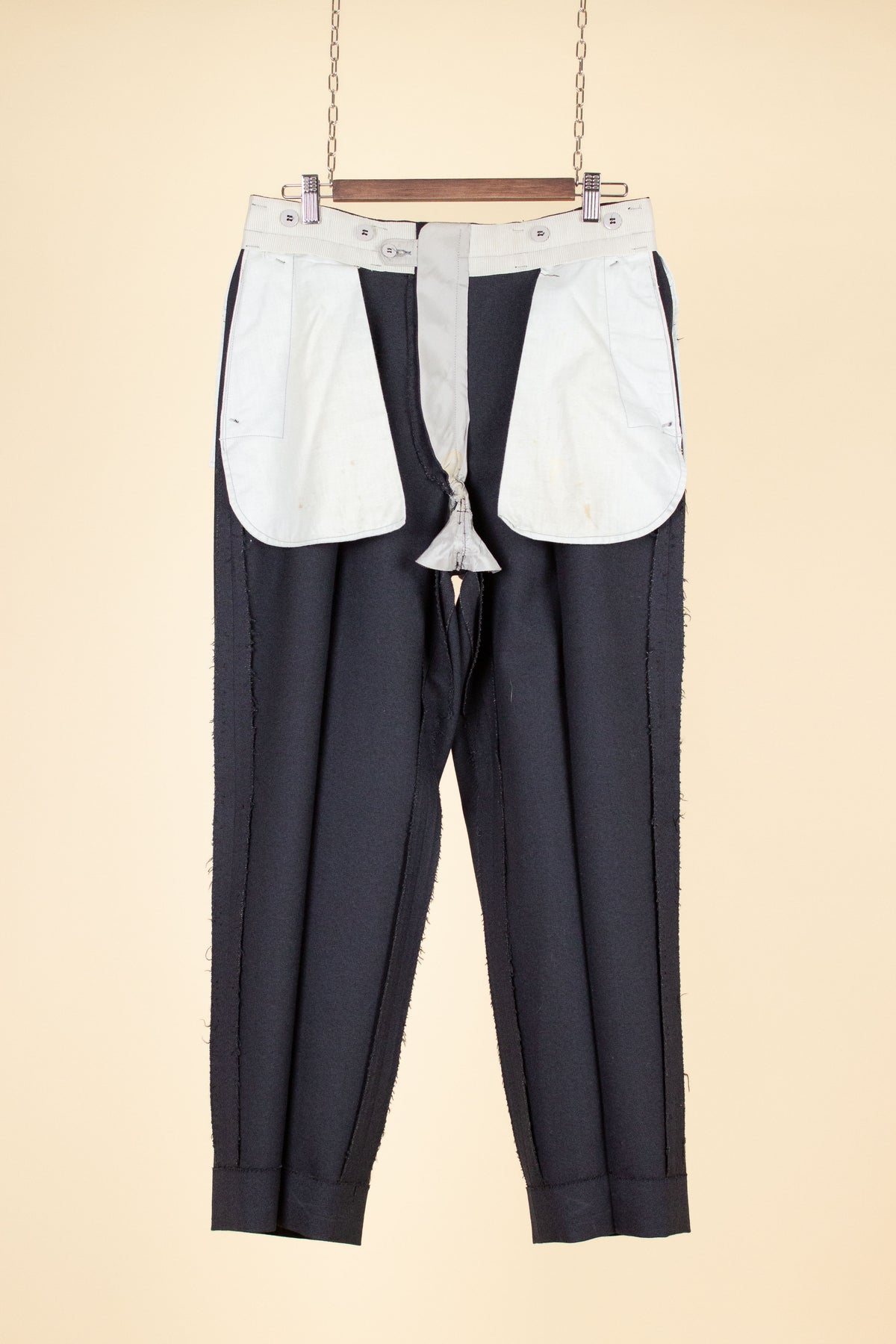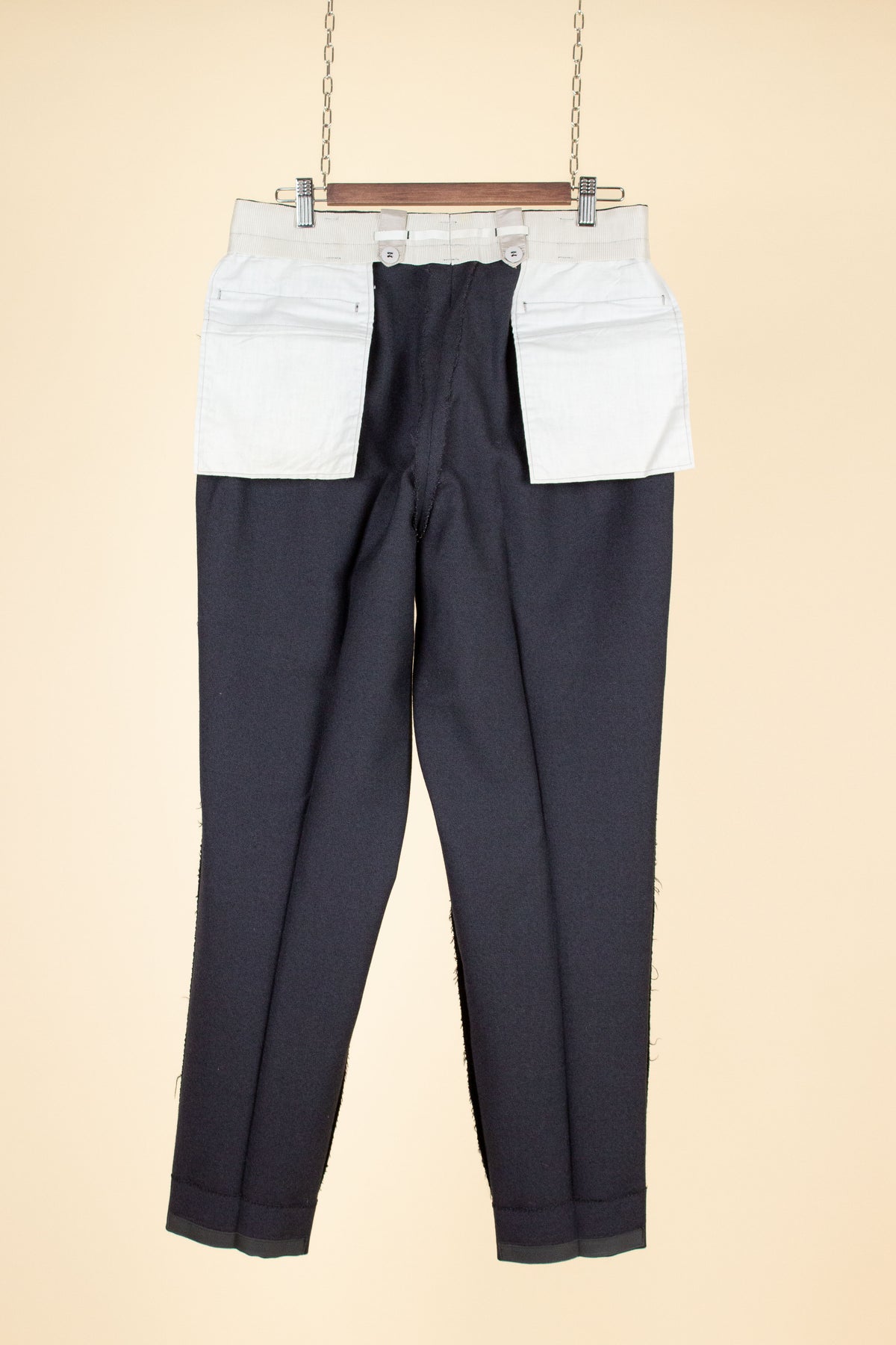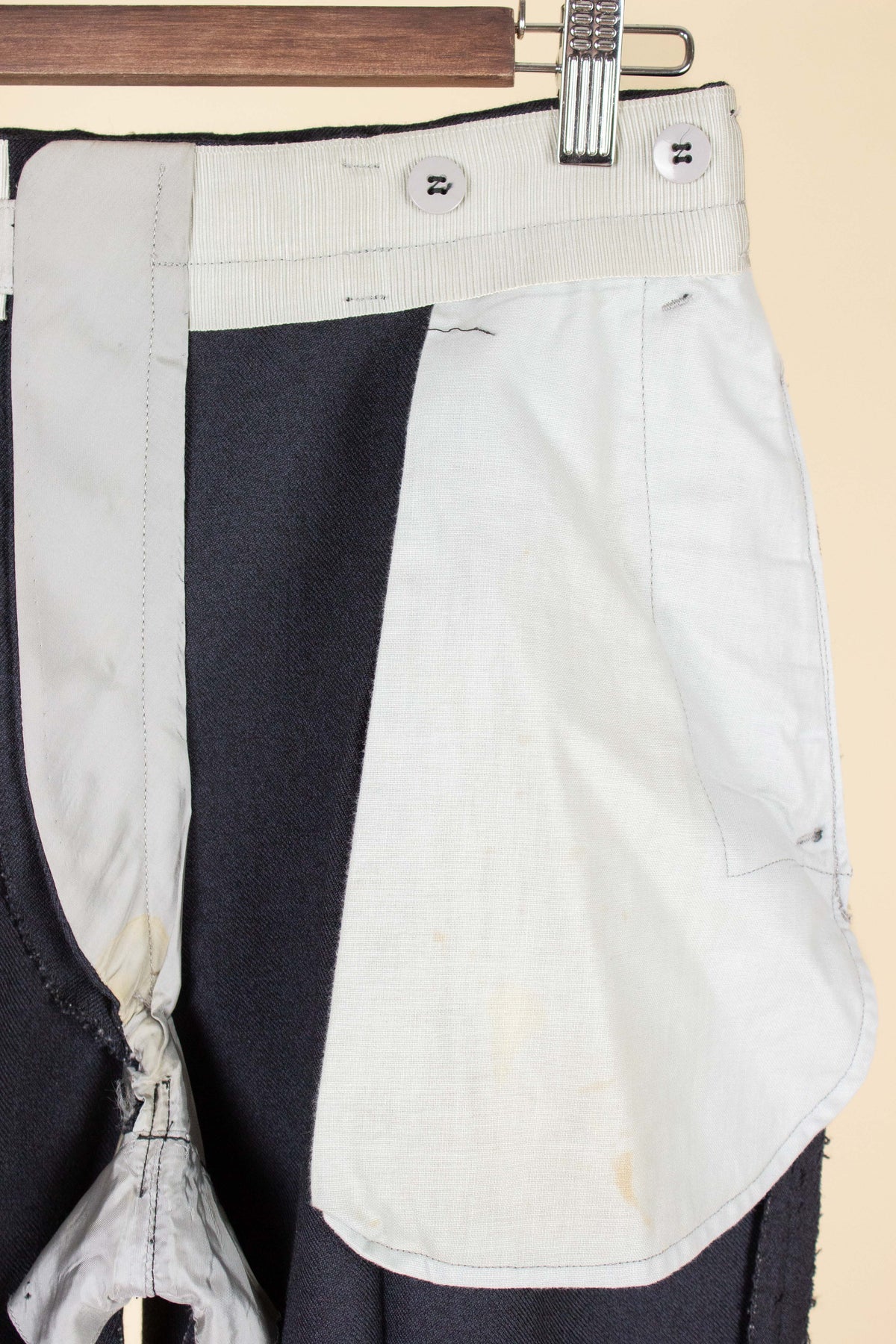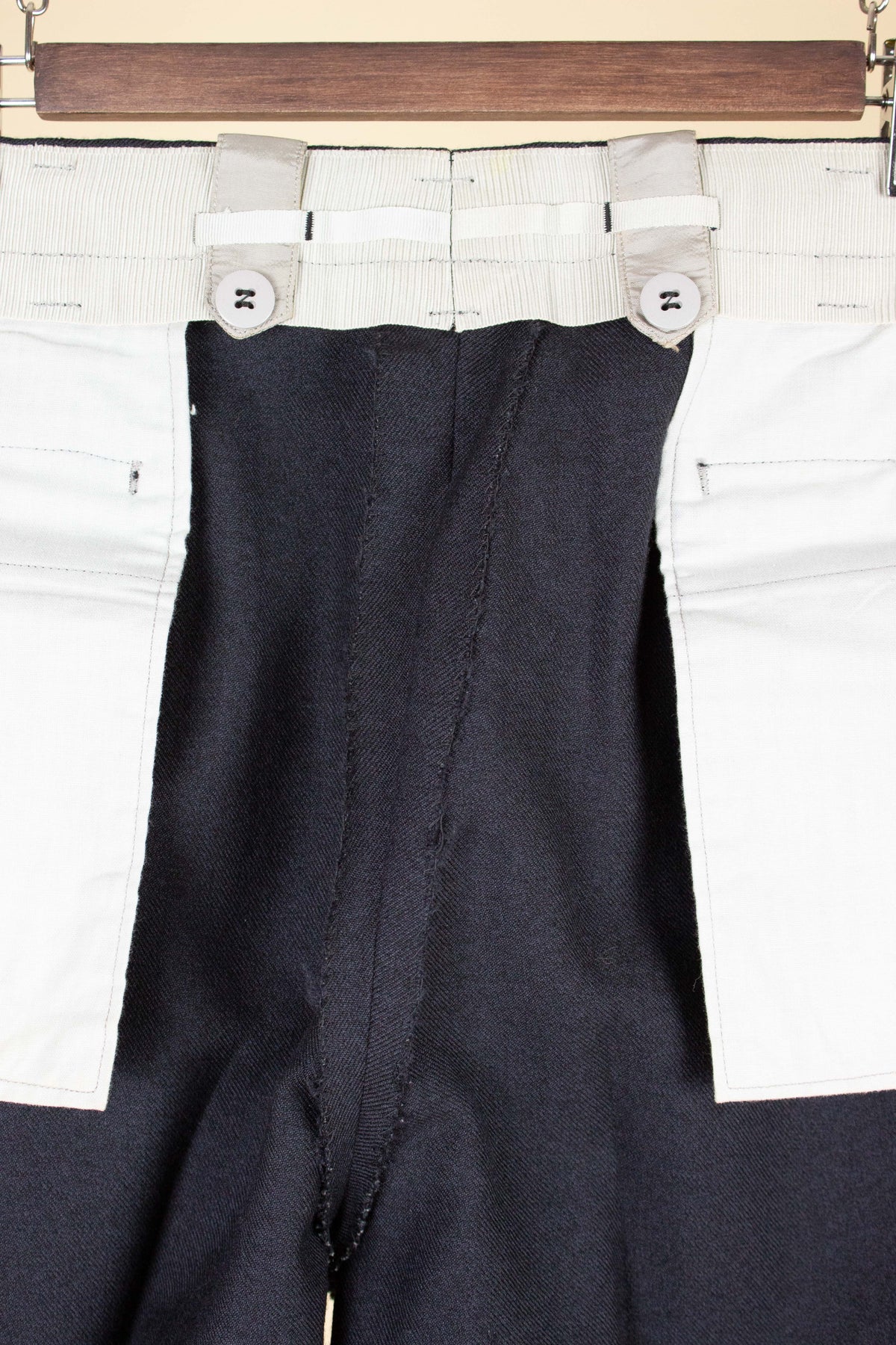 The trousers have double pleats, slightly slanted front pockets, belt loops, and a button fly. On the inside of the waistband, there are buttons for braces. At the back, there is a pocket on each side, both with button closures.
