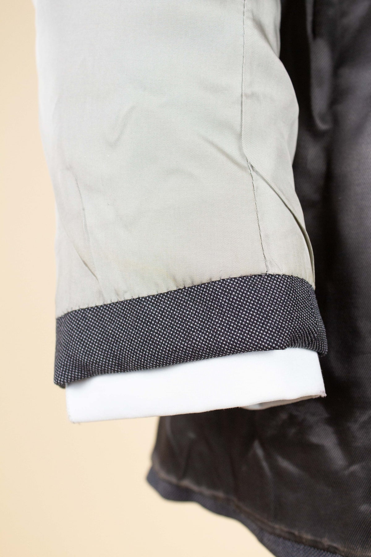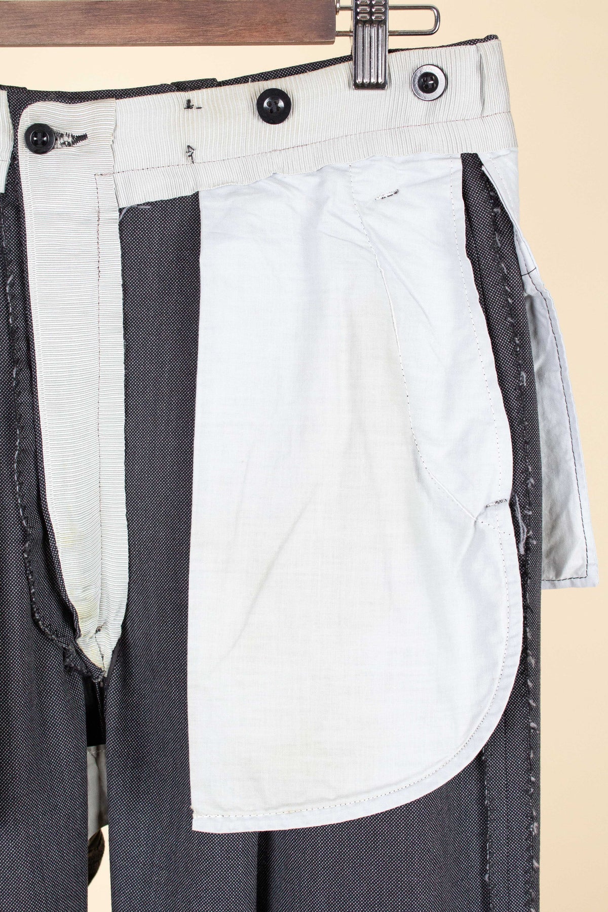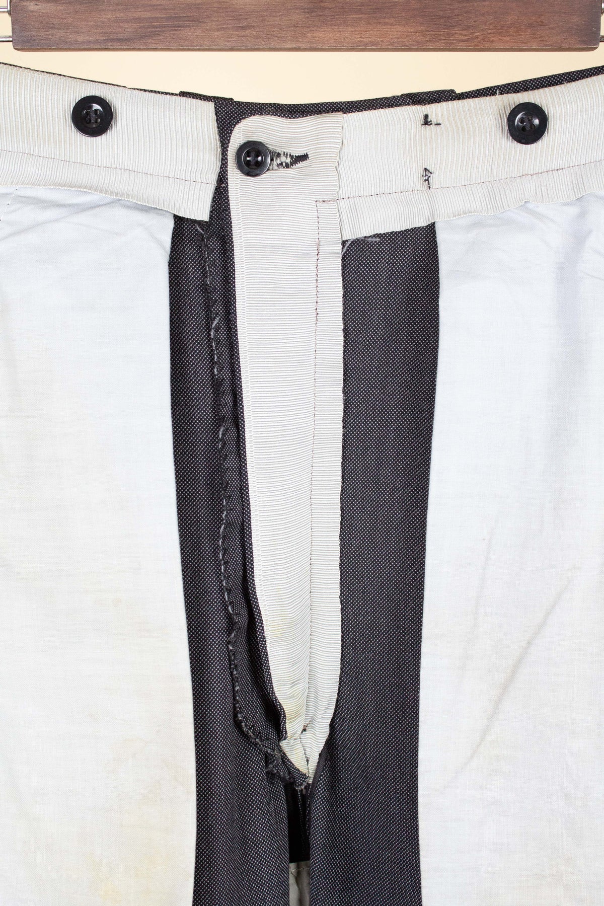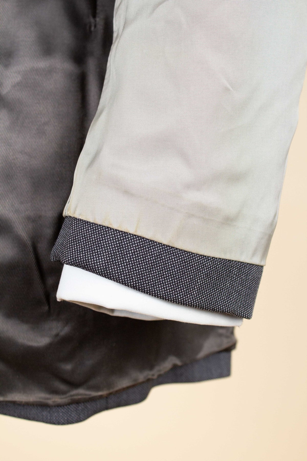 In terms of size, when considering both the jacket and the trousers, the suit falls between a modern EU 46 (UK/US 36) and an EU 48 (UK/US 38). Based on the jacket measurements, it corresponds to the larger of these sizes, while the trousers are closer to the smaller size when judged by the waist measurement. There is, however, a generous amount of cloth available to let out in the waist if desired. Such an alteration would allow both pieces to match in size, corresponding roughly to an EU 48 (UK/US38). Please scroll down for the exact measurements and seam allowances.