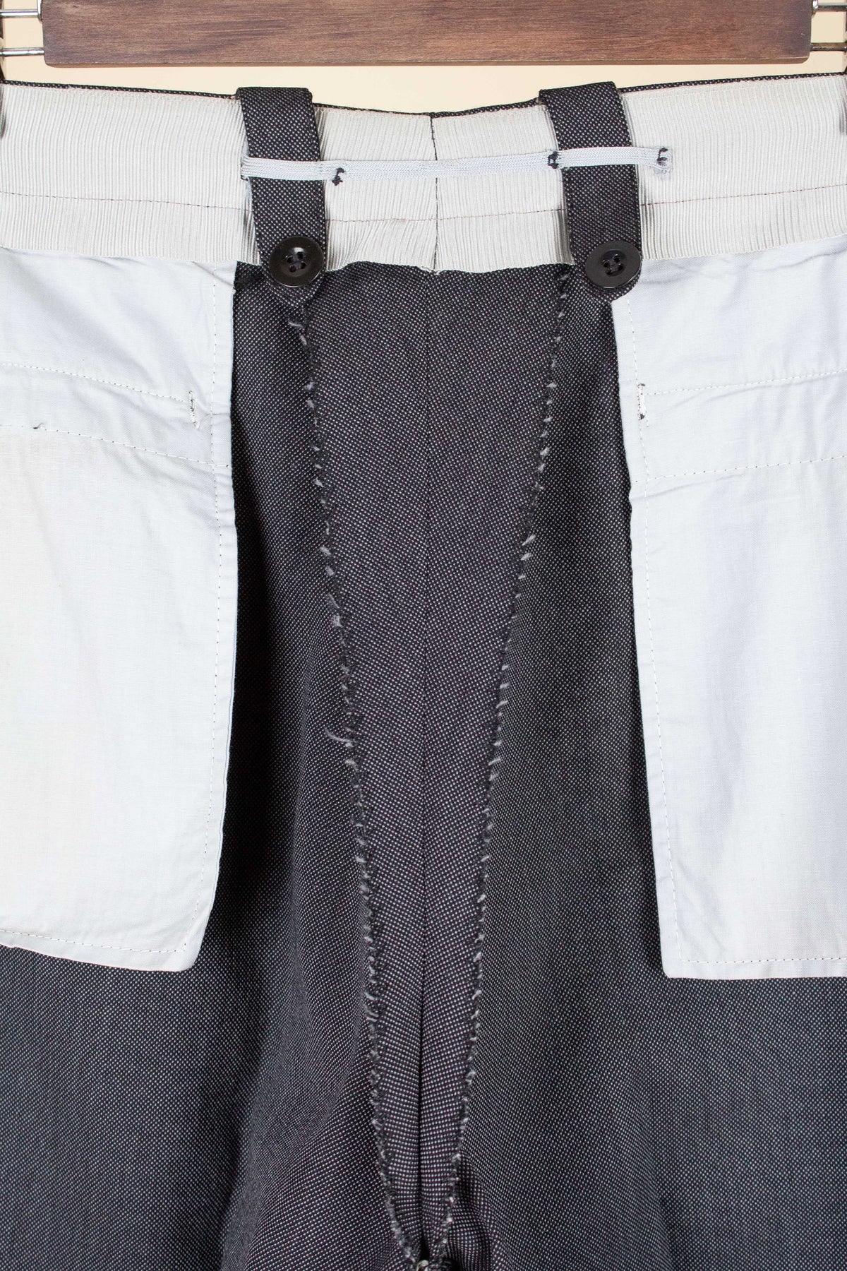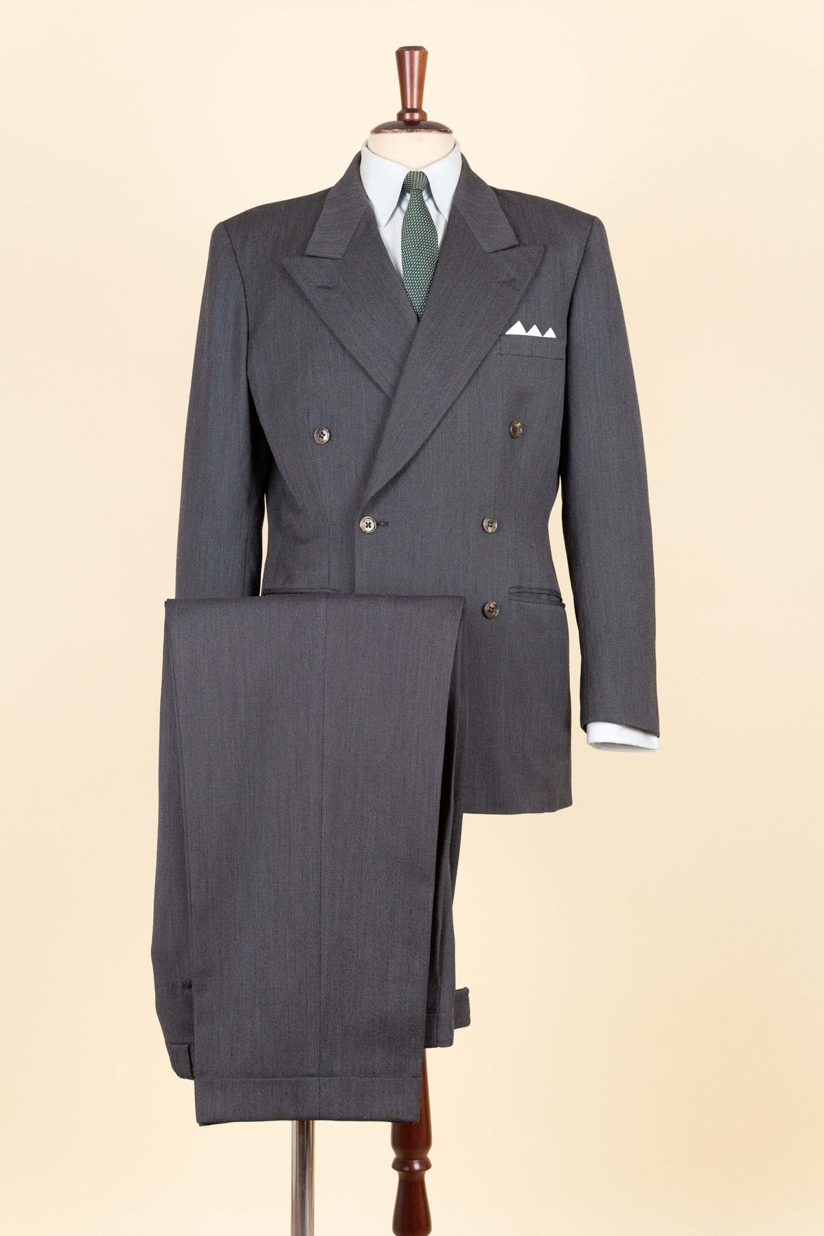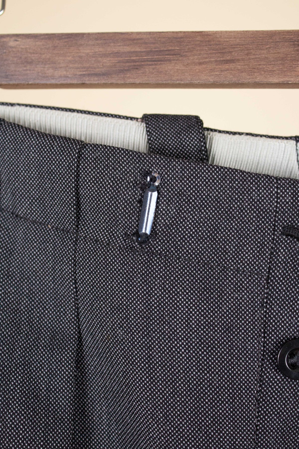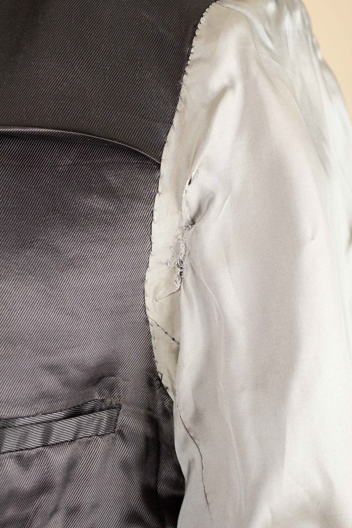 In terms of size, when considering both the jacket and the trousers, the suit falls between a modern EU 46 (UK/US 36) and an EU 48 (UK/US 38). Based on the jacket measurements, it corresponds to the larger of these sizes, while the trousers are closer to the smaller size when judged by the waist measurement. There is, however, a generous amount of cloth available to let out in the waist if desired. Such an alteration would allow both pieces to match in size, corresponding roughly to an EU 48 (UK/US38). Please scroll down for the exact measurements and seam allowances.