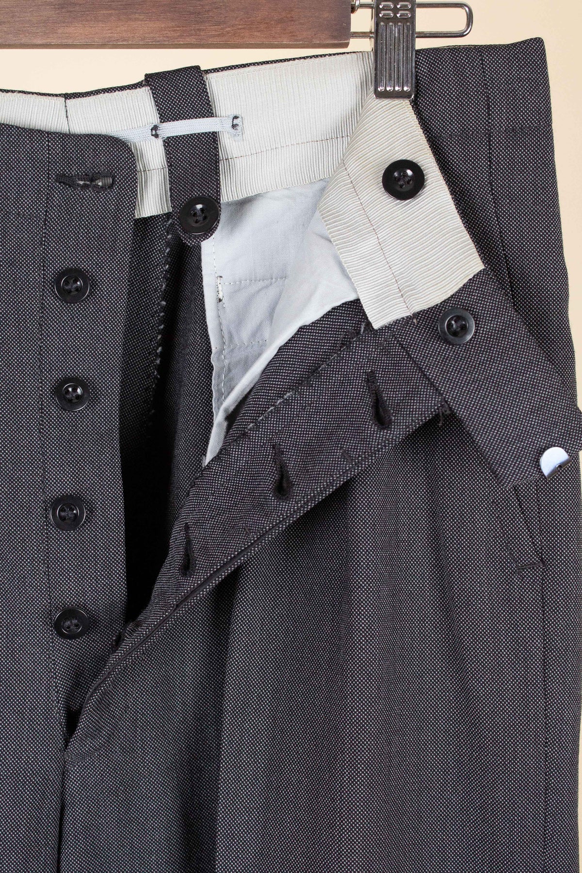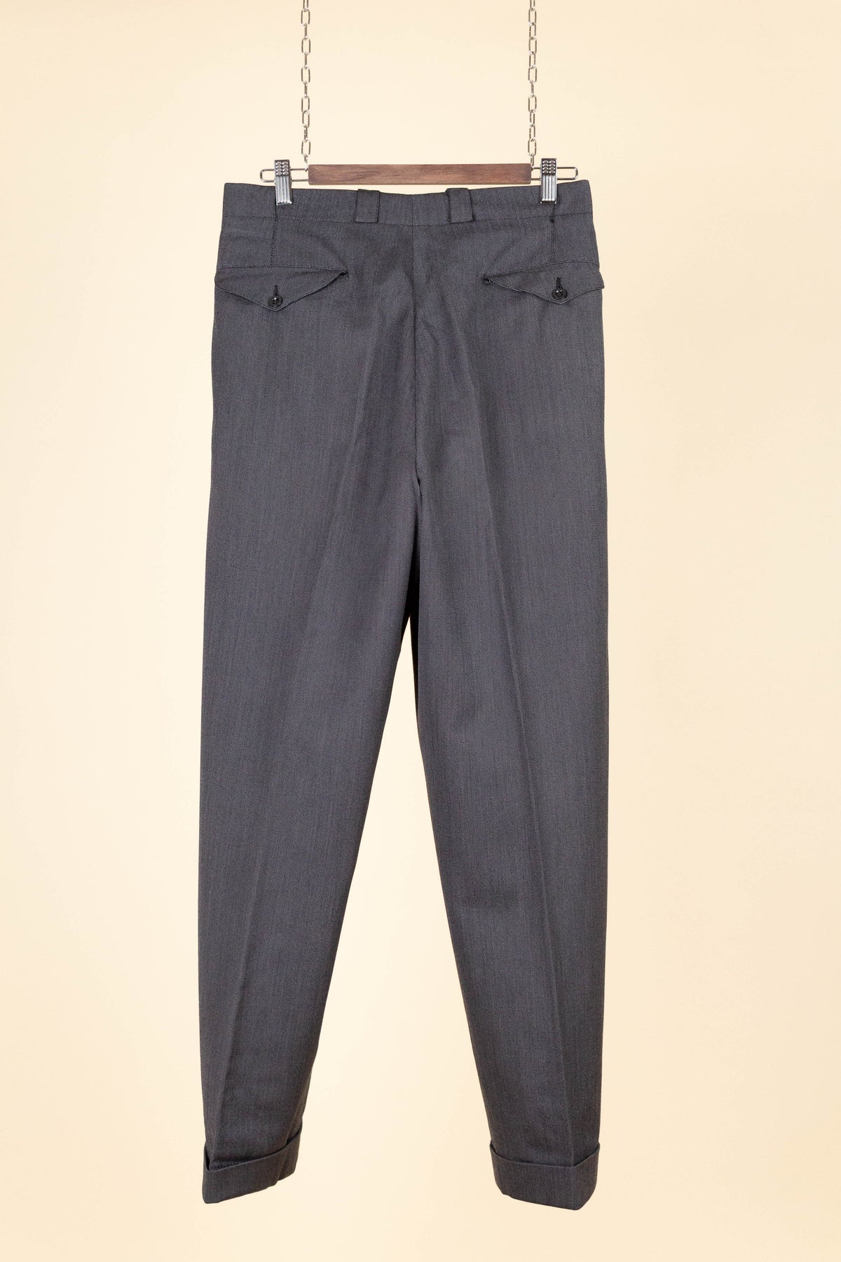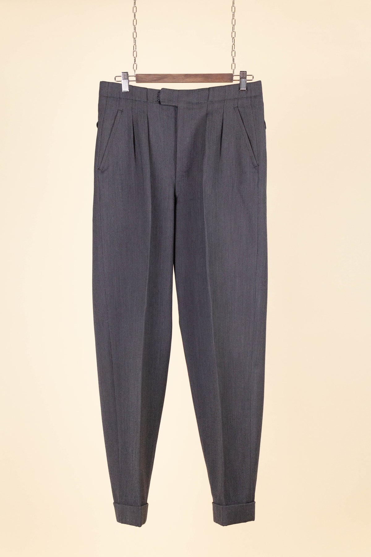 The trousers have double pleats, slightly slanted front pockets, and a button fly. On the inside of the waistband, there are buttons for braces. At the back, there is one pocket on each side, both with flaps and button fastening. The trouser legs are finished with turn-ups.