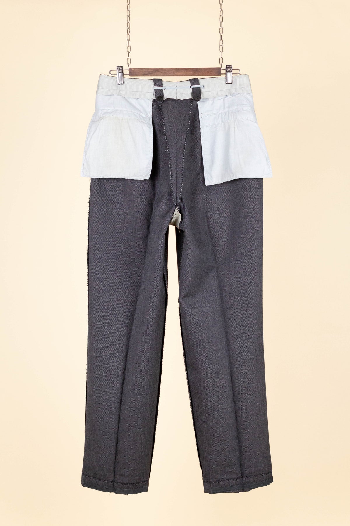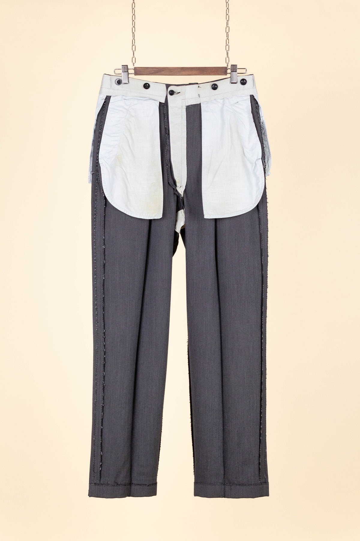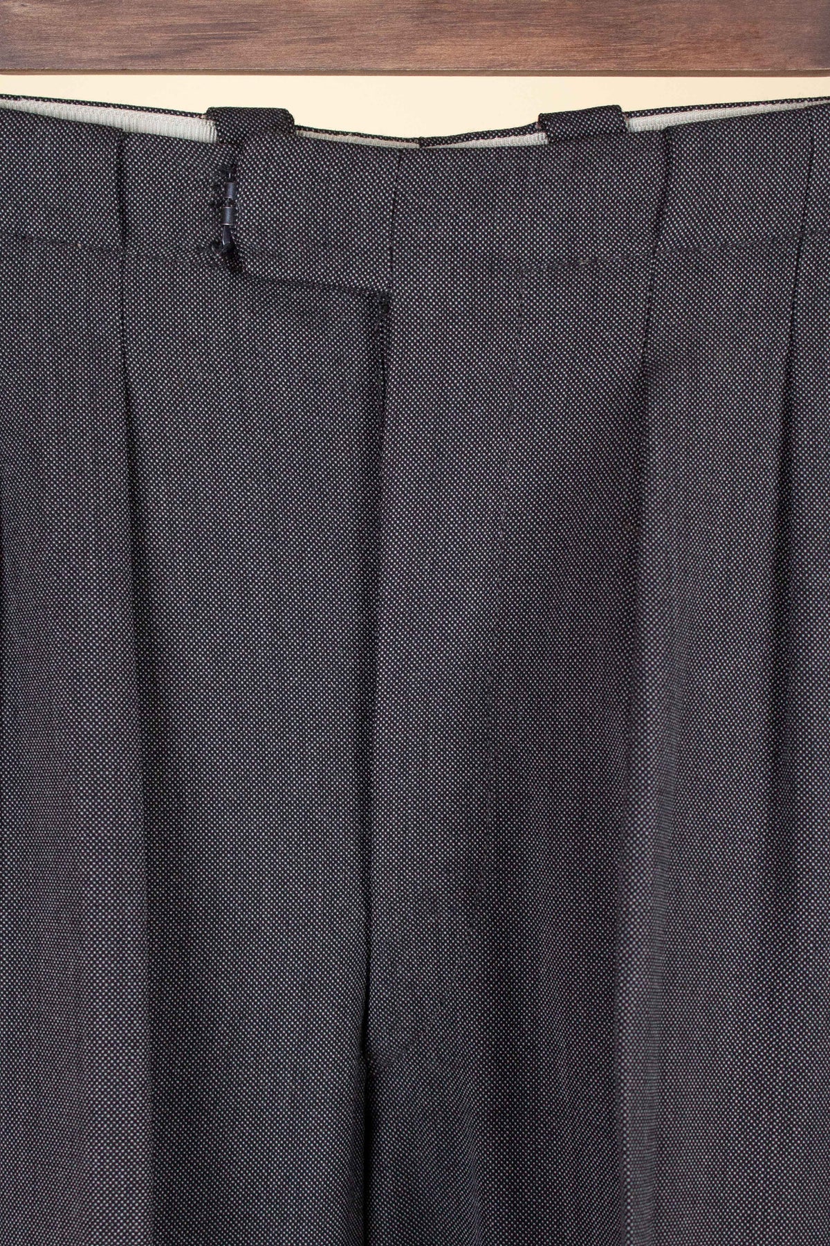 The trousers have double pleats, slightly slanted front pockets, and a button fly. On the inside of the waistband, there are buttons for braces. At the back, there is one pocket on each side, both with flaps and button fastening. The trouser legs are finished with turn-ups.