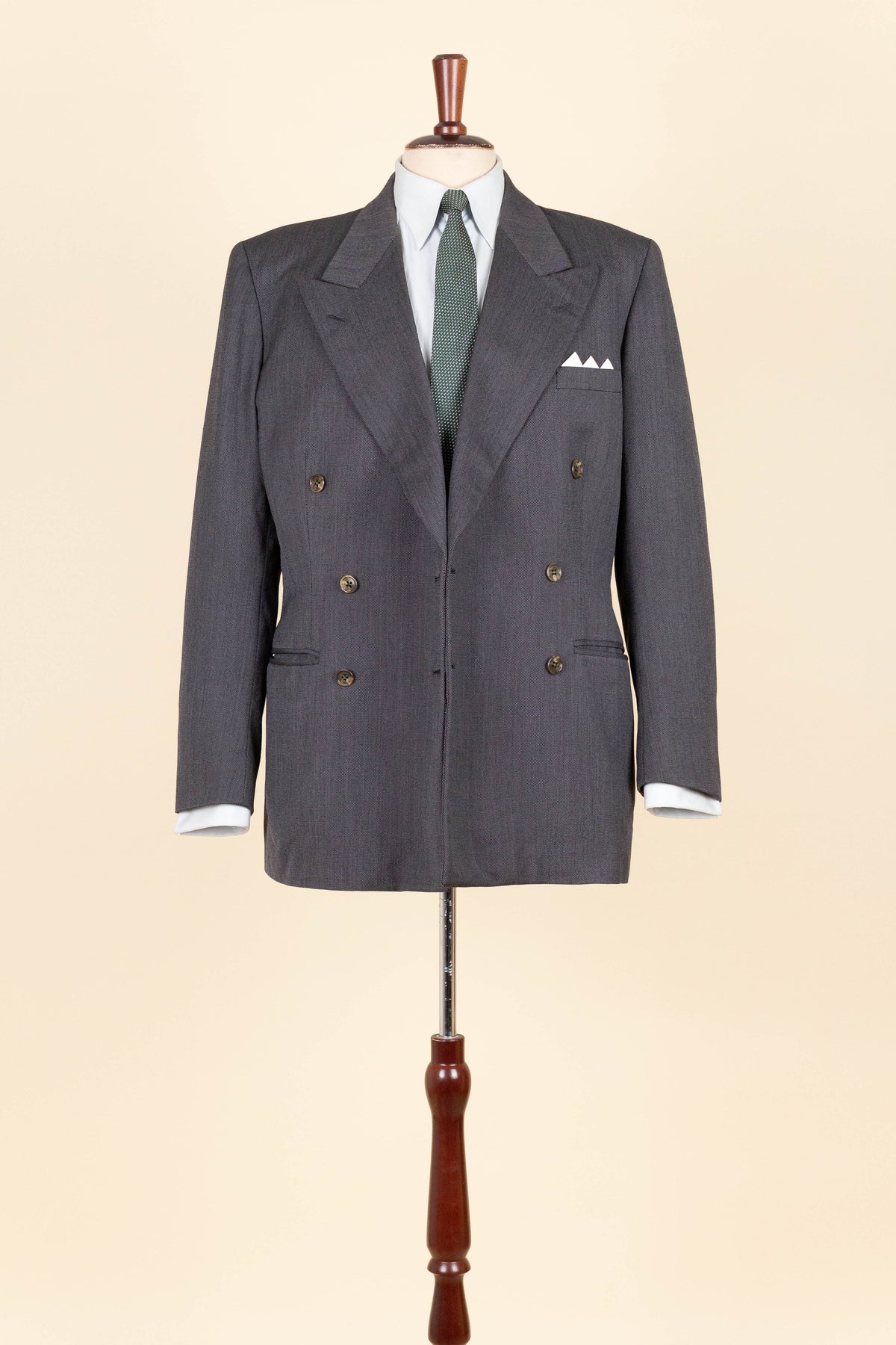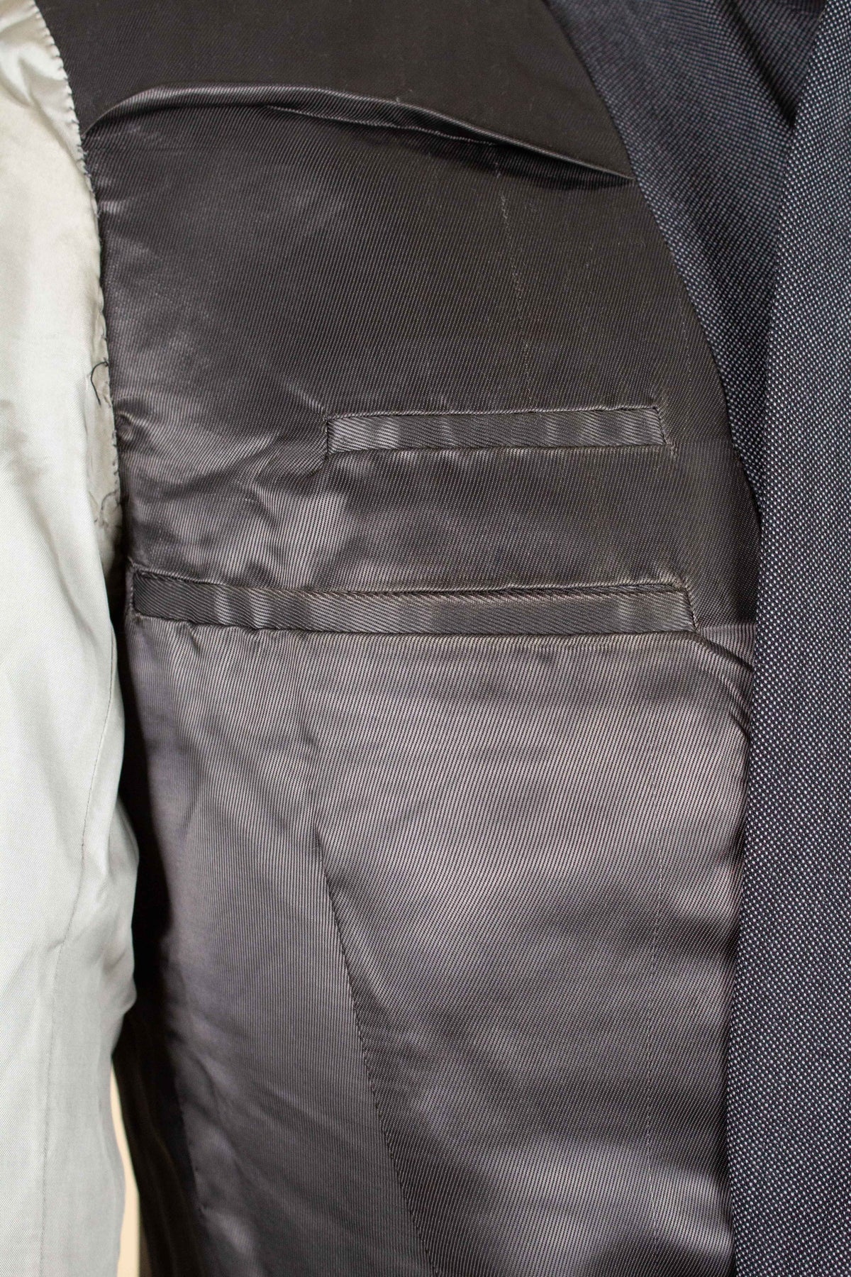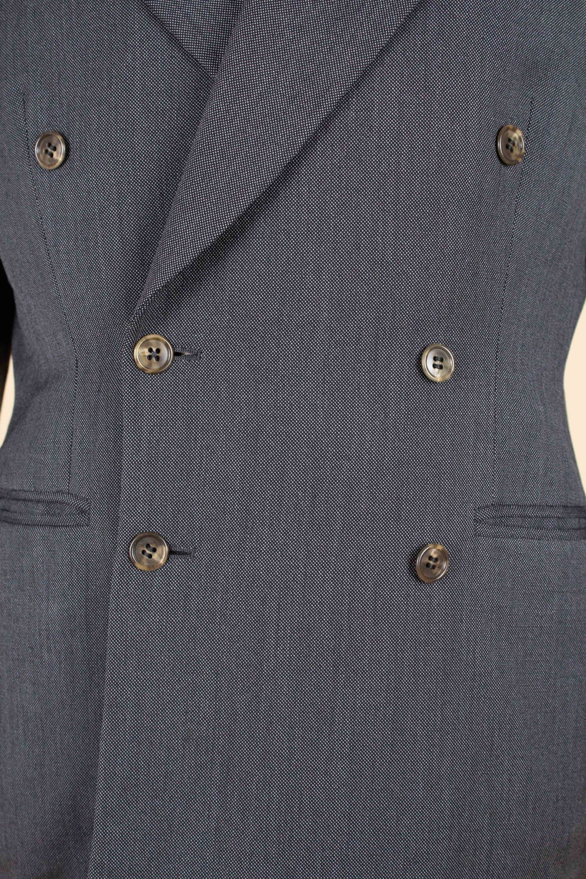 The jacket is double-breasted with three rows of buttons, two of which are functional. It features horizontal jetted front pockets and a breast pocket. There is a buttonhole on each lapel. The back is straight and closed, with no vent. Inside, it is fully lined and has three inner pockets: one large pocket on each side and a smaller pocket on the left-hand side.