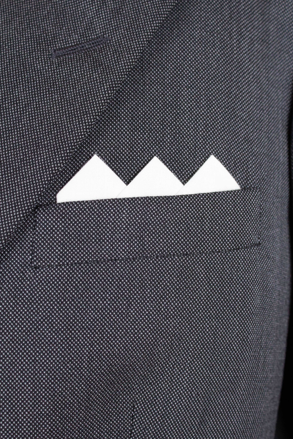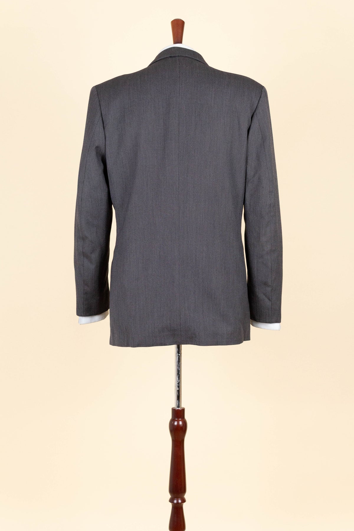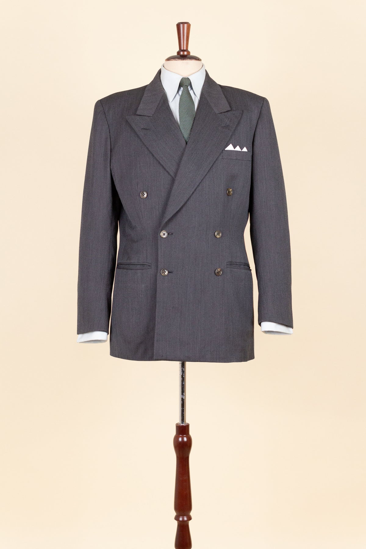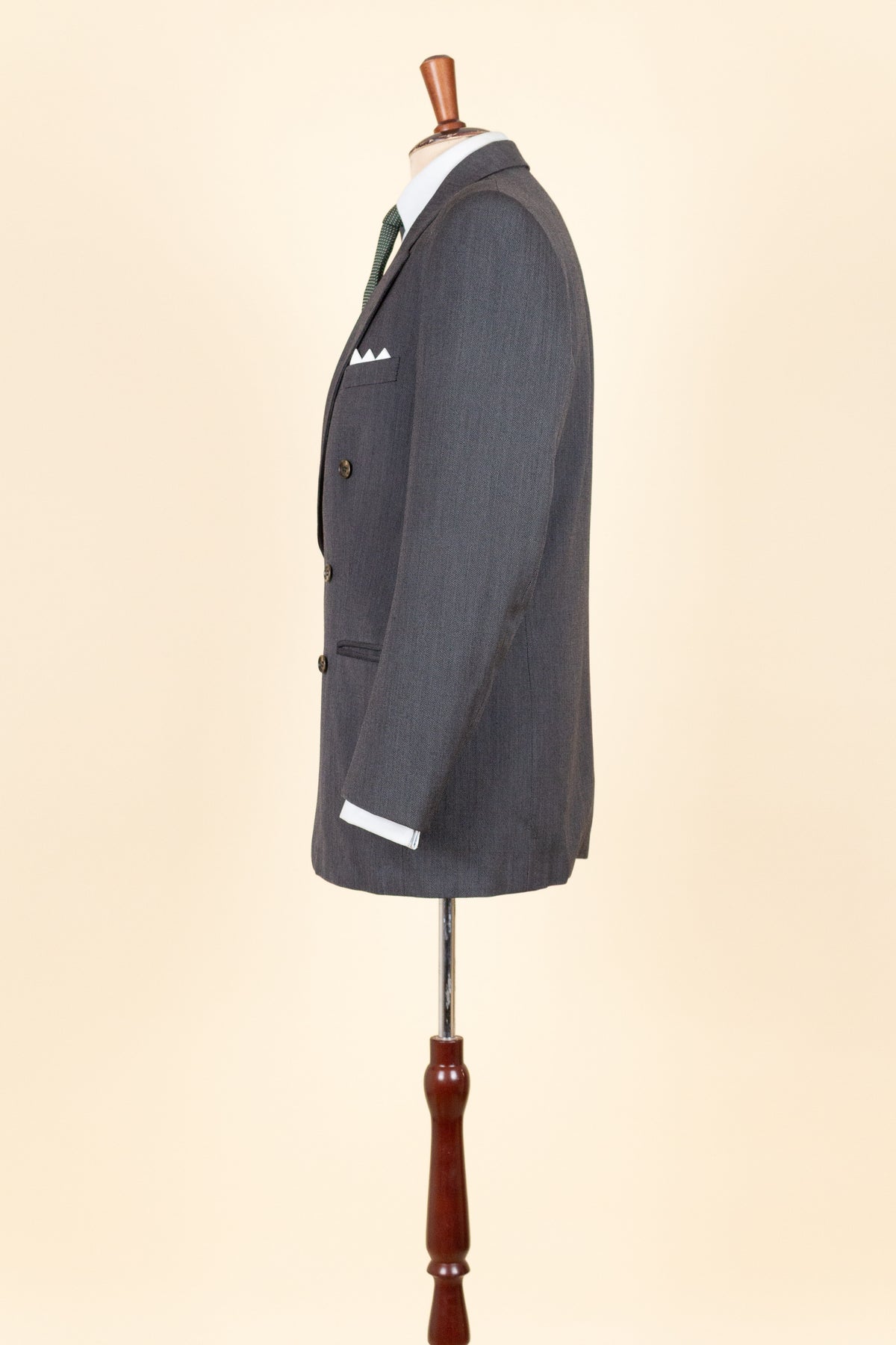 The jacket is double-breasted with three rows of buttons, two of which are functional. It features horizontal jetted front pockets and a breast pocket. There is a buttonhole on each lapel. The back is straight and closed, with no vent. Inside, it is fully lined and has three inner pockets: one large pocket on each side and a smaller pocket on the left-hand side.