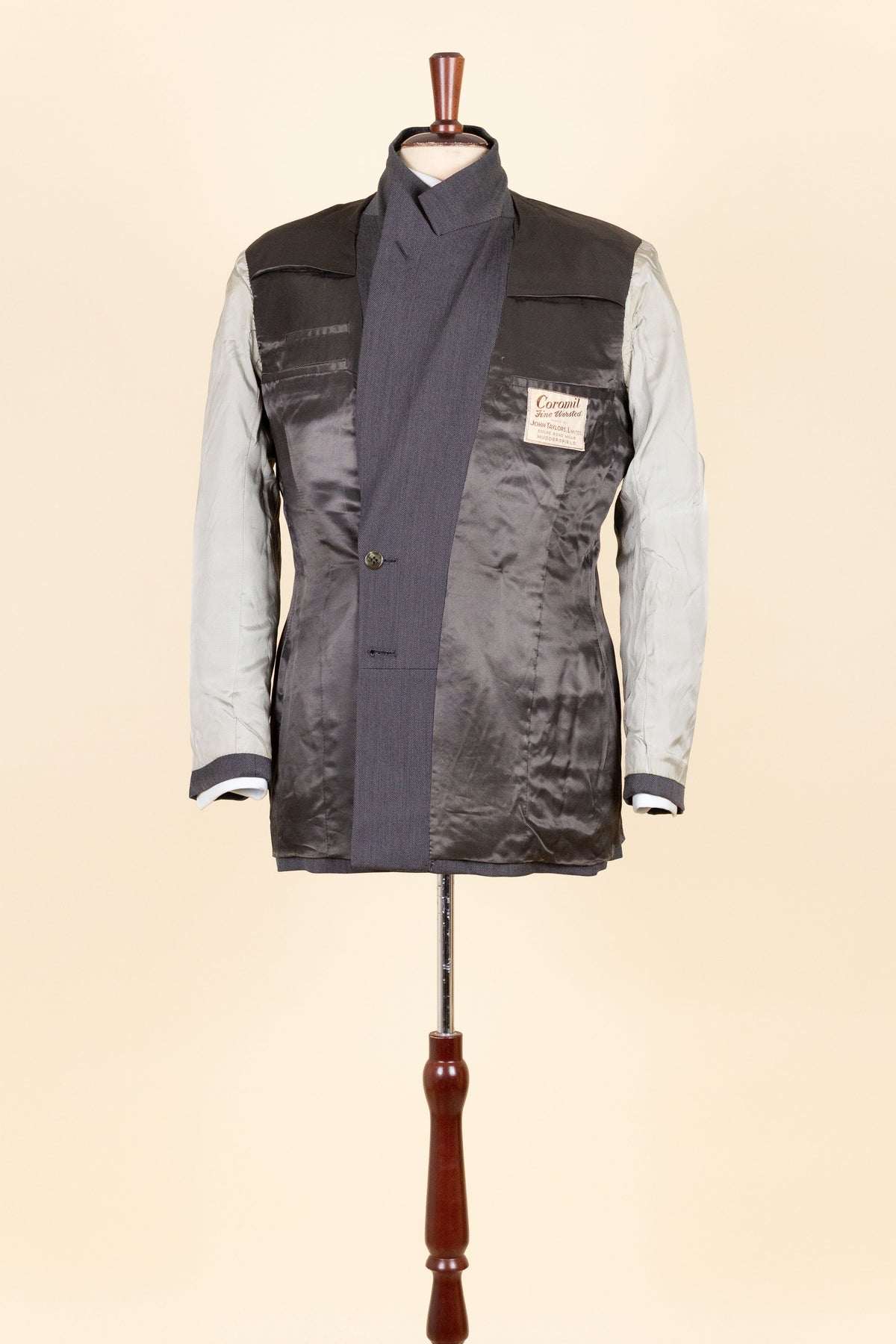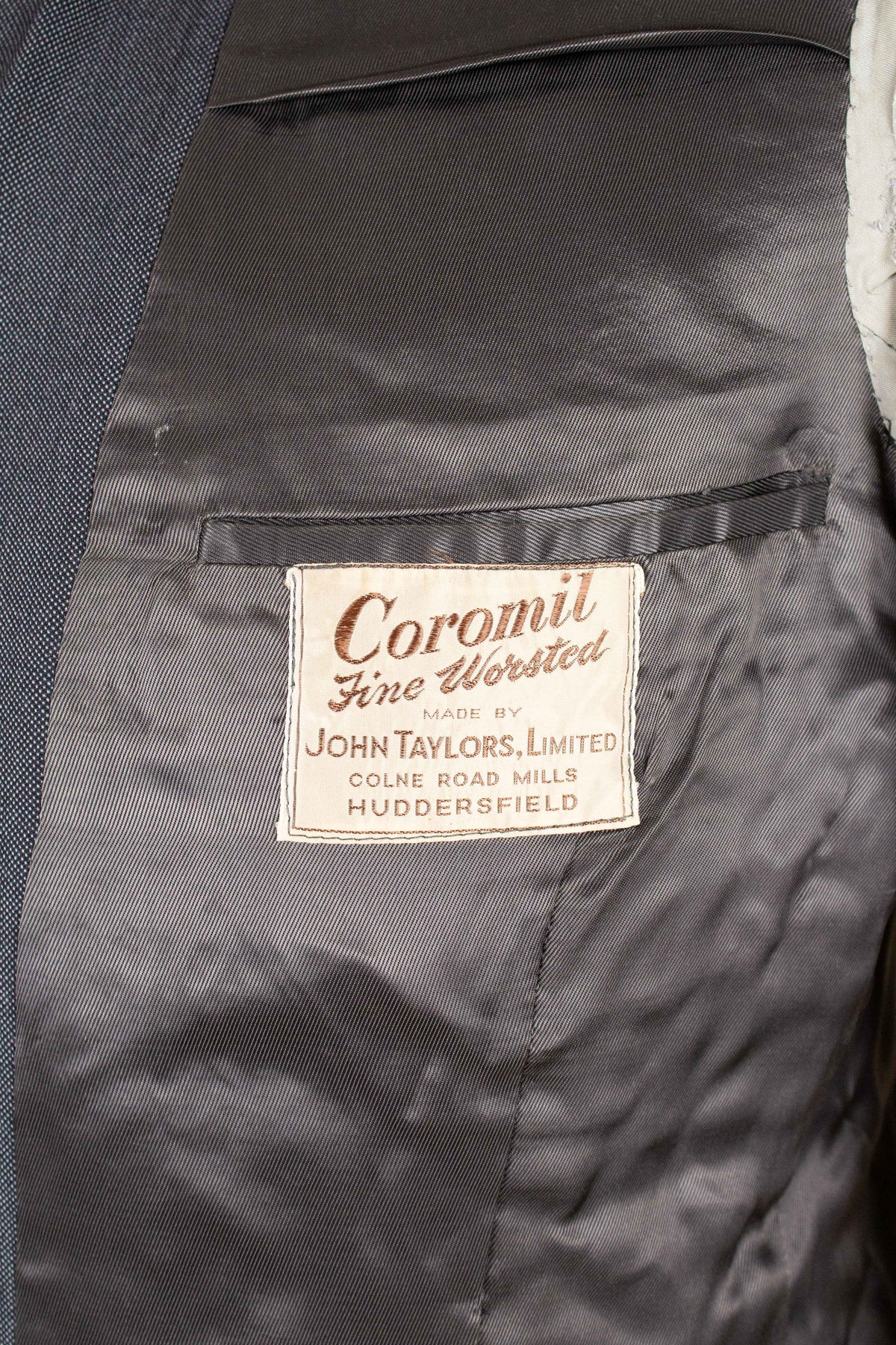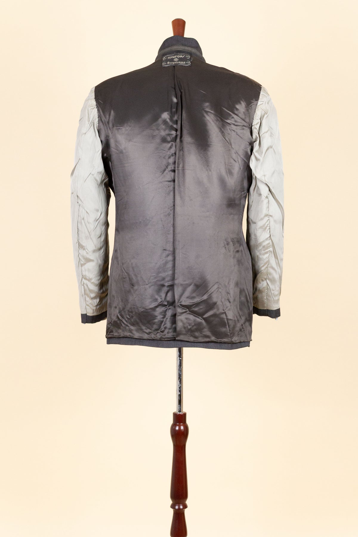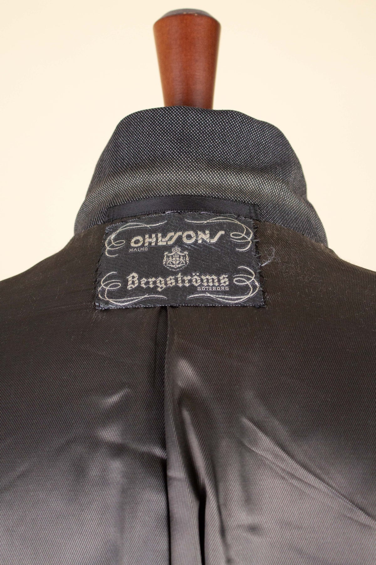 This suit is of Swedish origin and was made sometime during the 1940s by Ohlssons. It was originally sold new by the menswear outfitter Bergströms in Gothenburg, at the time a large and well-known men’s clothing store. The suit is made from a mid-grey cloth of British origin, supplied by Coromil.