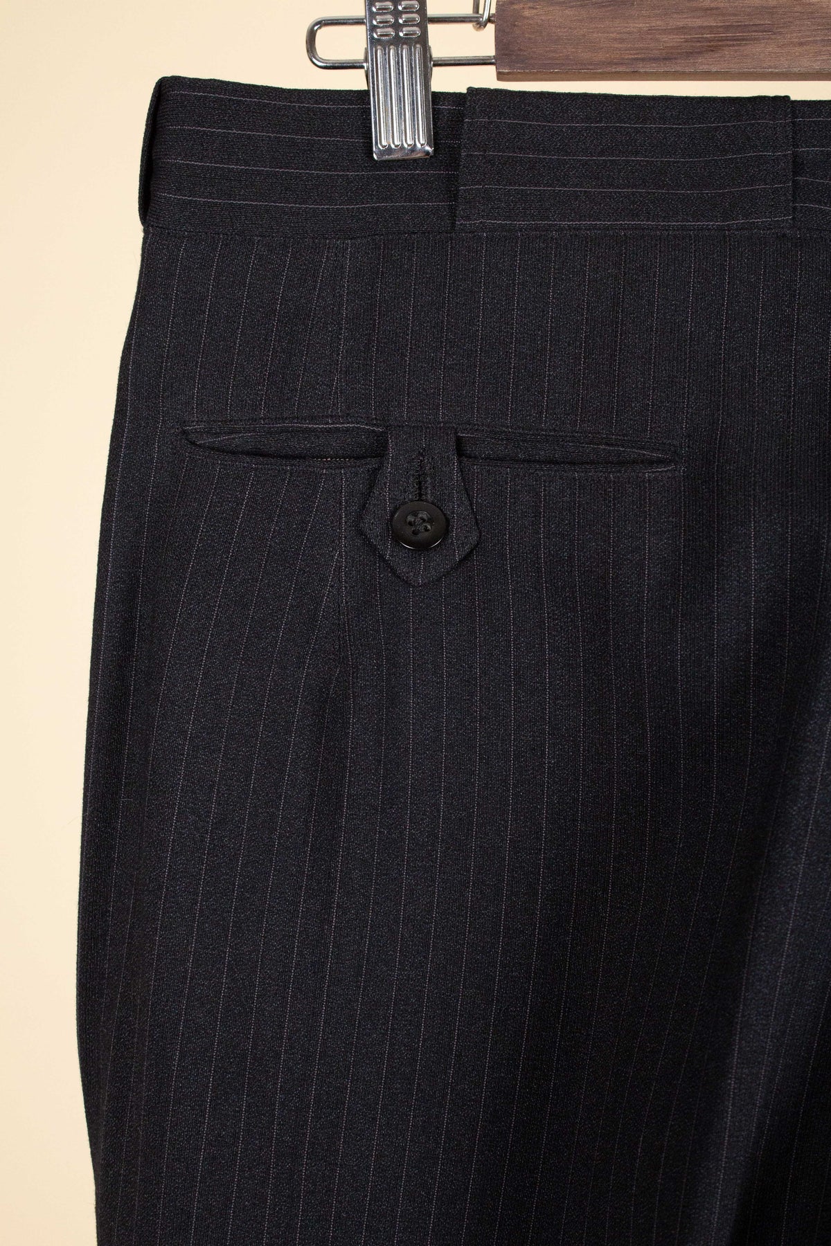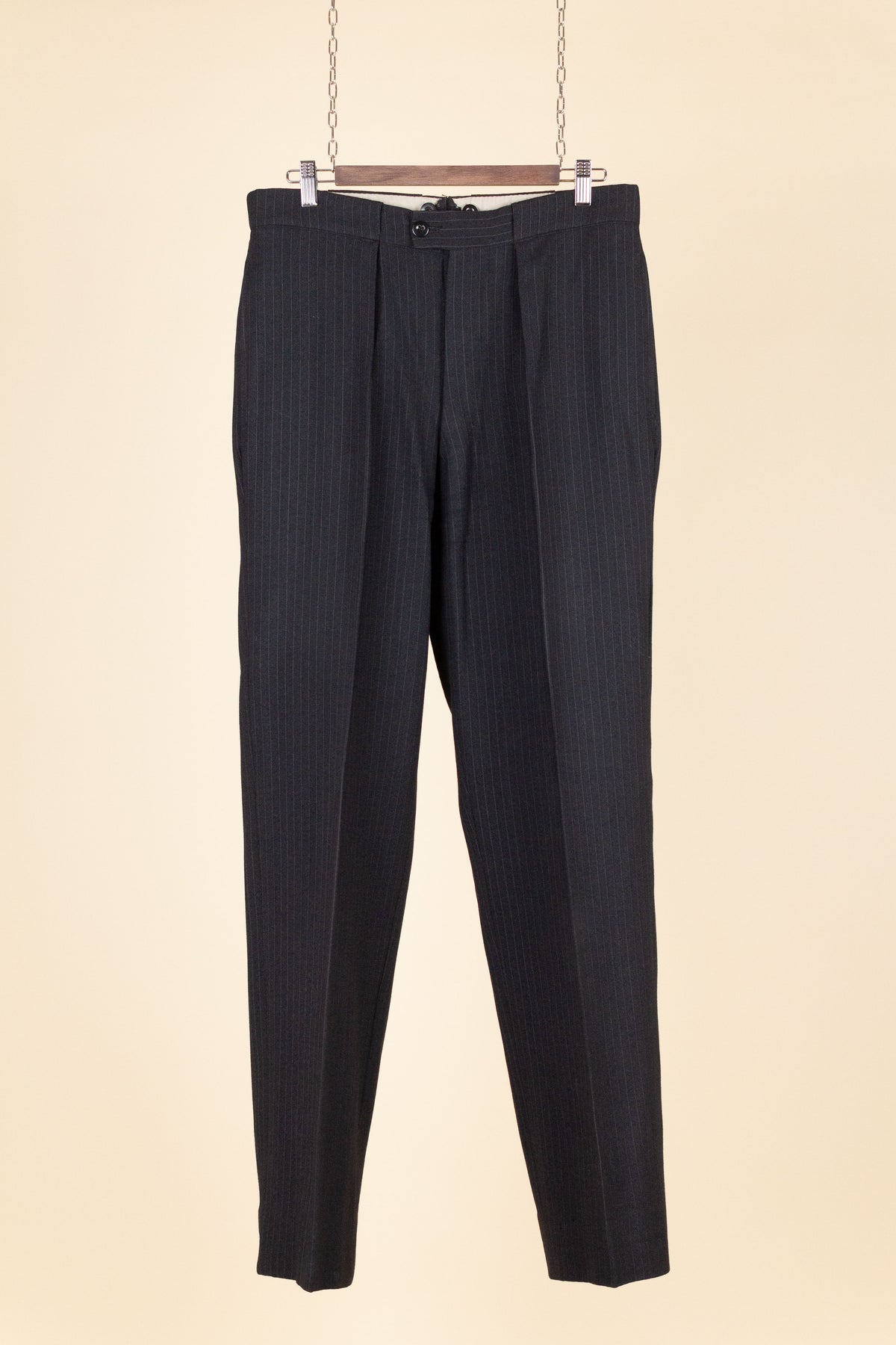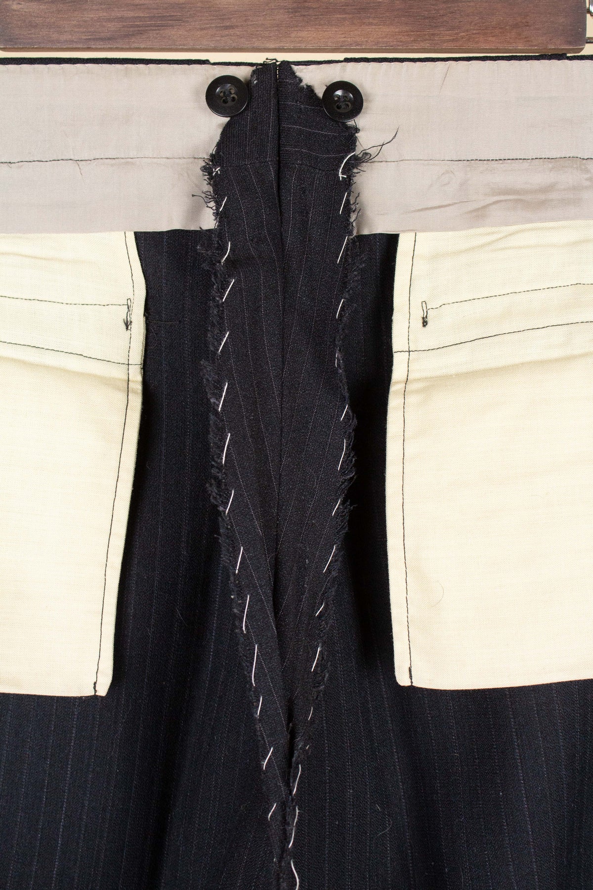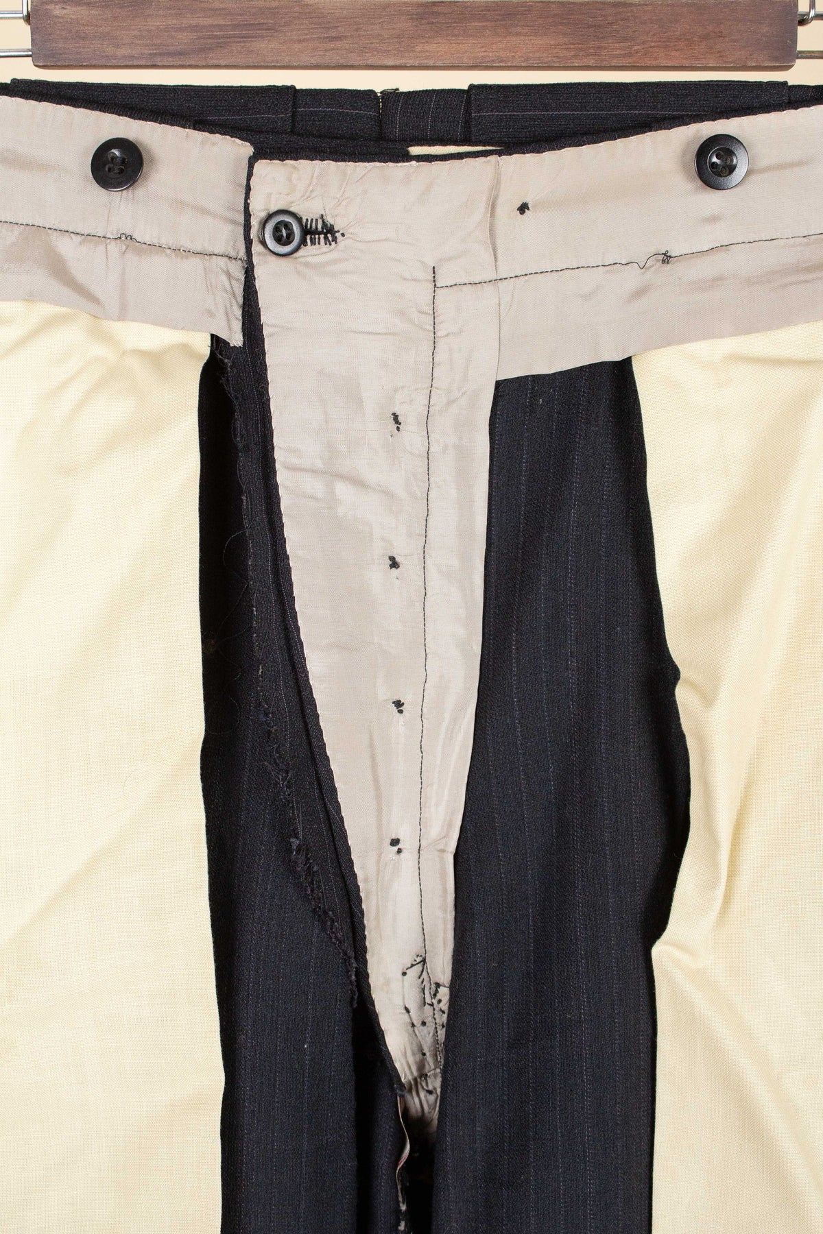 The trousers feature a single pleat and vertical front pockets. They have a button fly, and on the inside of the waistband there are buttons for braces. They also feature so-called tunnel loops, meaning that the belt runs partially hidden within a channel along the waistband, should a belt be worn. The waistband construction is somewhat unusual in terms of the direction of the cloth; this is not noticeable when the suit is worn and is more something one observes only upon close inspection.