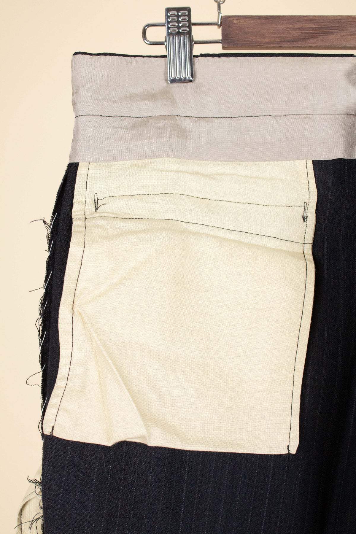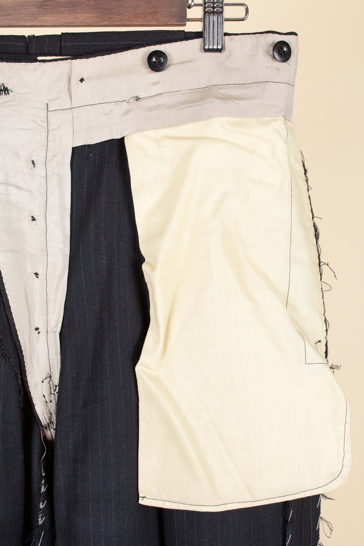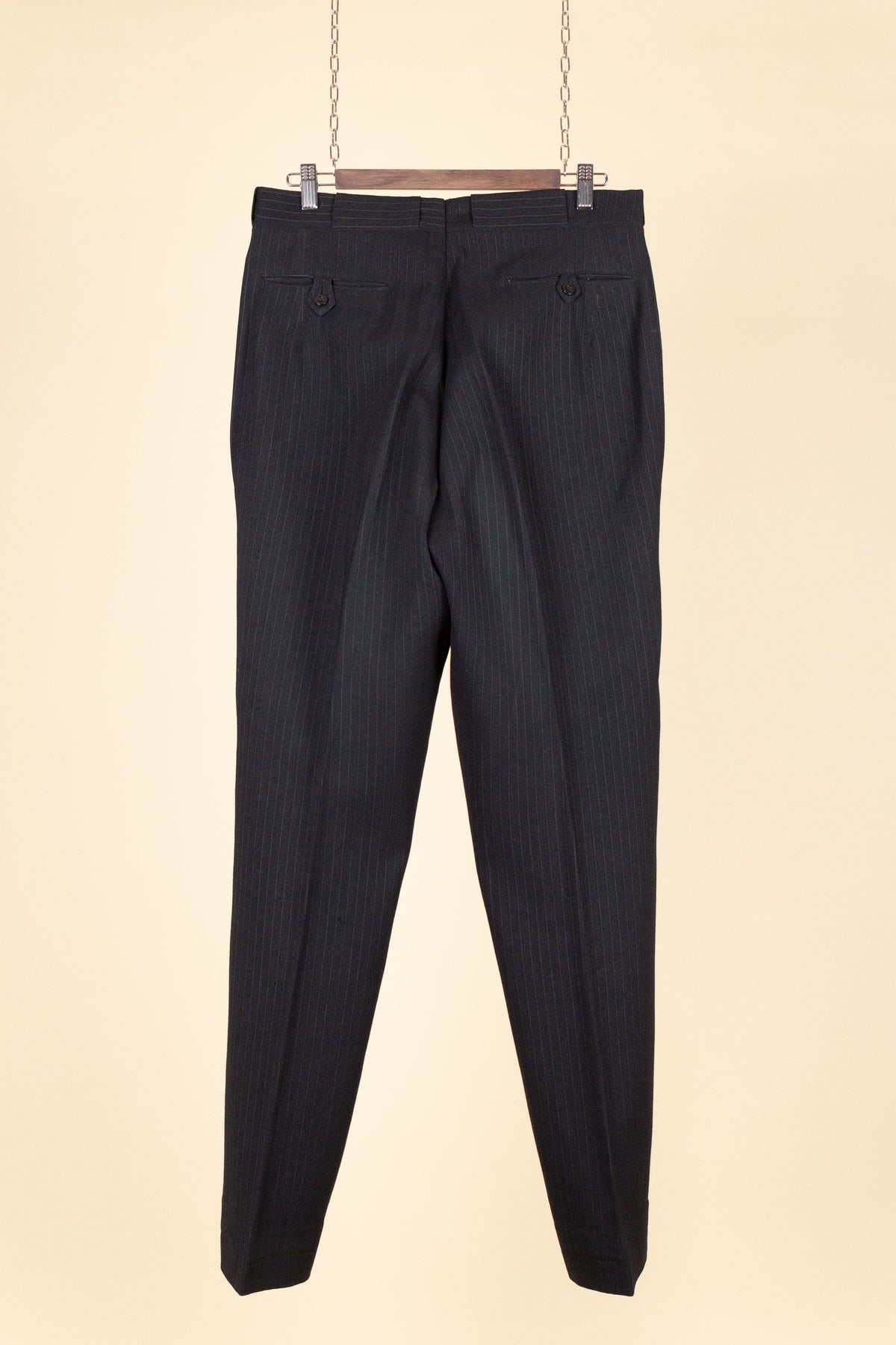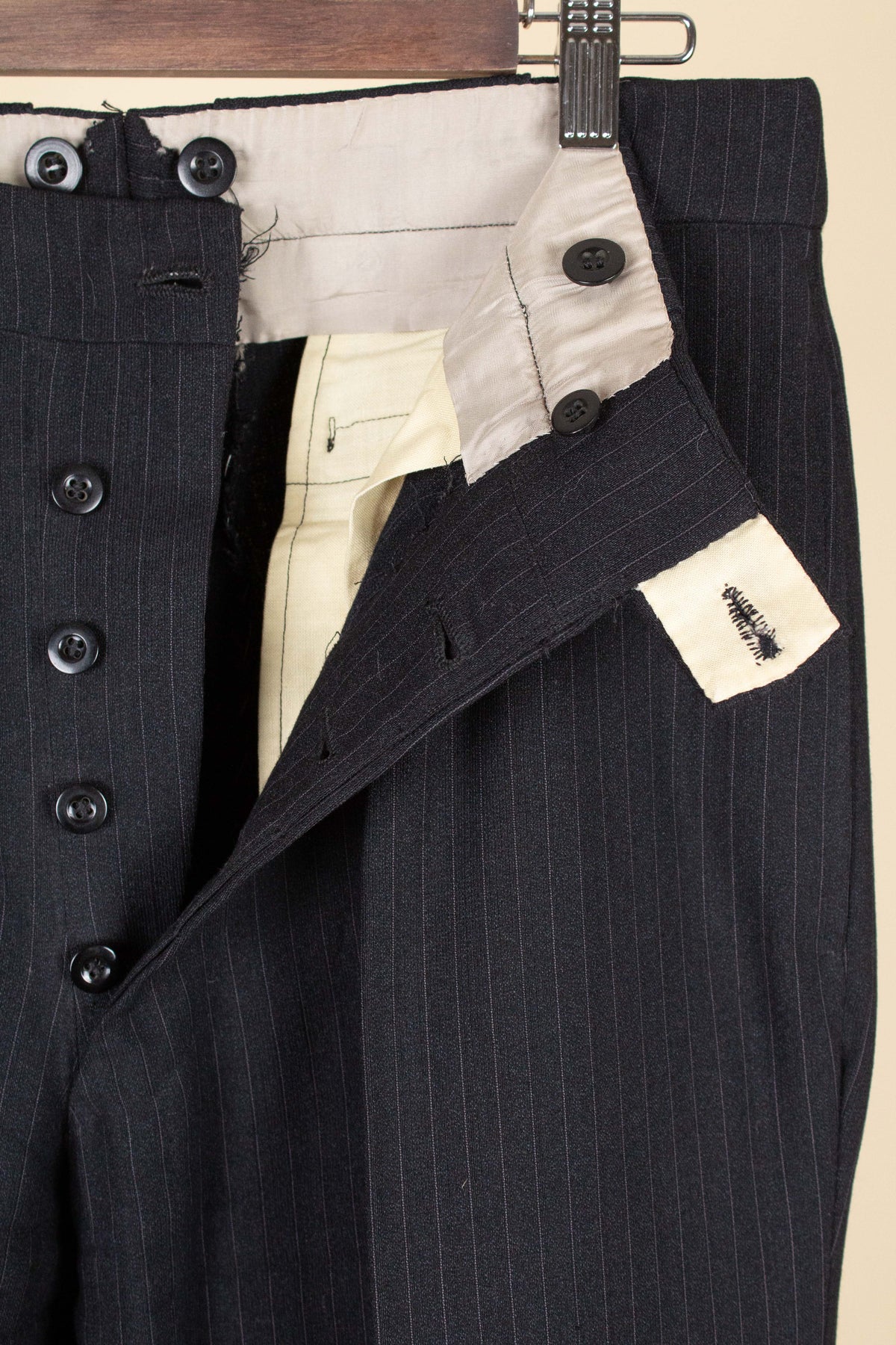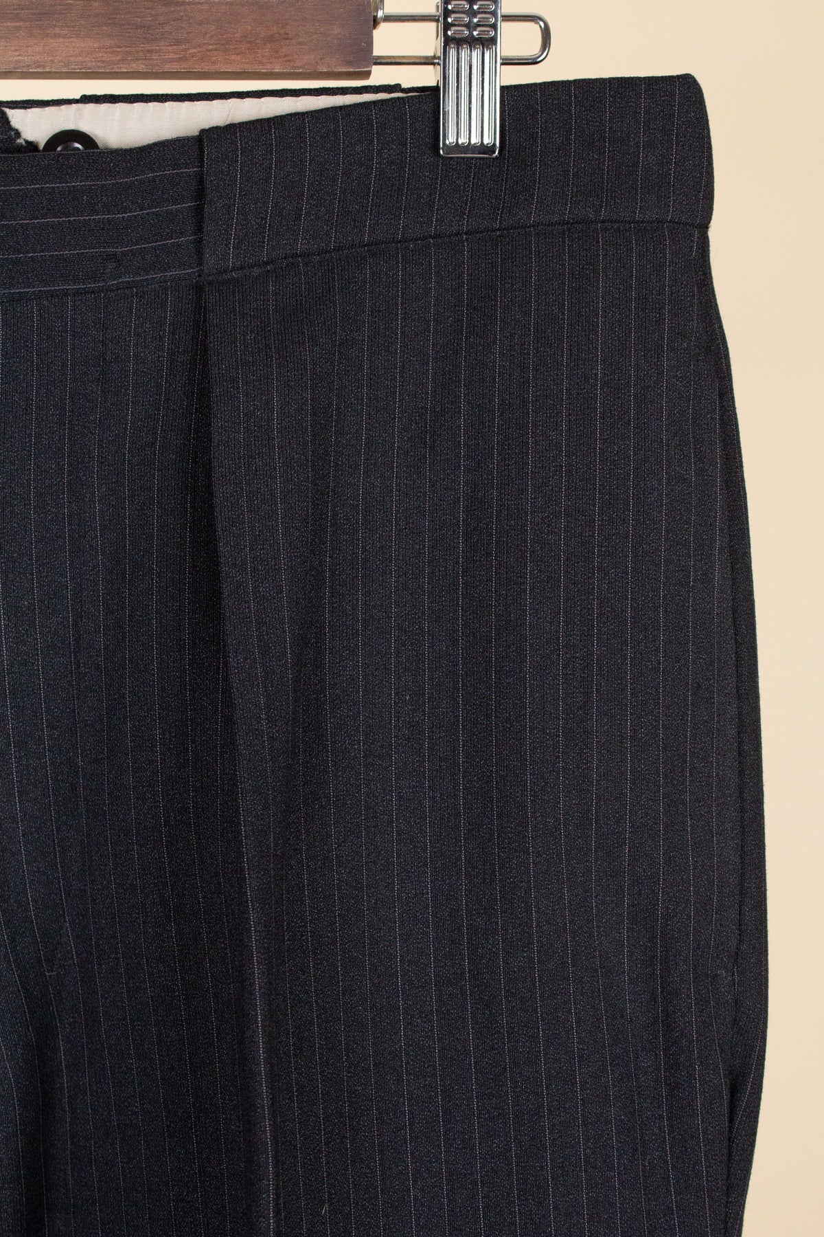 The trousers feature a single pleat and vertical front pockets. They have a button fly, and on the inside of the waistband there are buttons for braces. They also feature so-called tunnel loops, meaning that the belt runs partially hidden within a channel along the waistband, should a belt be worn. The waistband construction is somewhat unusual in terms of the direction of the cloth; this is not noticeable when the suit is worn and is more something one observes only upon close inspection.