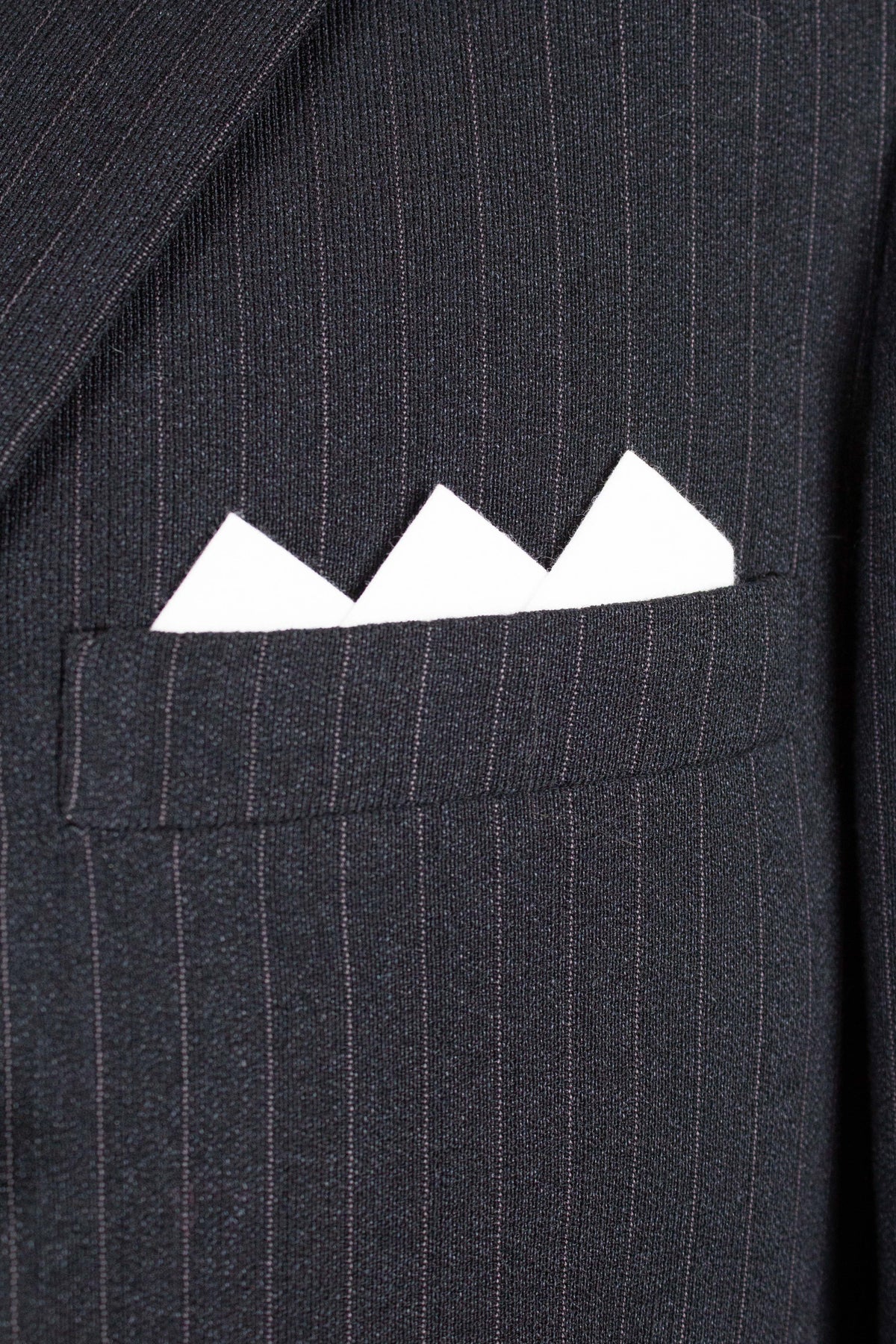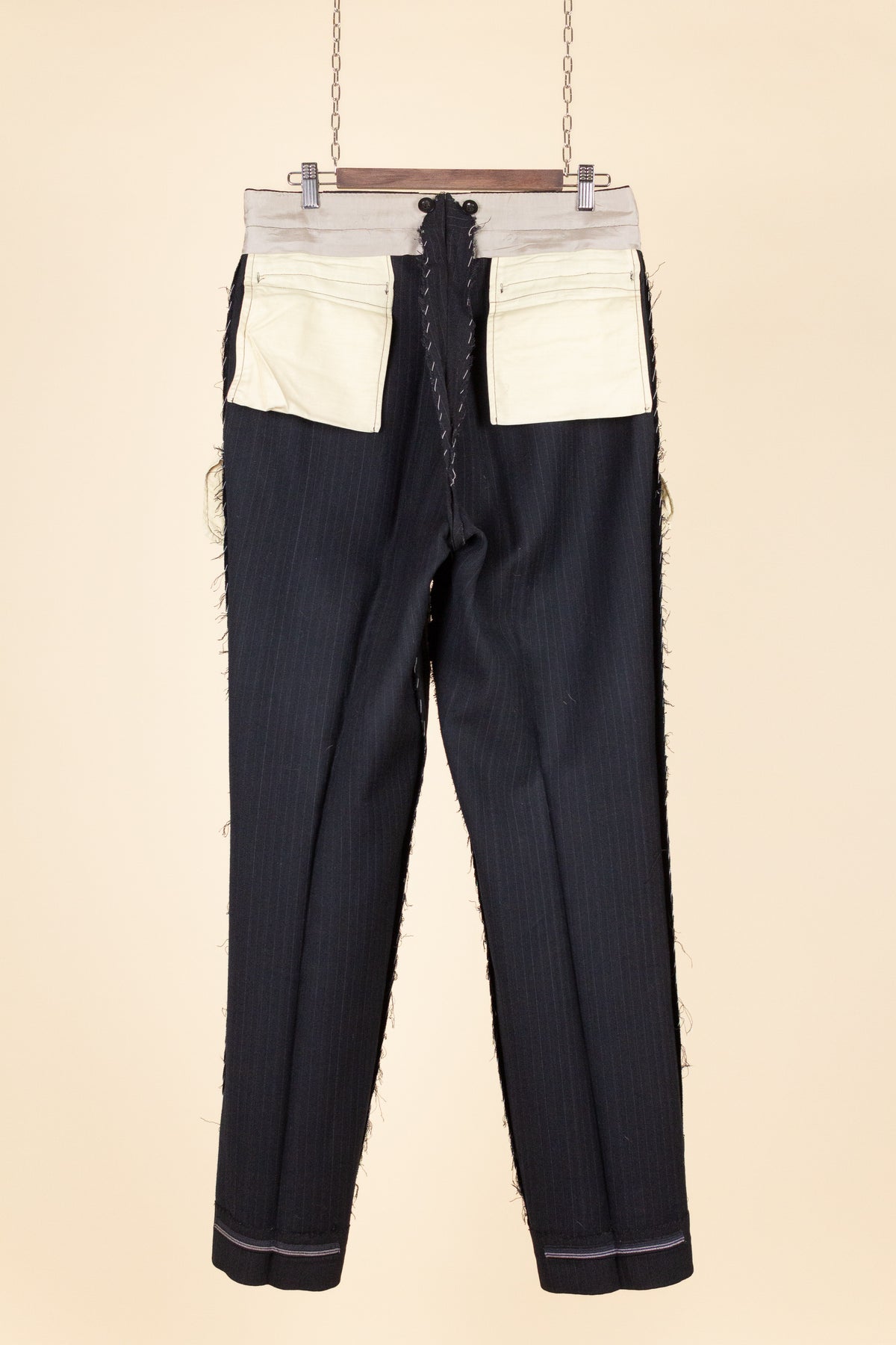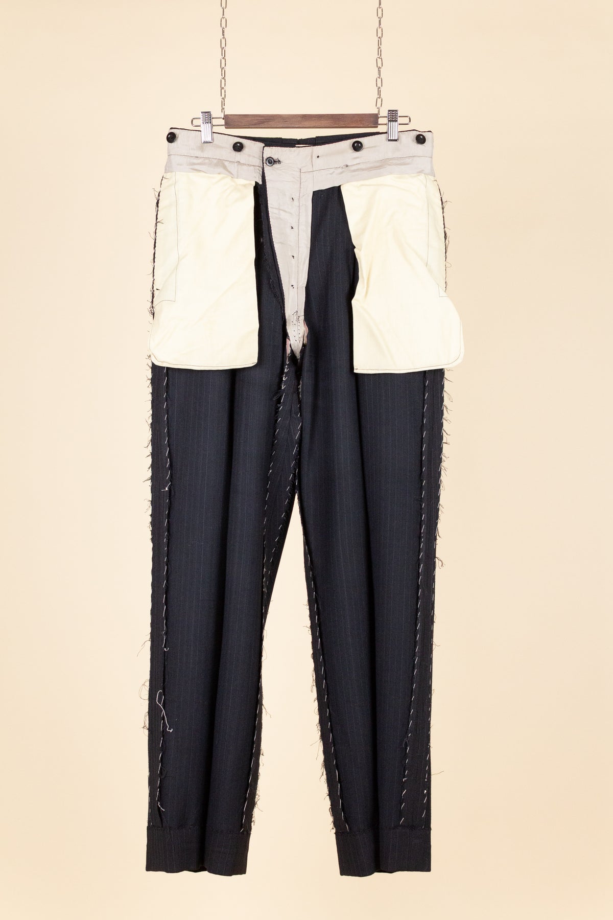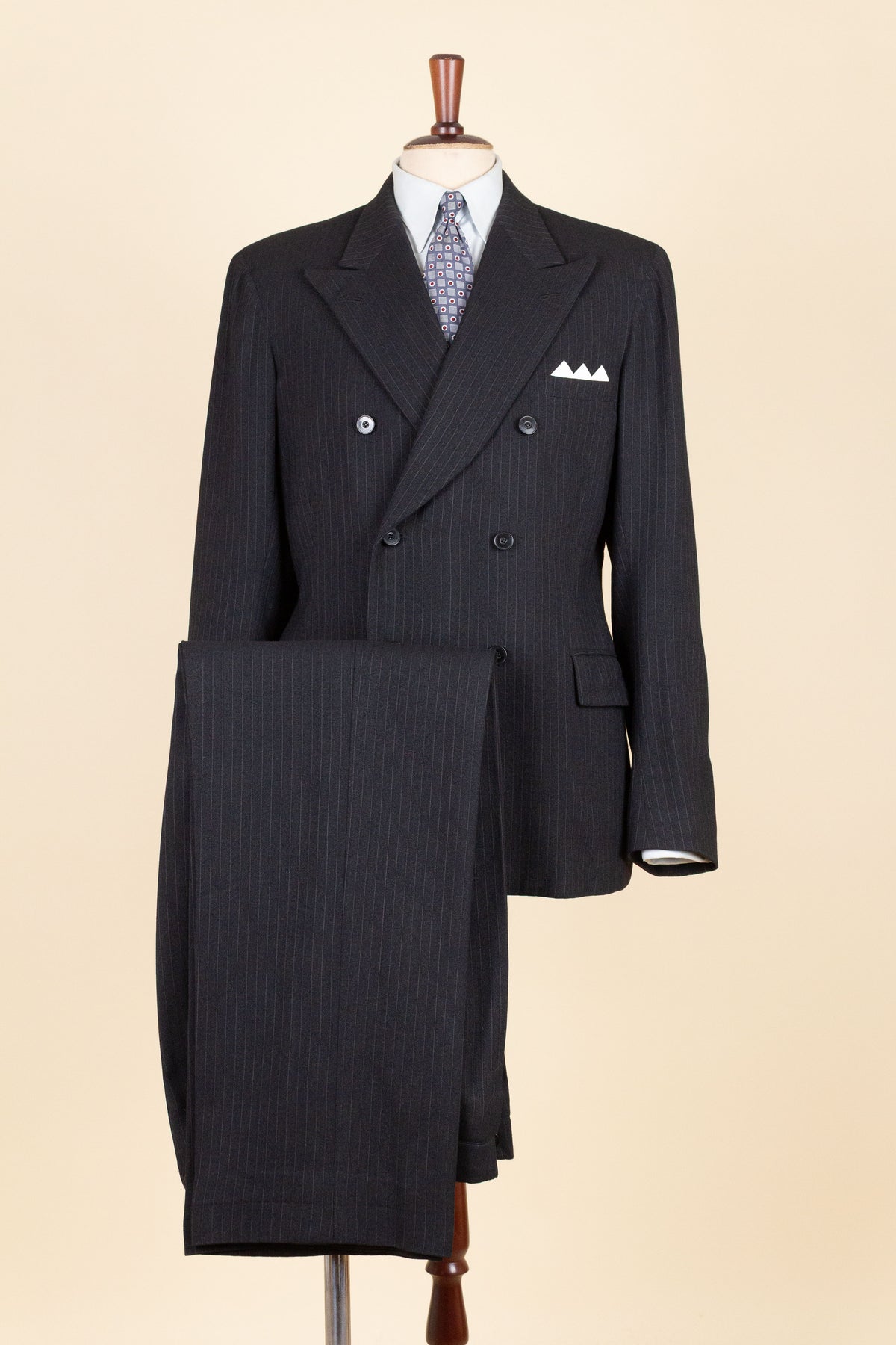 The trousers feature a single pleat and vertical front pockets. They have a button fly, and on the inside of the waistband there are buttons for braces. They also feature so-called tunnel loops, meaning that the belt runs partially hidden within a channel along the waistband, should a belt be worn. The waistband construction is somewhat unusual in terms of the direction of the cloth; this is not noticeable when the suit is worn and is more something one observes only upon close inspection.
