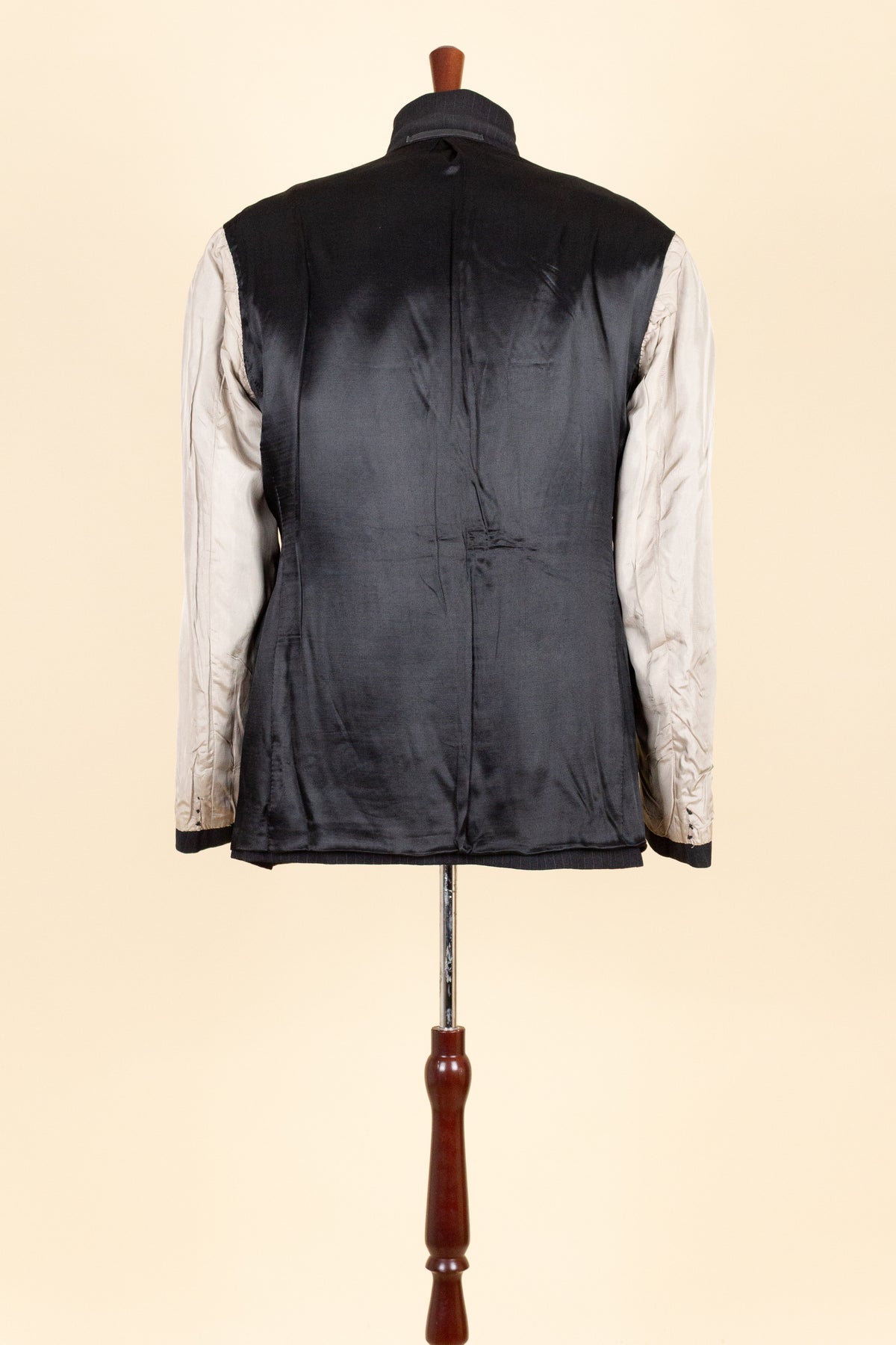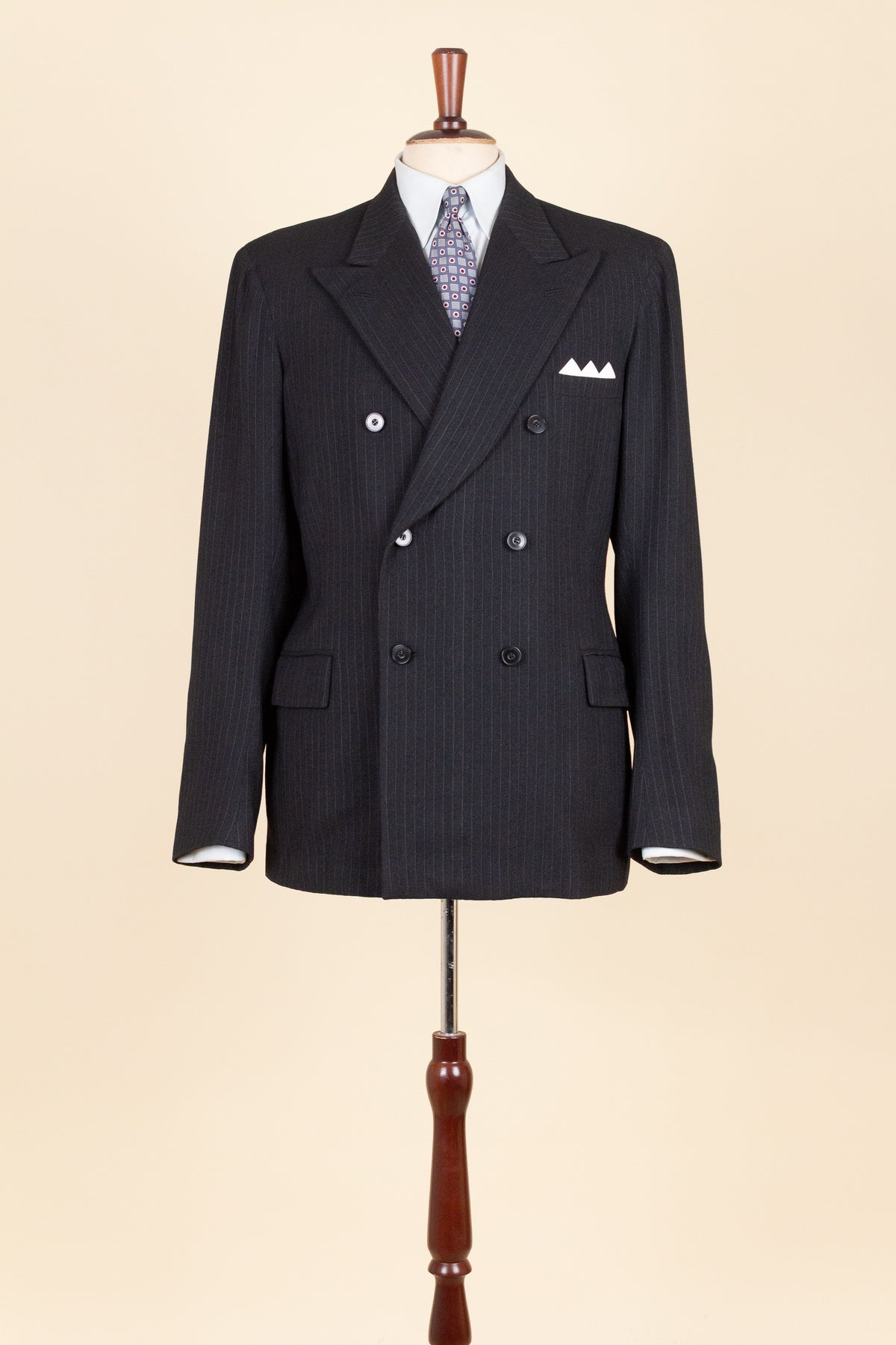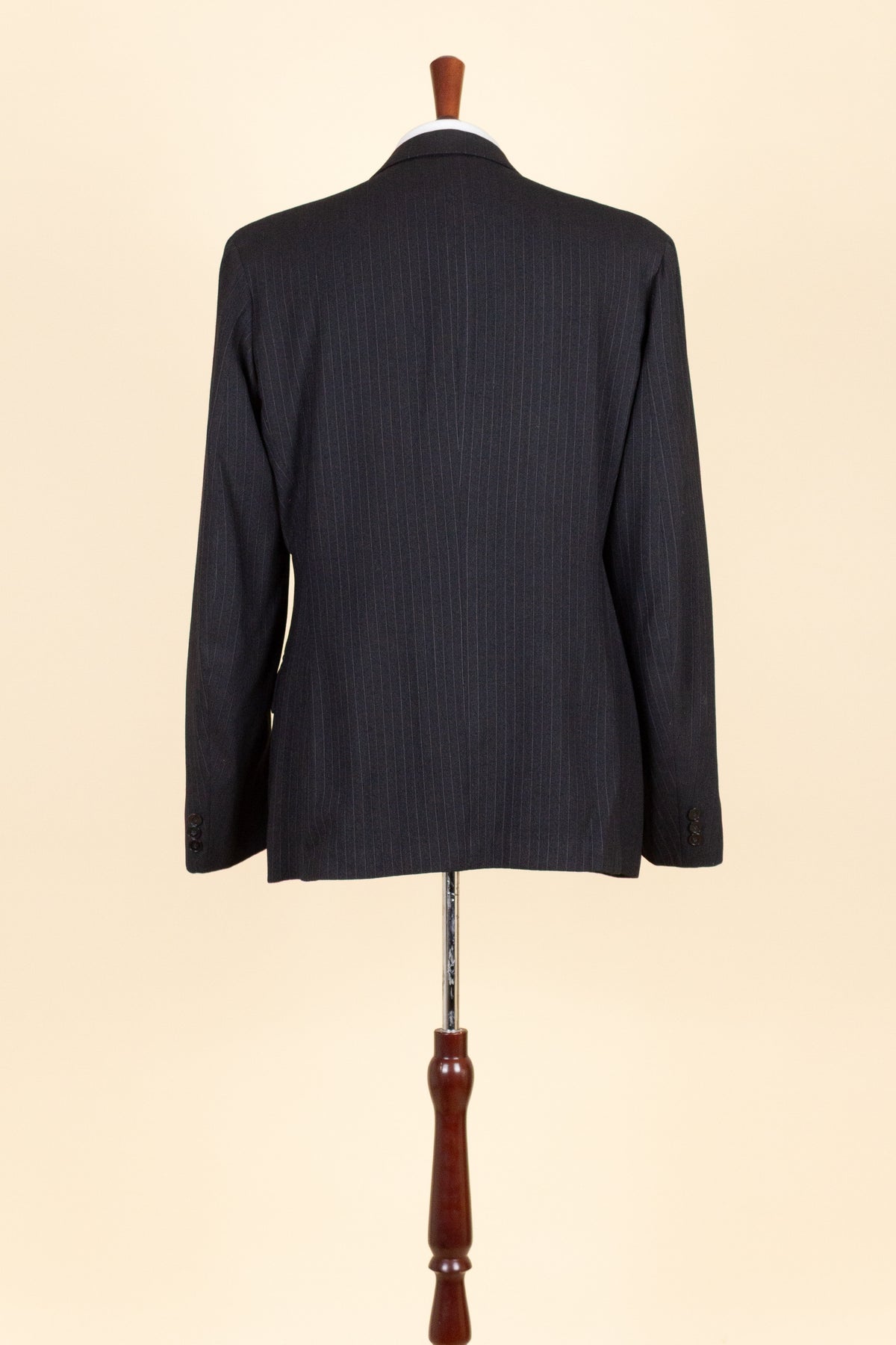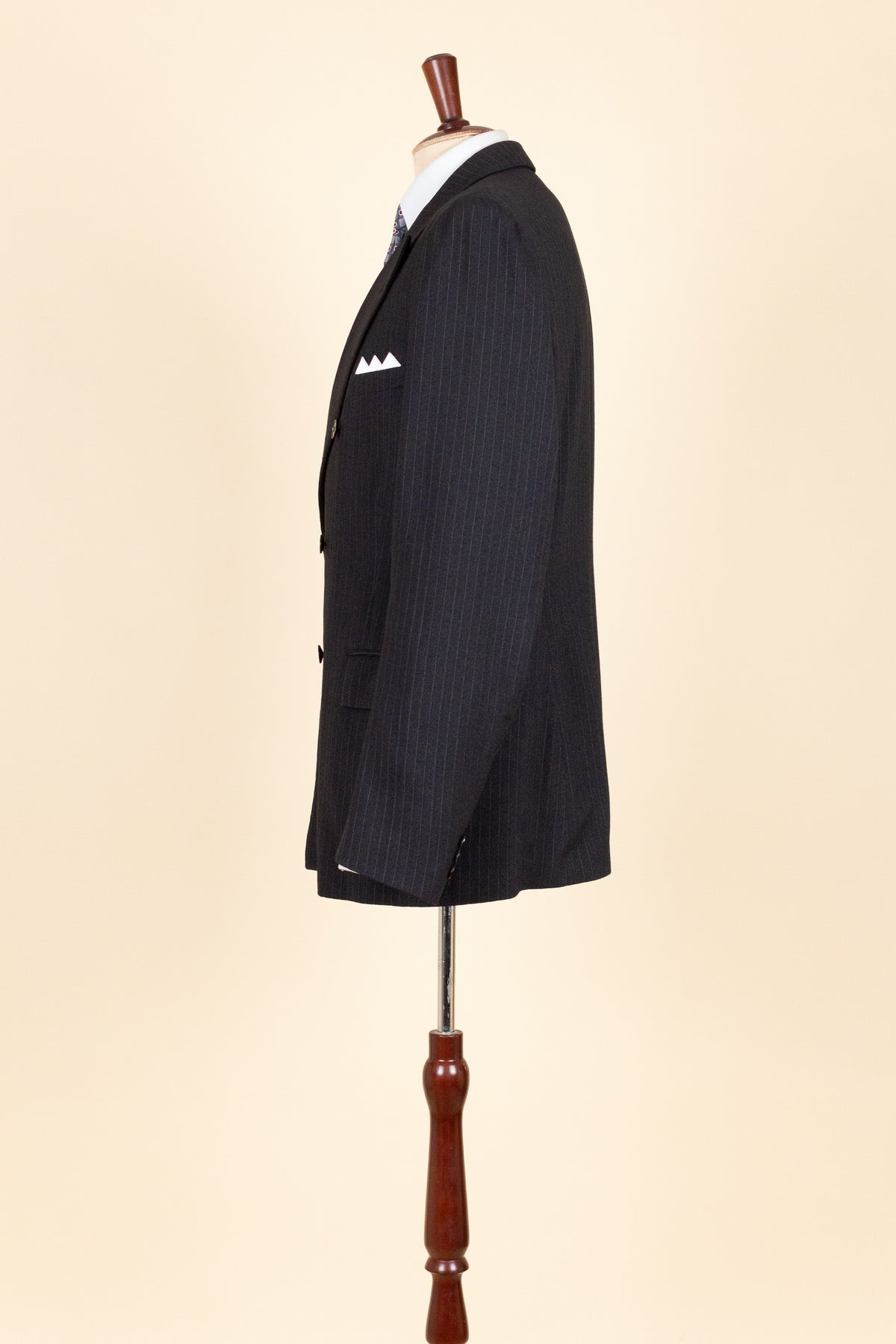 The jacket is double-breasted with three rows of buttons, of which two are in use. It has horizontal front pockets with flaps and a buttonhole in each lapel. The back is straight and closed, with no vent. Internally, it is fully lined and has one inner pocket on the right-hand side. The lining is entirely hand-stitched.