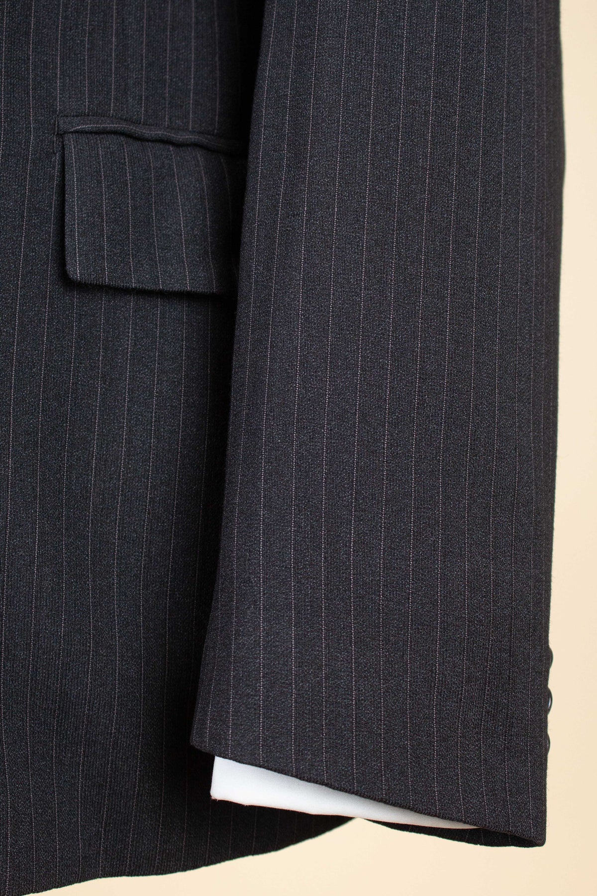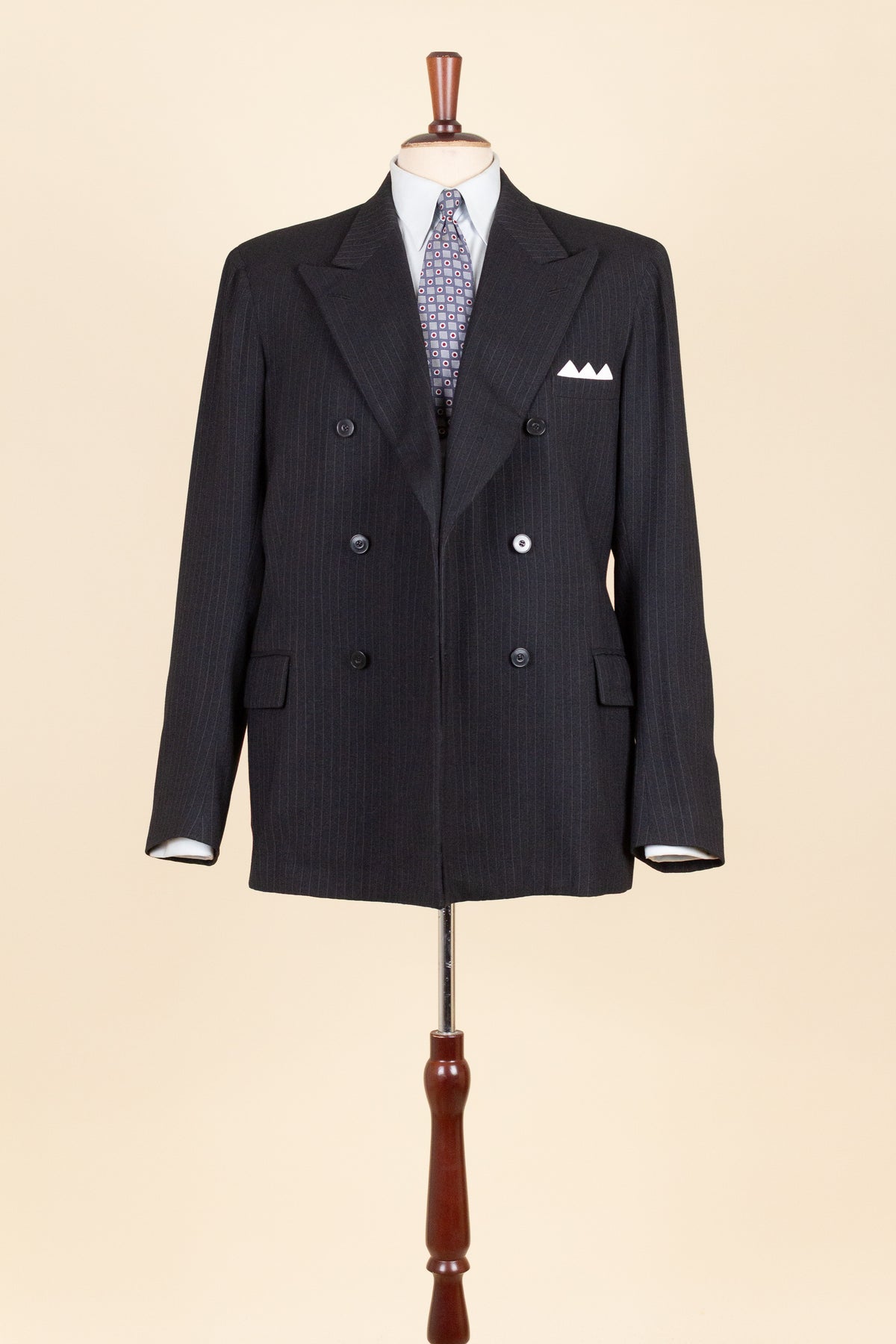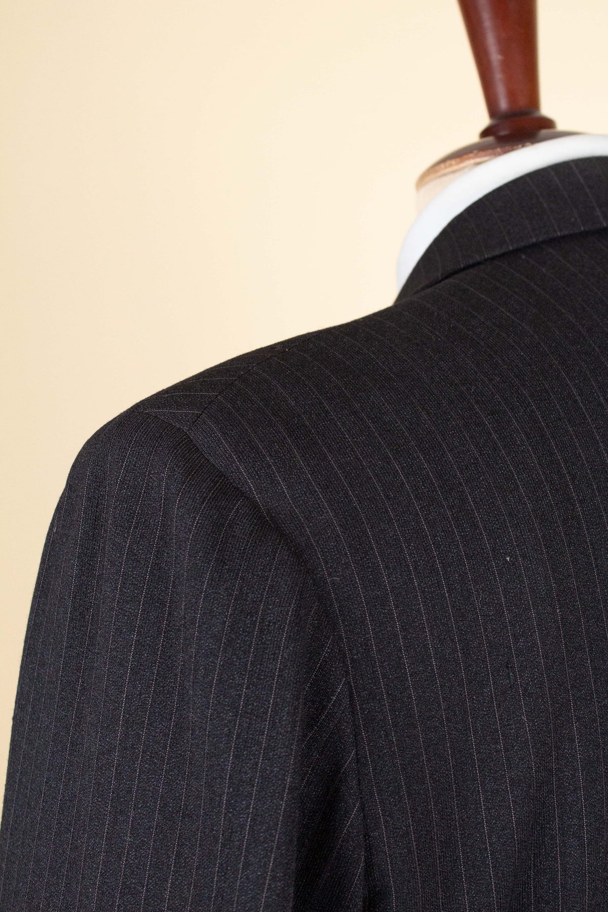 The jacket is double-breasted with three rows of buttons, of which two are in use. It has horizontal front pockets with flaps and a buttonhole in each lapel. The back is straight and closed, with no vent. Internally, it is fully lined and has one inner pocket on the right-hand side. The lining is entirely hand-stitched.