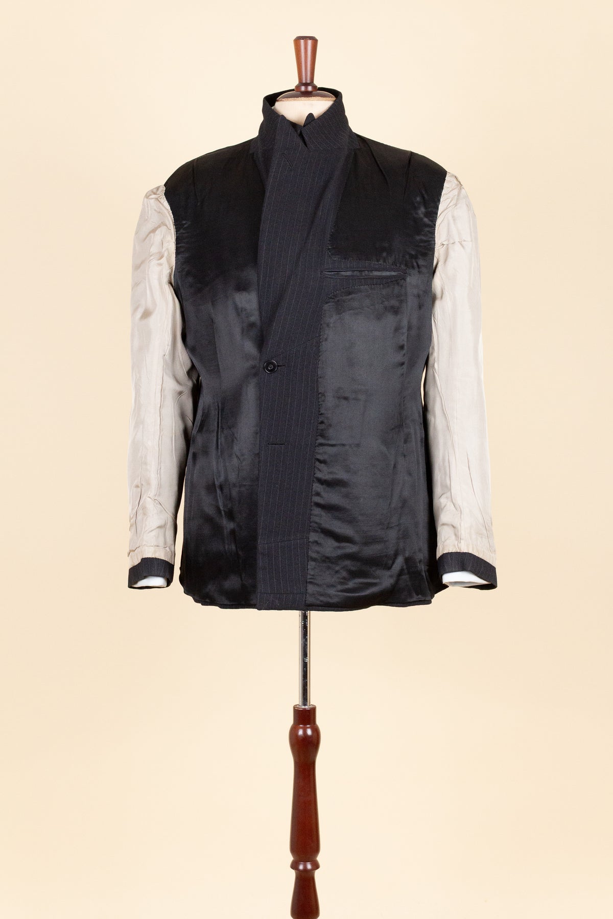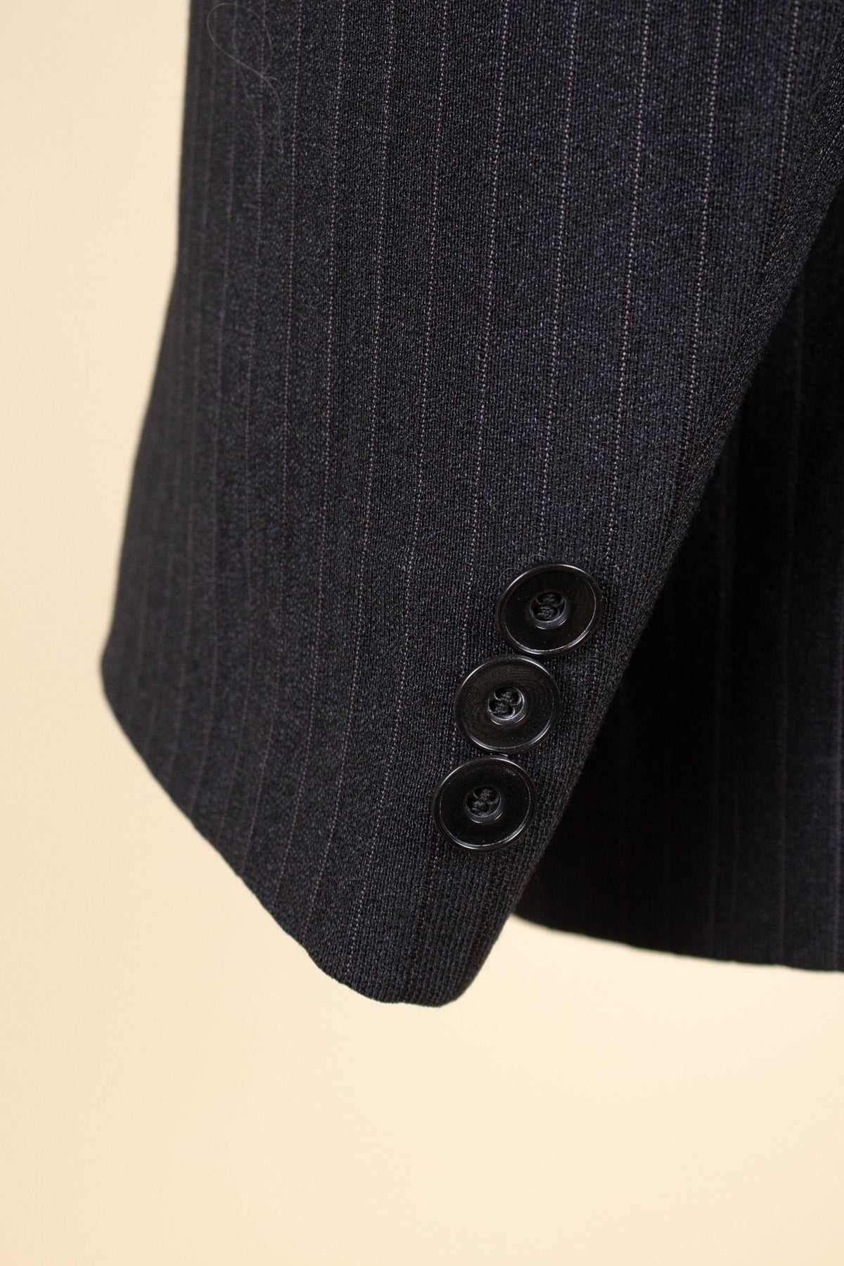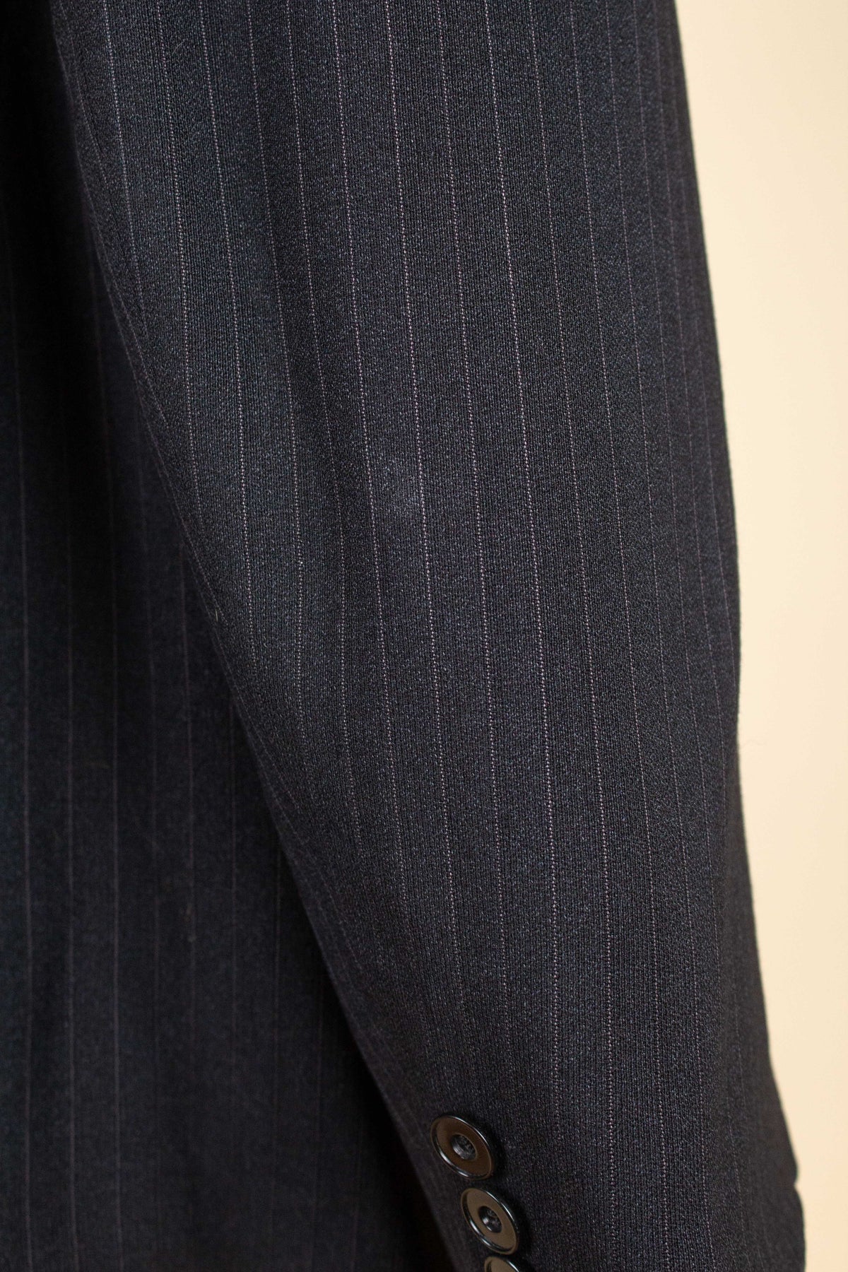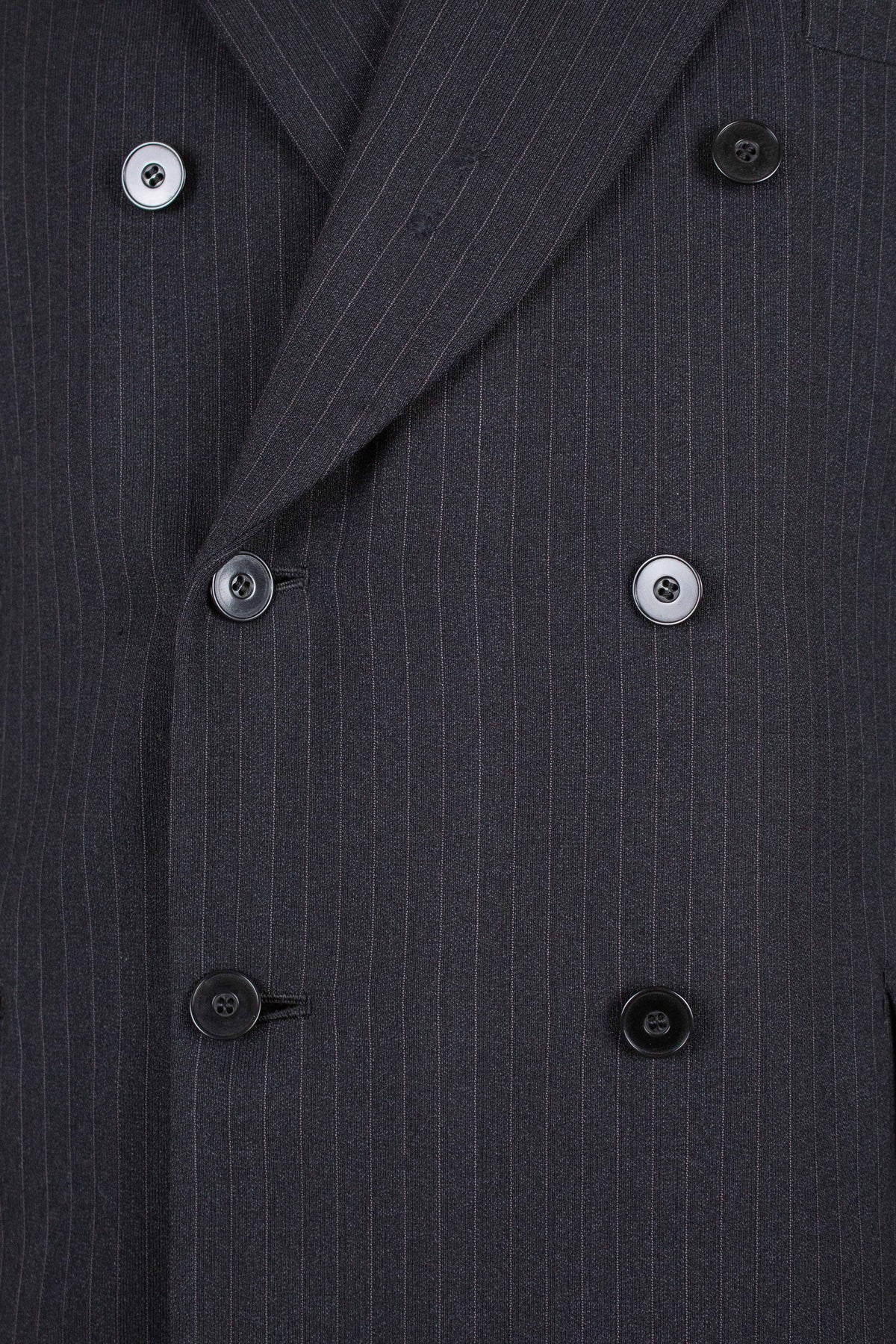 The jacket is double-breasted with three rows of buttons, of which two are in use. It has horizontal front pockets with flaps and a buttonhole in each lapel. The back is straight and closed, with no vent. Internally, it is fully lined and has one inner pocket on the right-hand side. The lining is entirely hand-stitched.