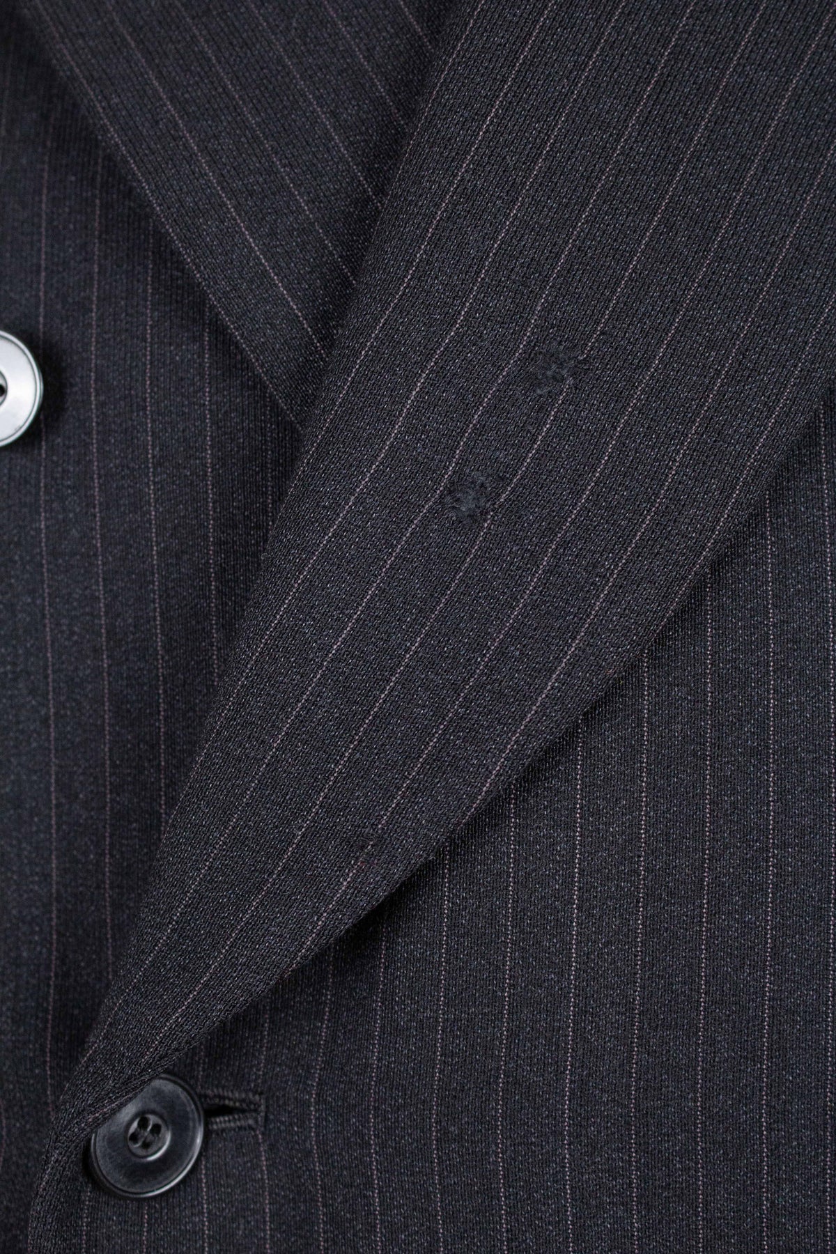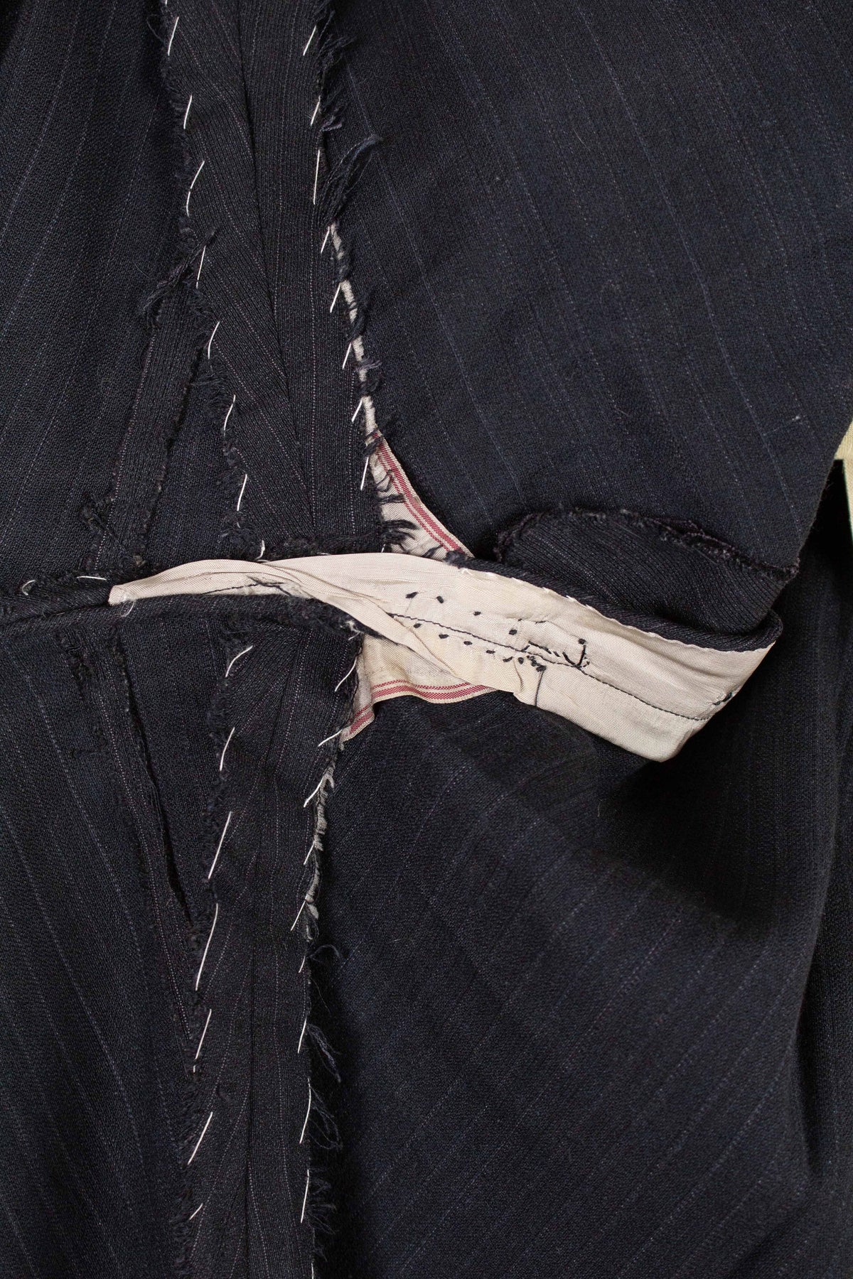 This suit has no labels at all, but it is still possible to draw certain conclusions from examining it. It is, by all appearances, of Swedish origin and was most likely made sometime during the 1940s, or possibly a few years later. It is tailor-made. It is made from a dark grey cloth with a light grey chalk-stripe pattern.